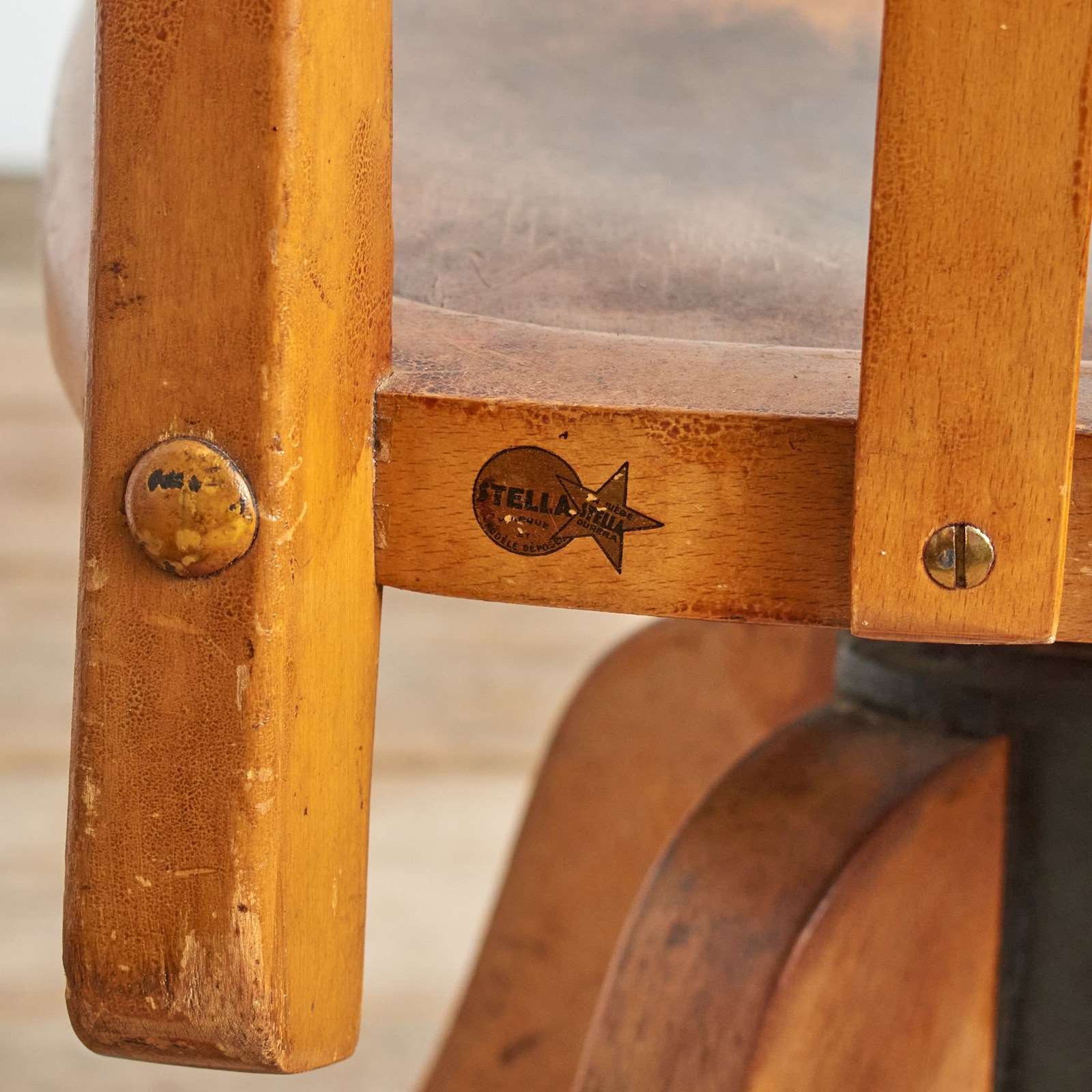 The original Stella manufacturing label is retained on the back of the chair.