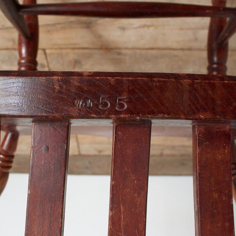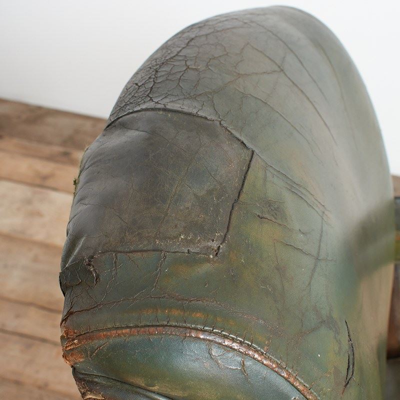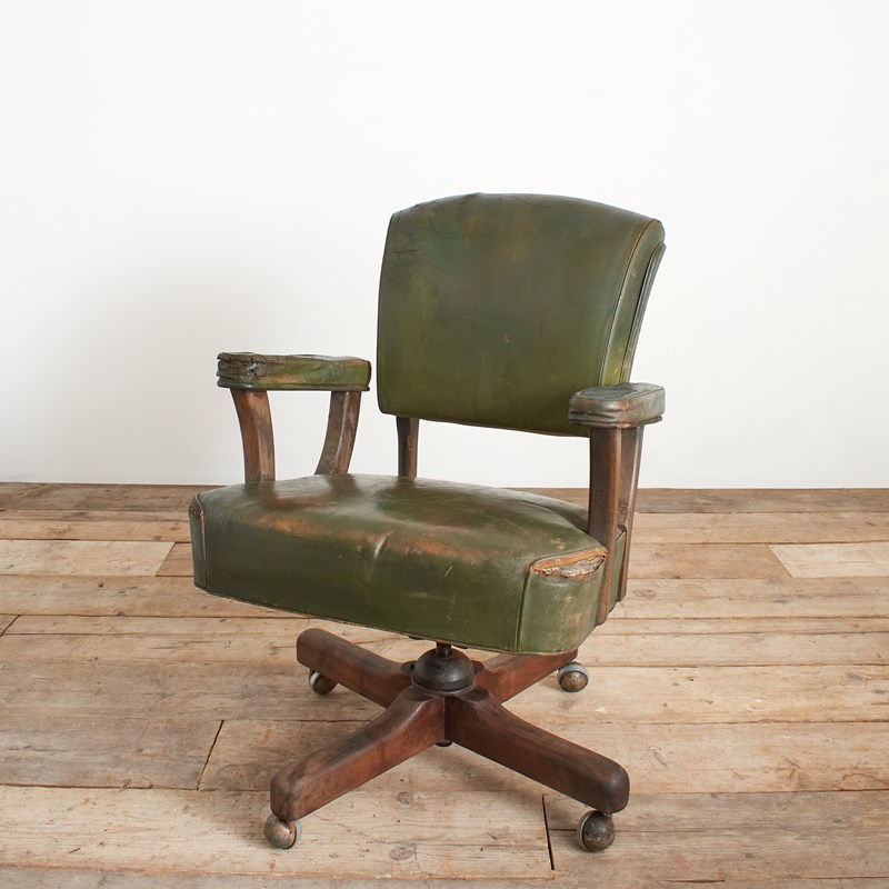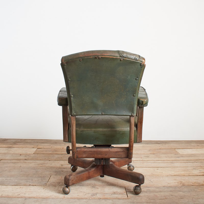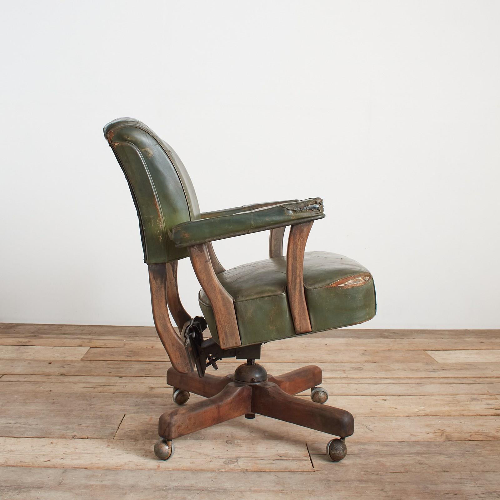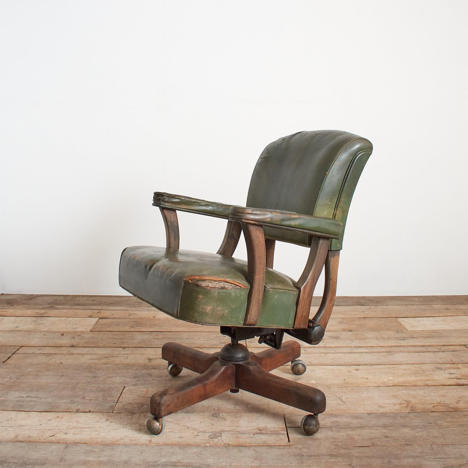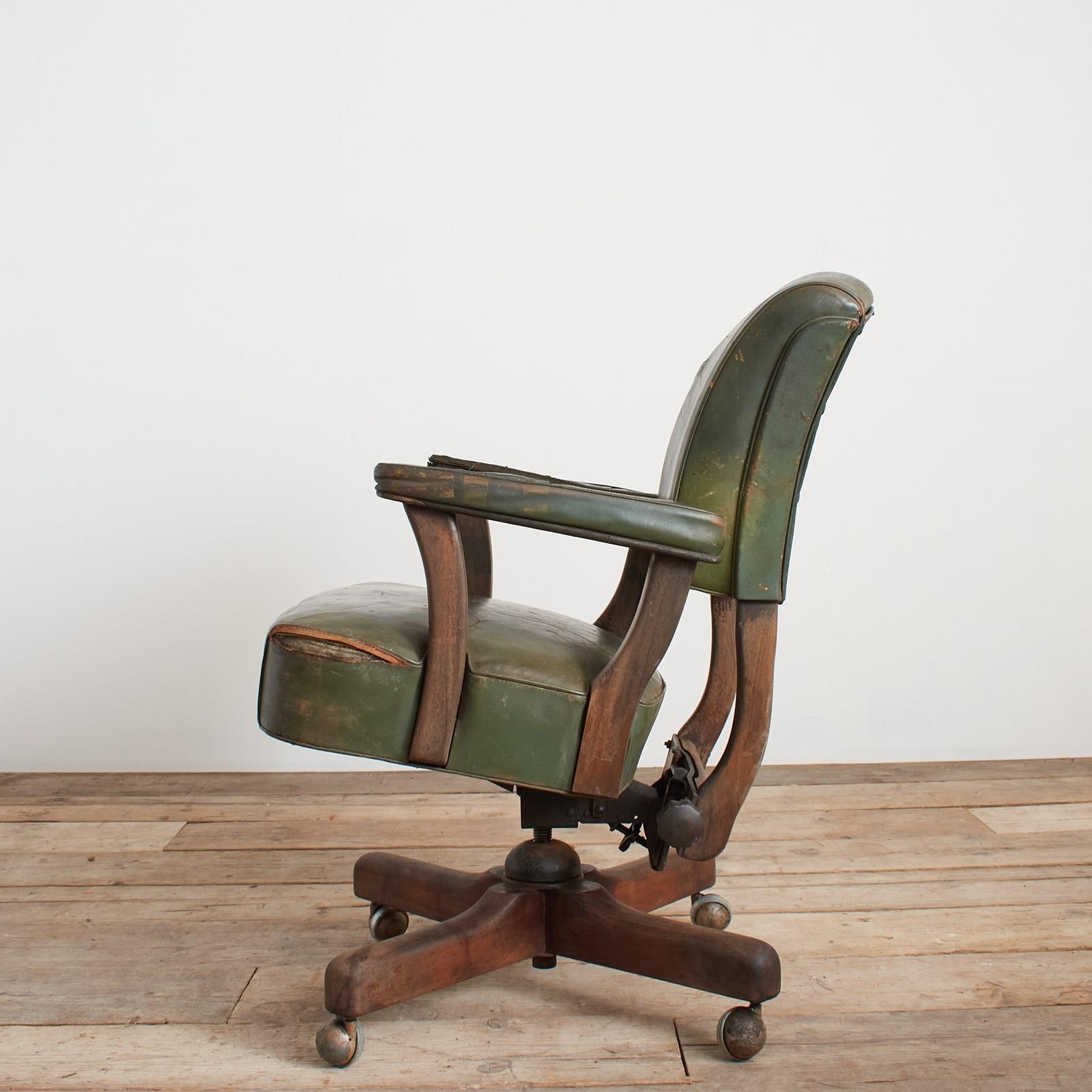 An original office desk chair salvaged from a US airforce base in Hampshire. This is a wide seated and solid chair with walnut wooden components and green leatherette finish. The seat and back rest both adjustable in height and position. The seat is in a reclined position, then when you sit in the chair it levels to the desired posture, again when standing up from the chair it returns to the original position almost assisting you.
