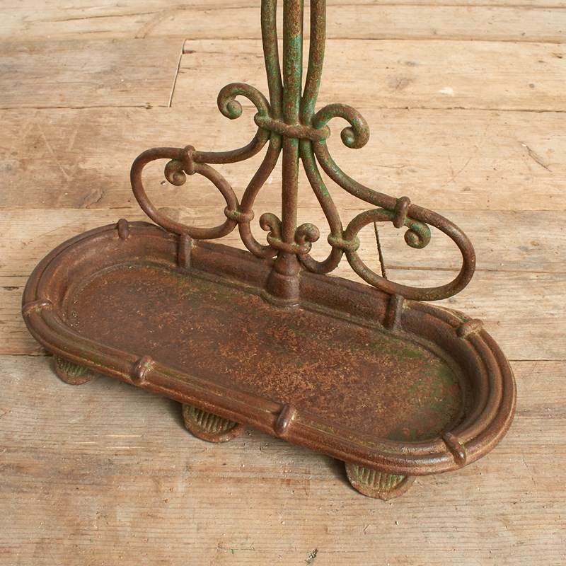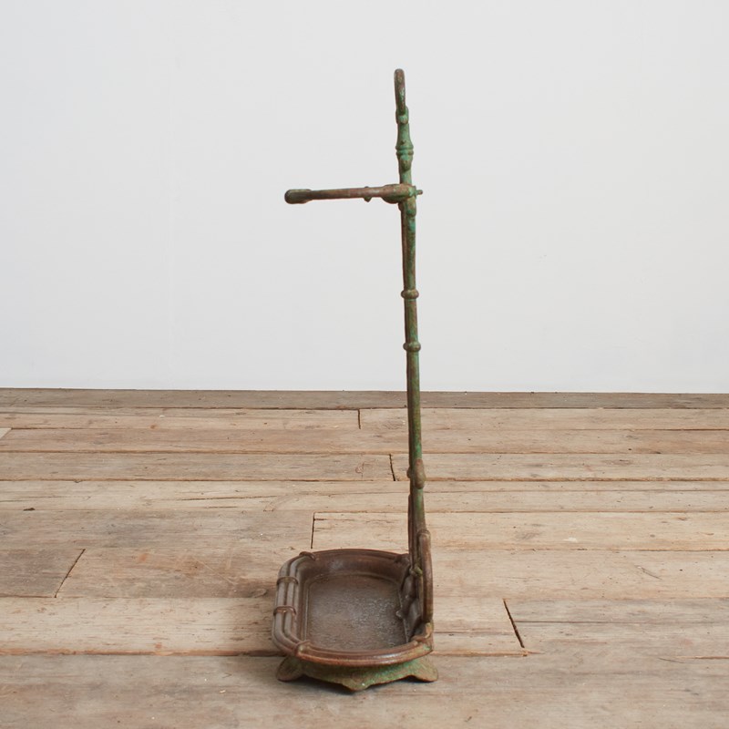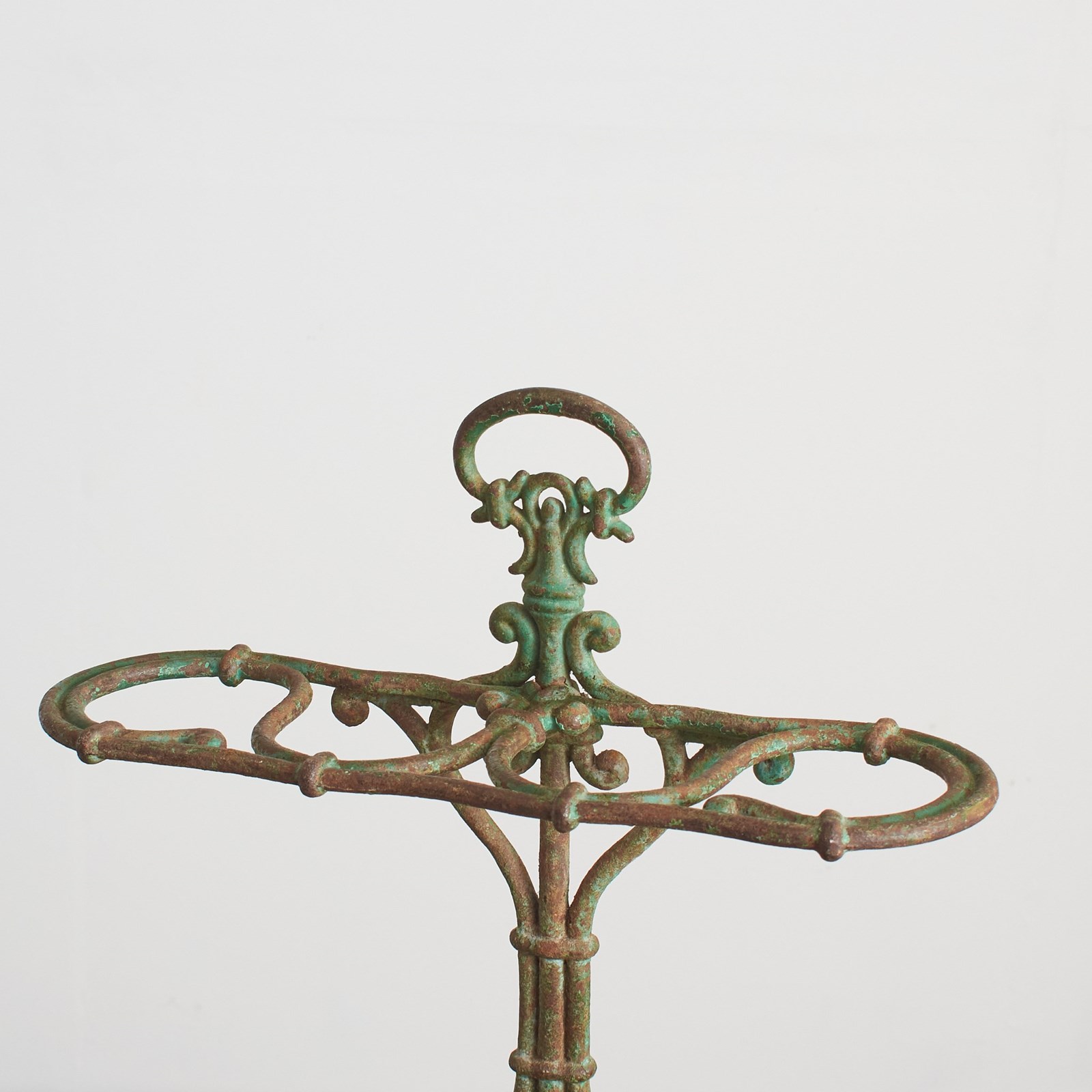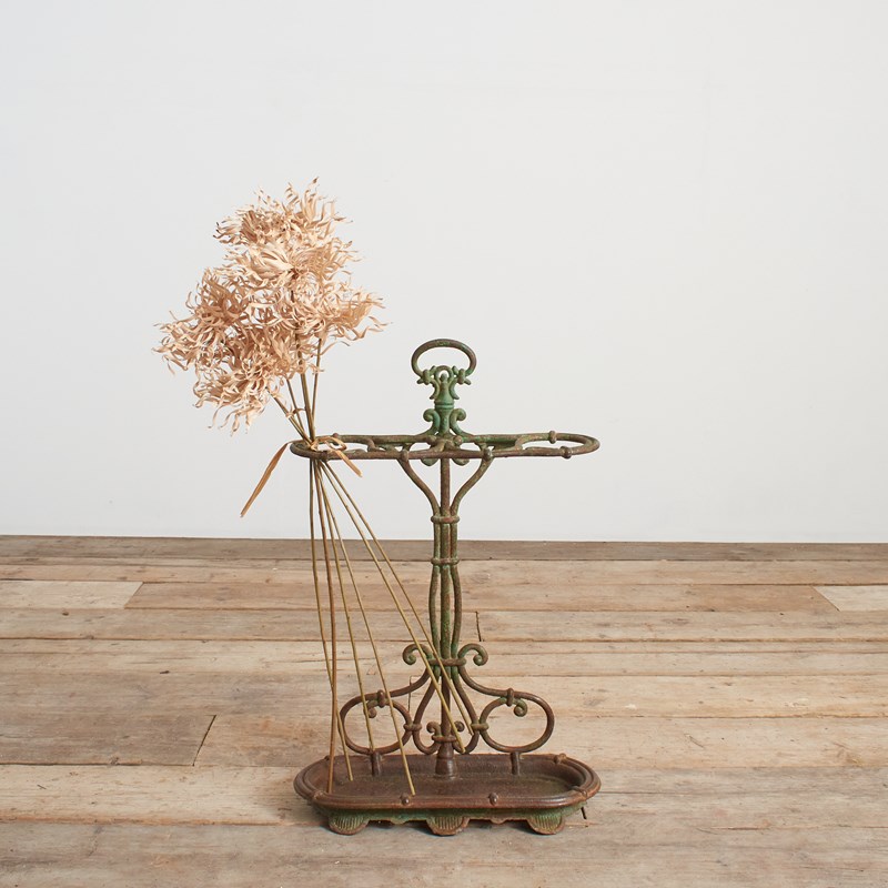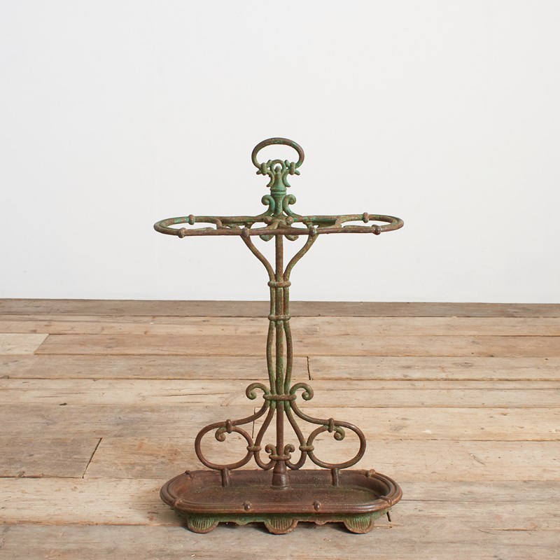 A stunning decorative cast iron umbrella and stick stand with four curved divisions at the top which will hold multiple umbrellas/sticks and a drip tray at the base. Its free standing design makes it very practical for in a hallway or boot room. It has a lovely patina with some of the original green paint showing through.