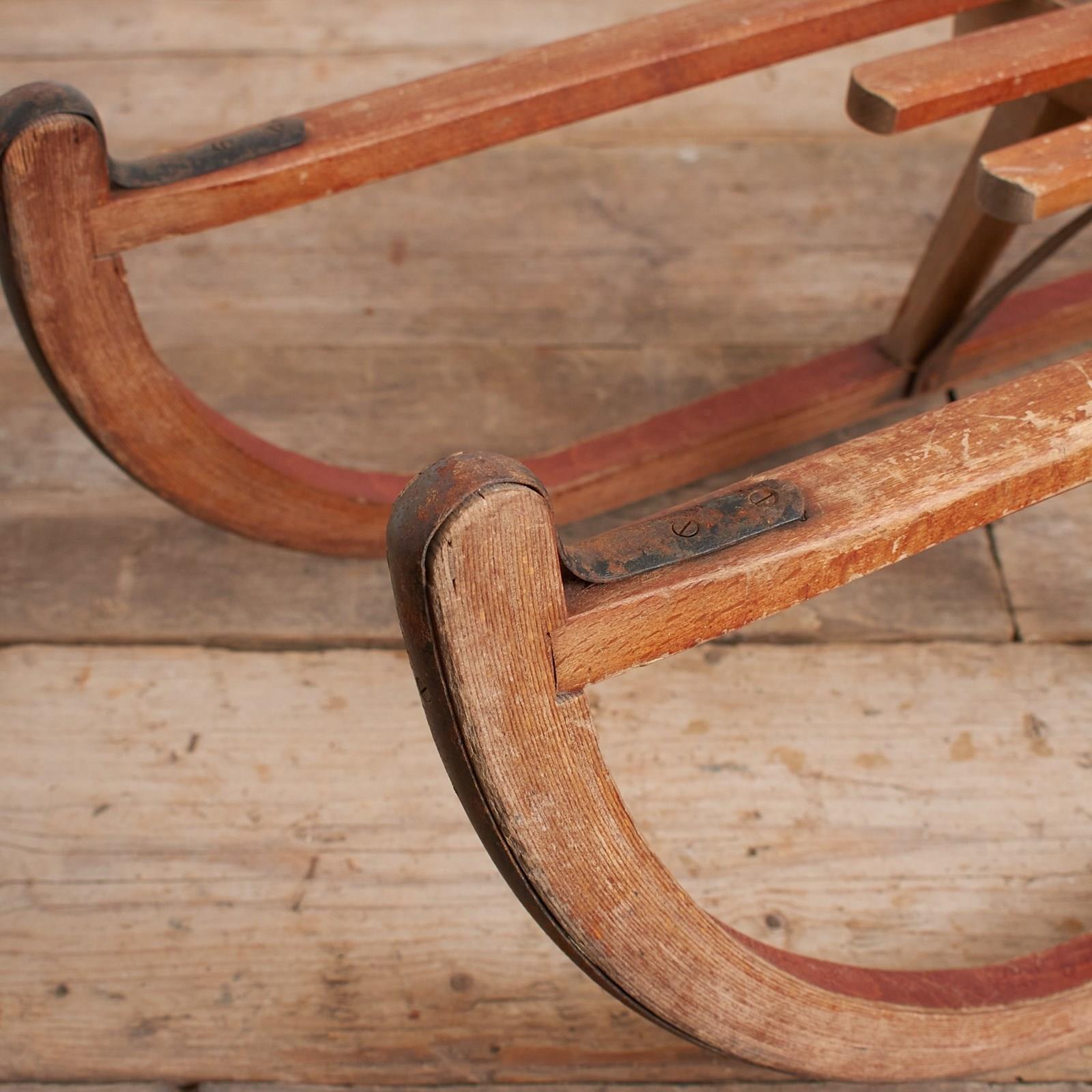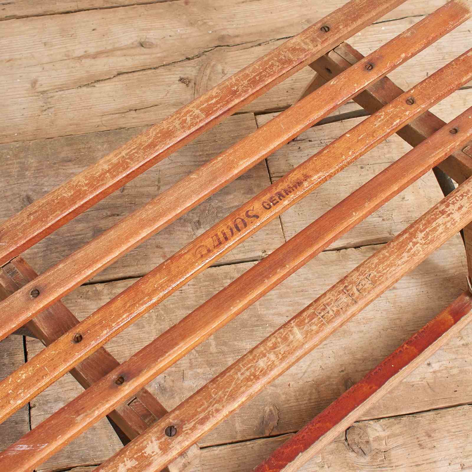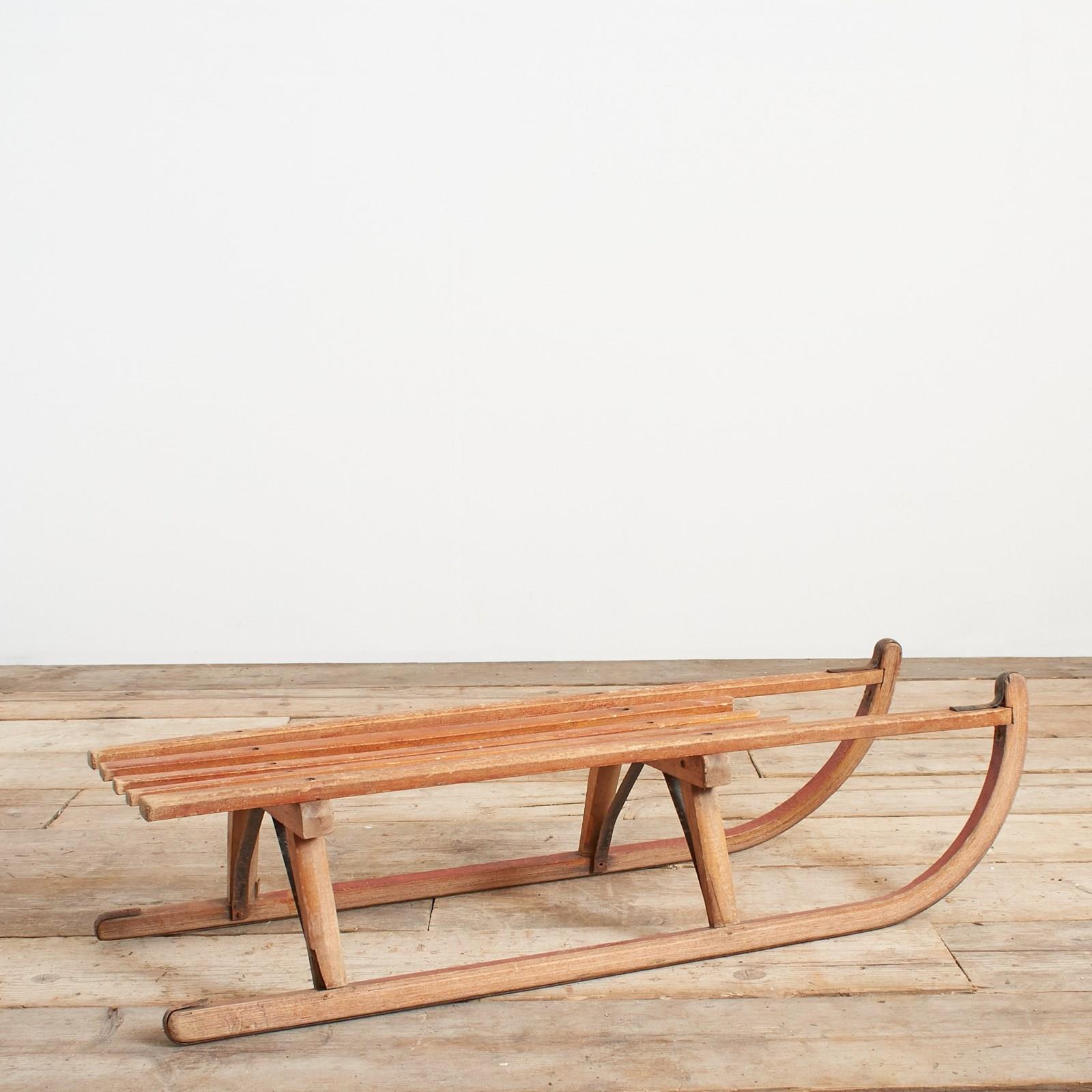 A wooden vintage sledge. A typical ‘Davos’ style vintage sledge. The sledge has a slatted wooden seat with upright support struts and retains its original metal runners.