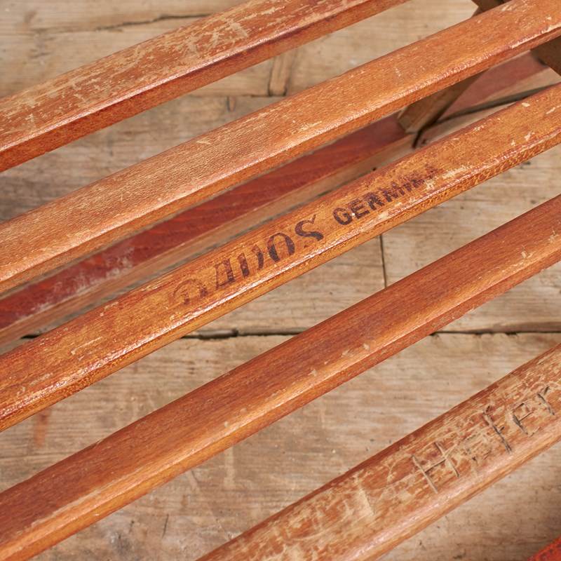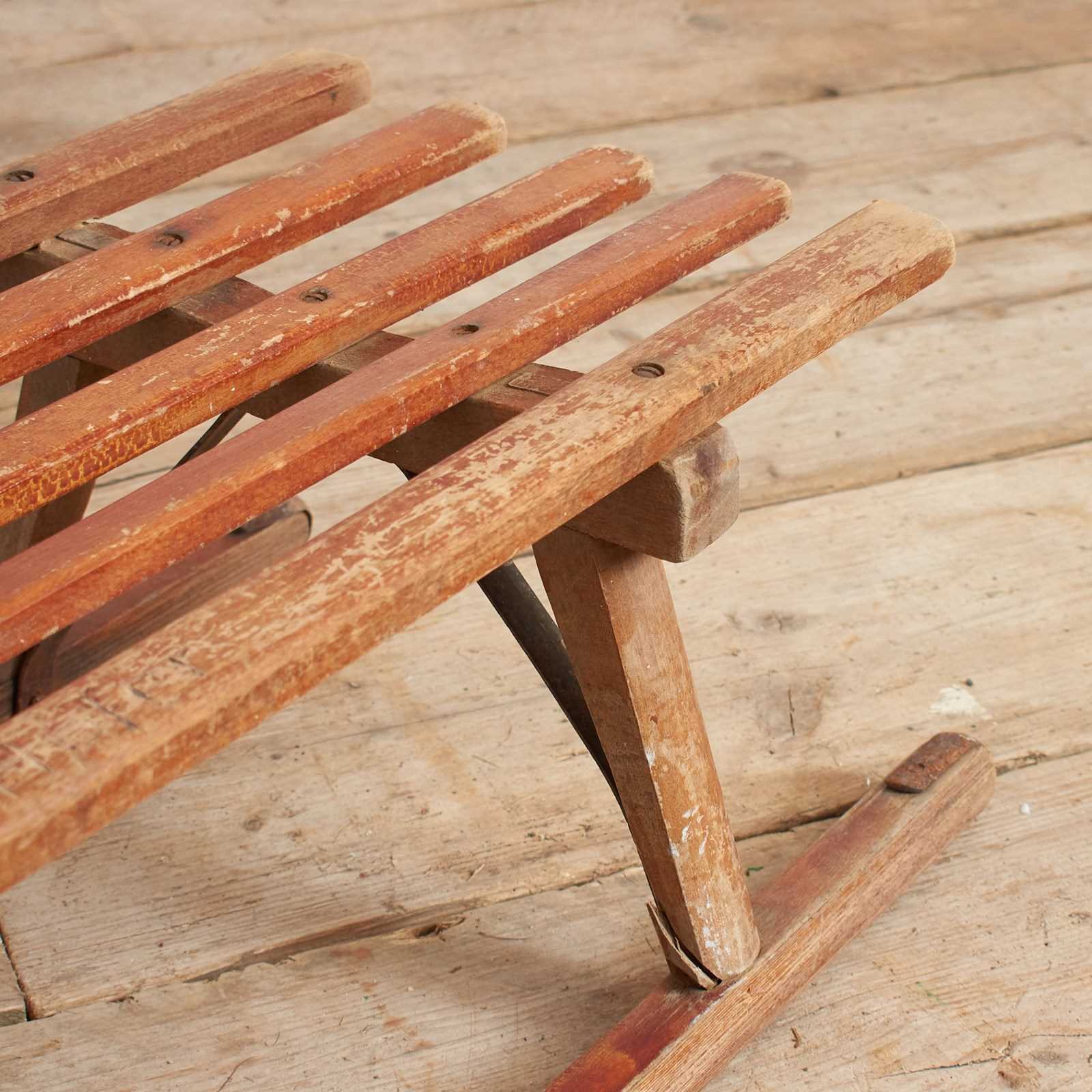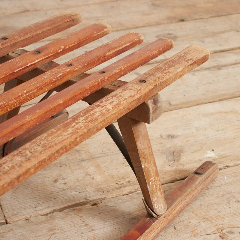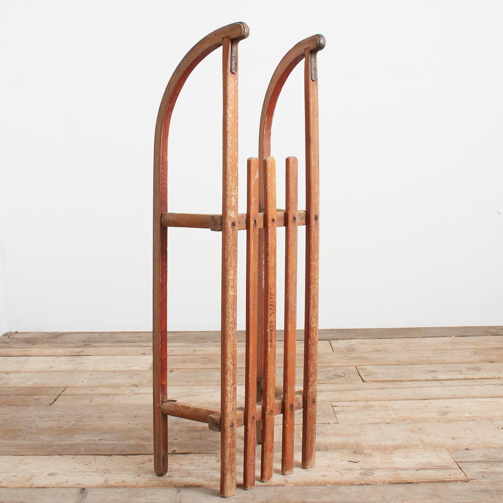 A wooden vintage sledge. A typical ‘Davos’ style vintage sledge. The sledge has a slatted wooden seat with upright support struts and retains its original metal runners.