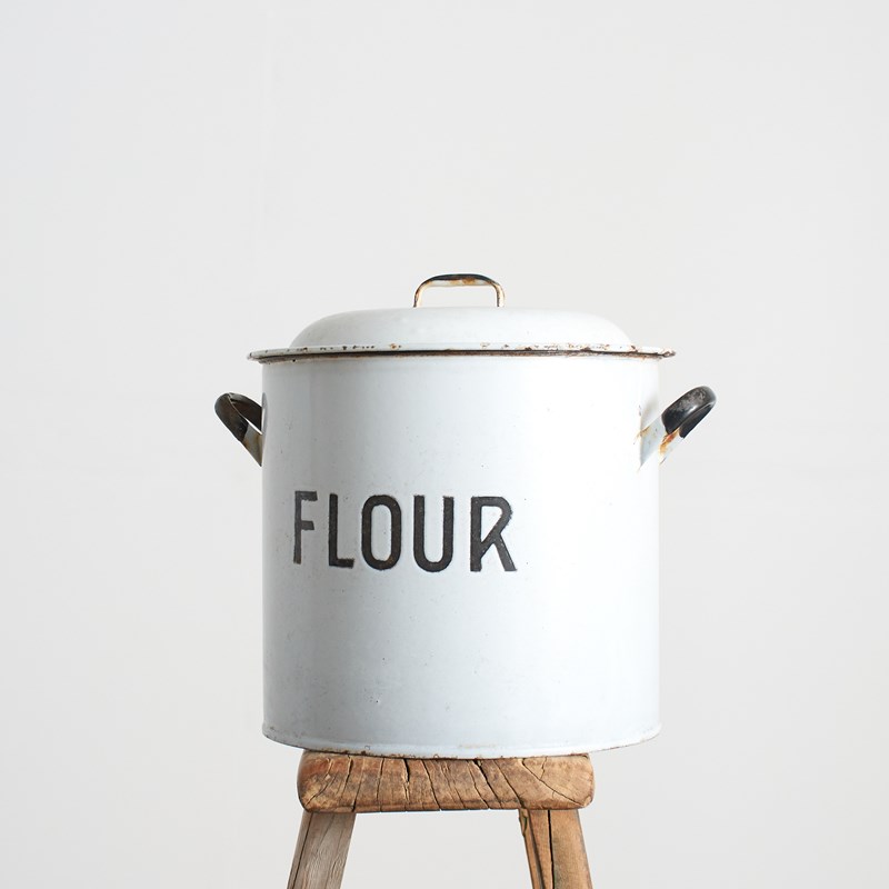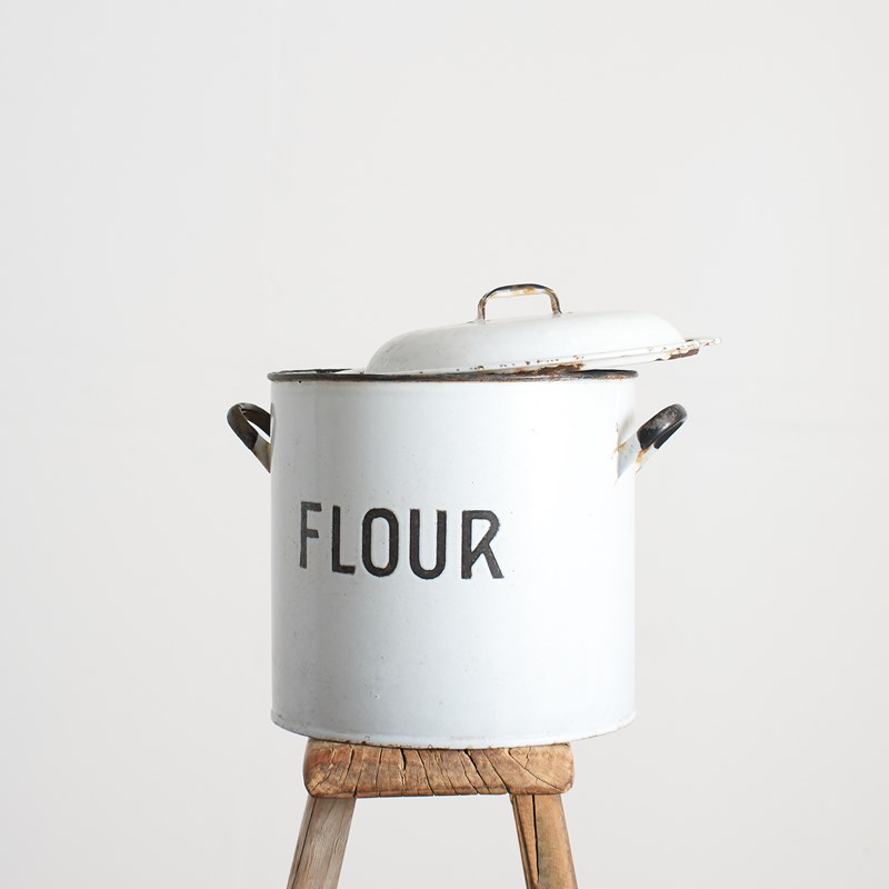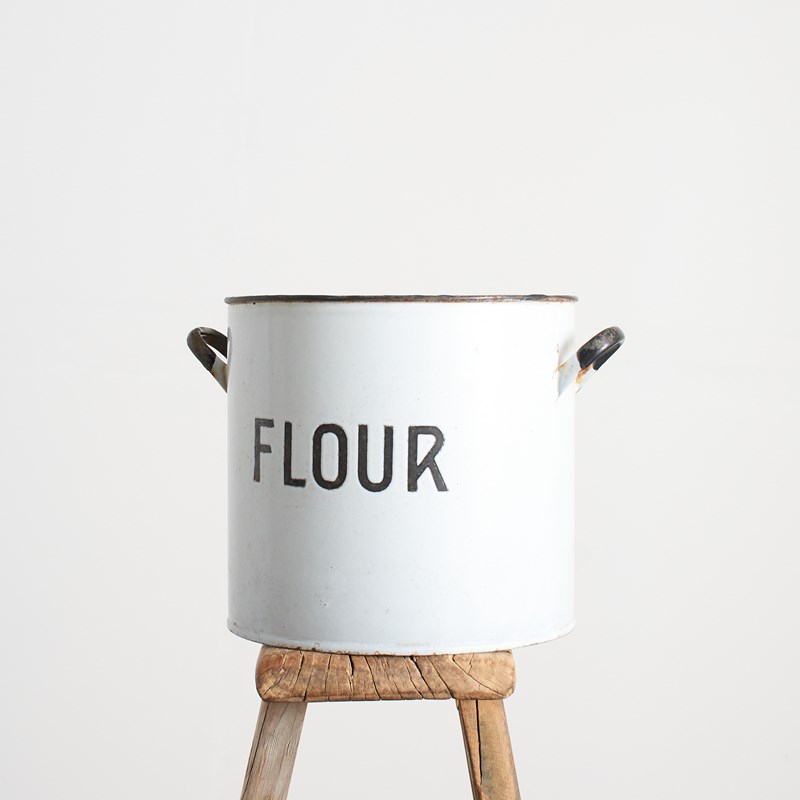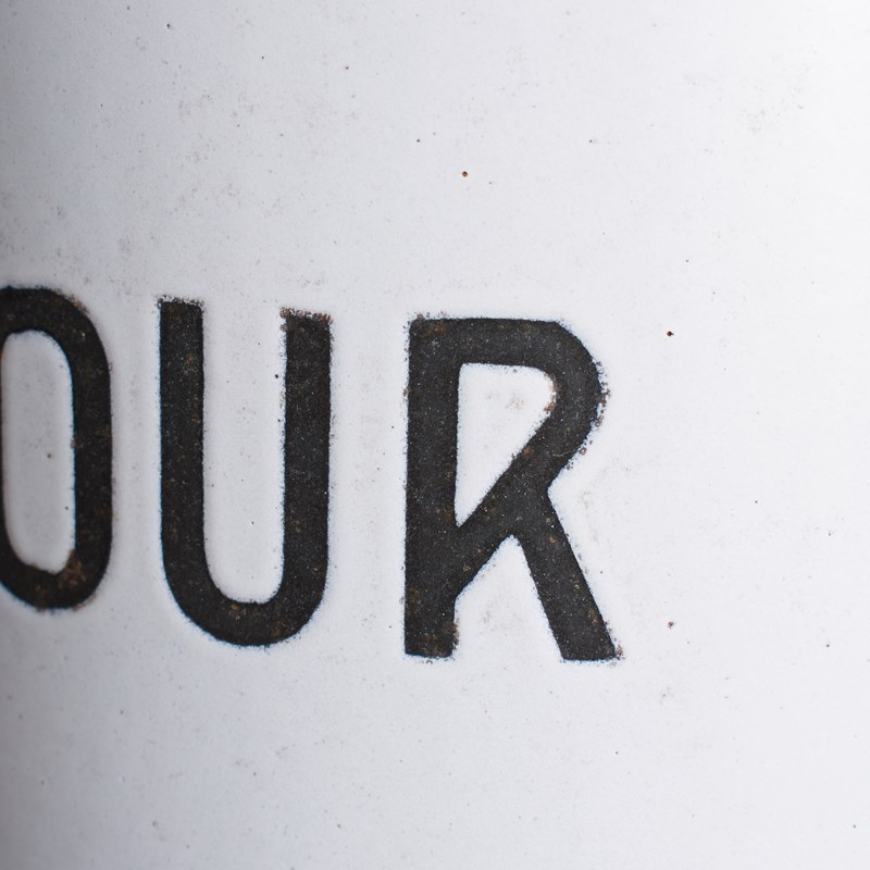 A classic kitchen flour storage bin. The bin retains its original handled lid. The bin is white enamel with black handles and a striking “Flour” typeface.