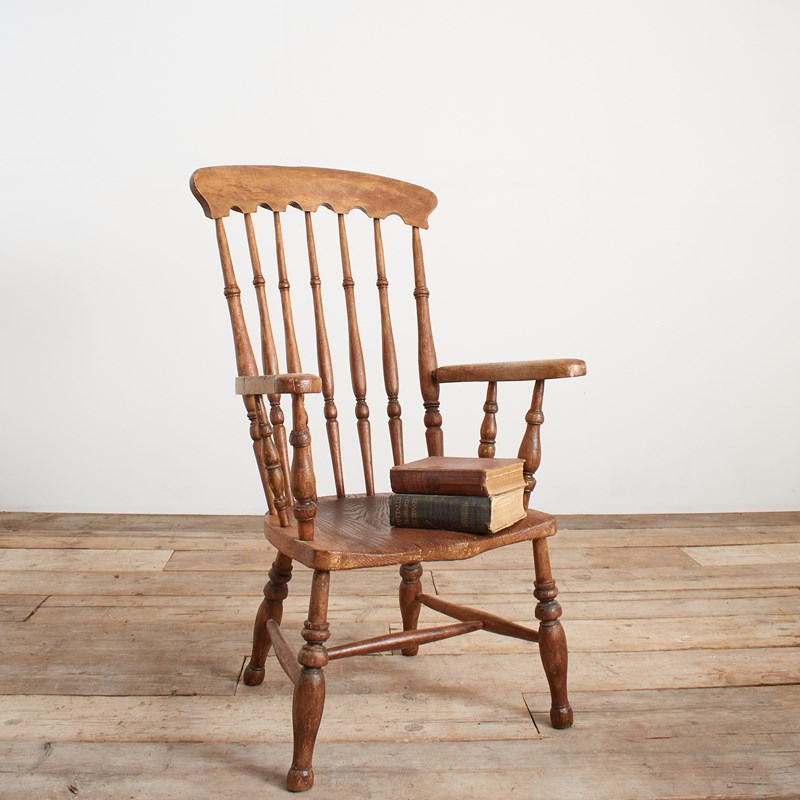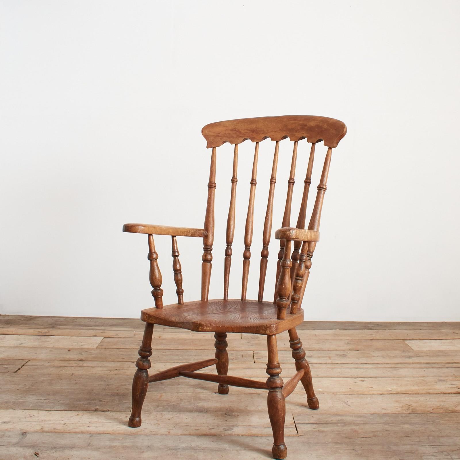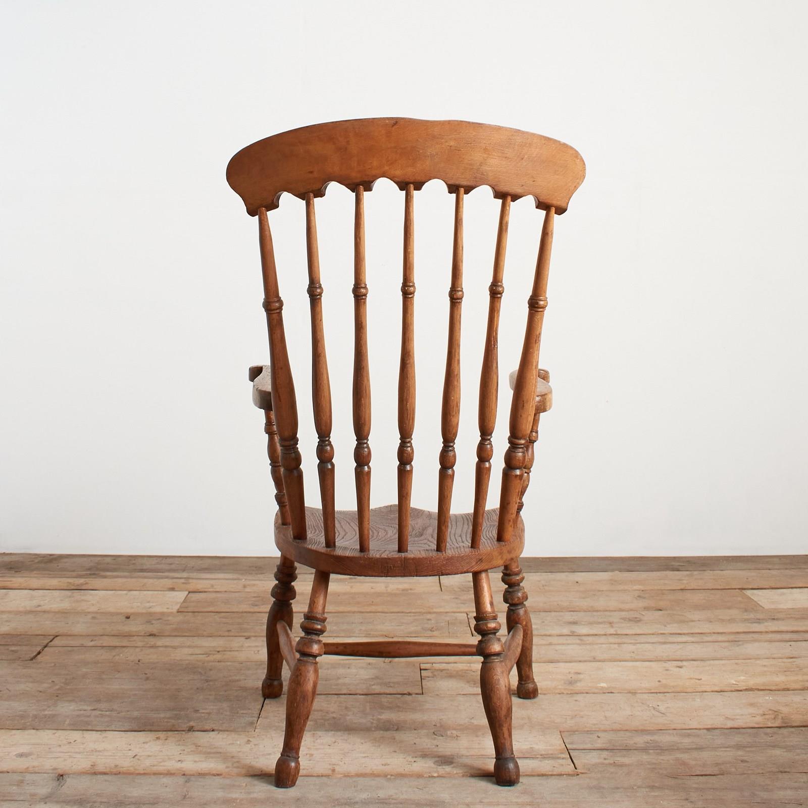 A nineteenth century high back Windsor chair with spindle back, solid elm seat, raised on four turned legs with H framed stretcher. The shapely open arms make this an attractive comfortable chair bringing a country farmhouse style to a kitchen.
