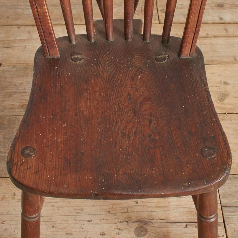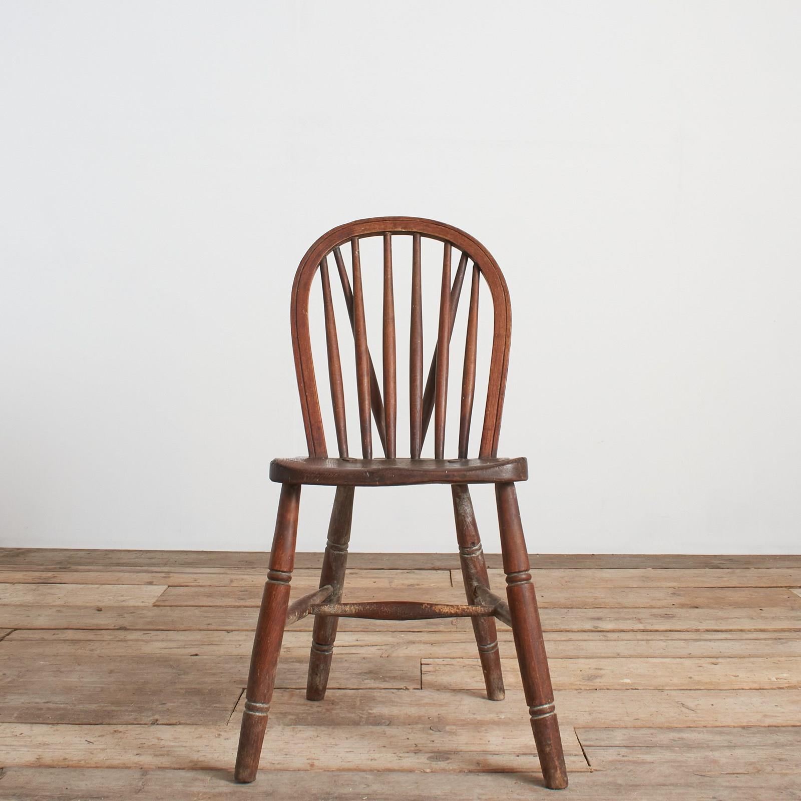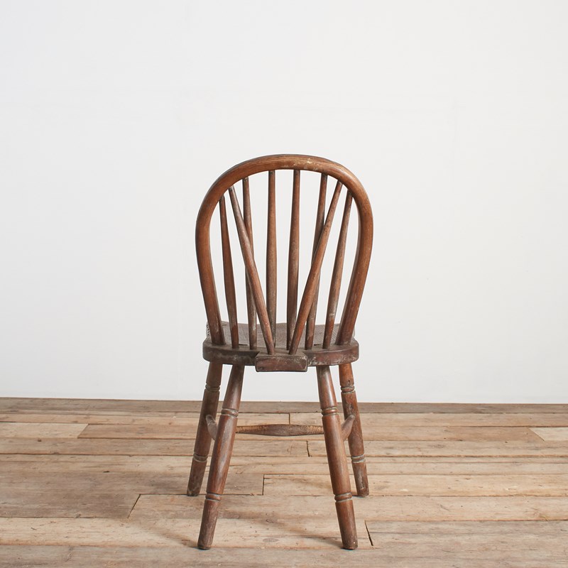 A charming antique Windsor chair from the High Wycombe area. It has a hoop and stick back design with six spindle backrest and for added strength a double spindle rear support to the bobbin tail.