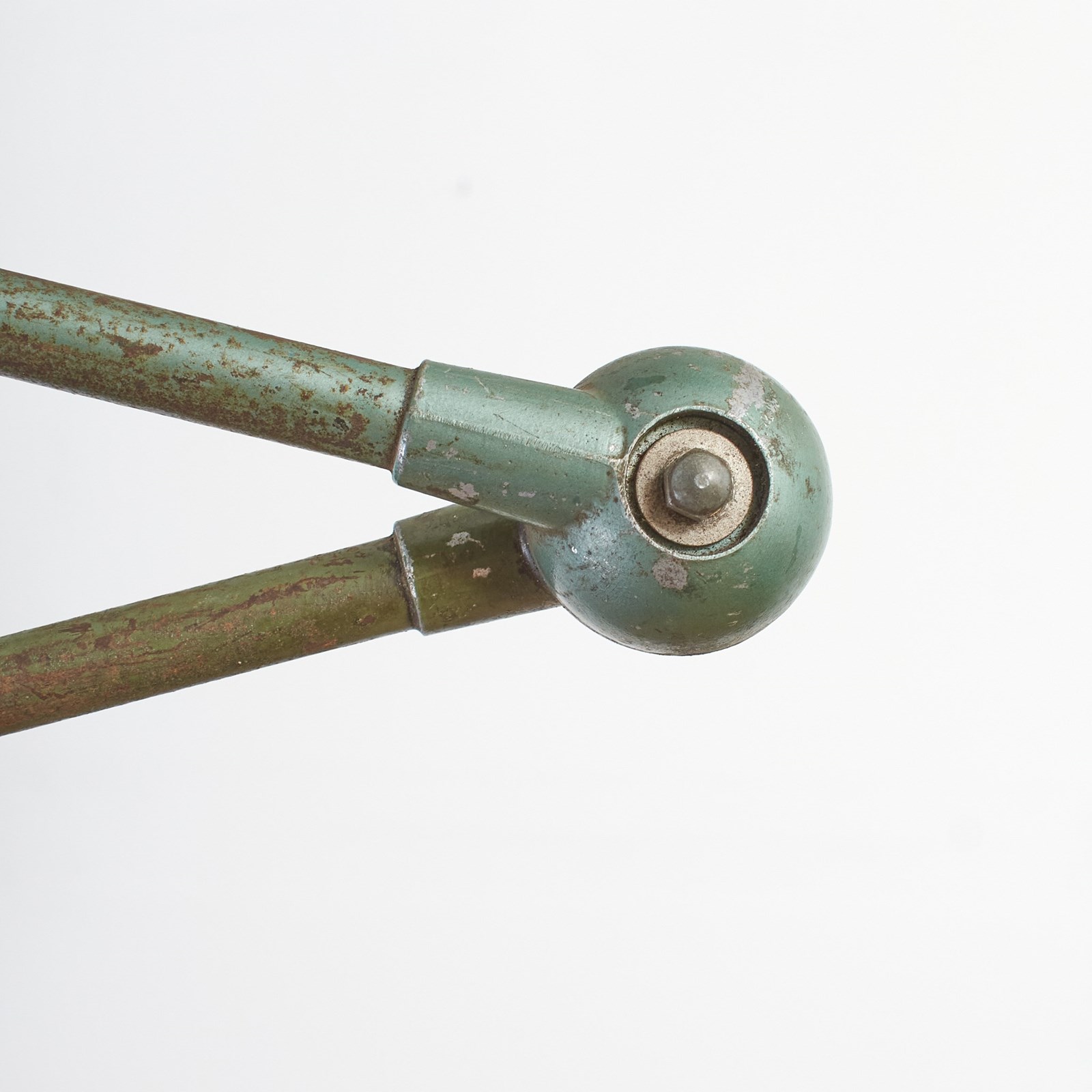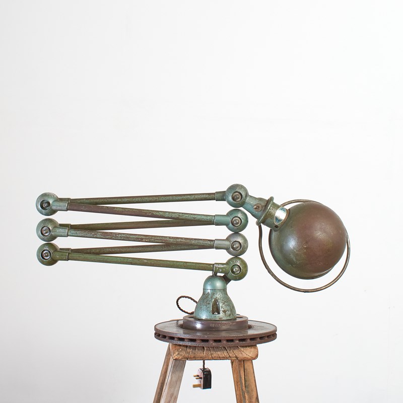 A truly versatile industrial lamp designed by Jean-Louis Domecq – The name “Jielde” comes from the French pronunciation of his initials: Ji-eL-De, these lamps have no internal wiring at the joints so can articulate with amazing flexibility, reducing and increasing height or changing direction with ease. This model is called the ‘standard’ lamp. The lamp shade and arms are steel, the base and joints are aluminium. The lamp retains its original Jielde plate on the shade neck.