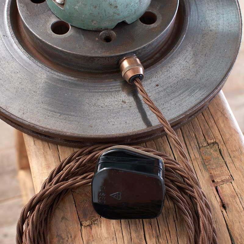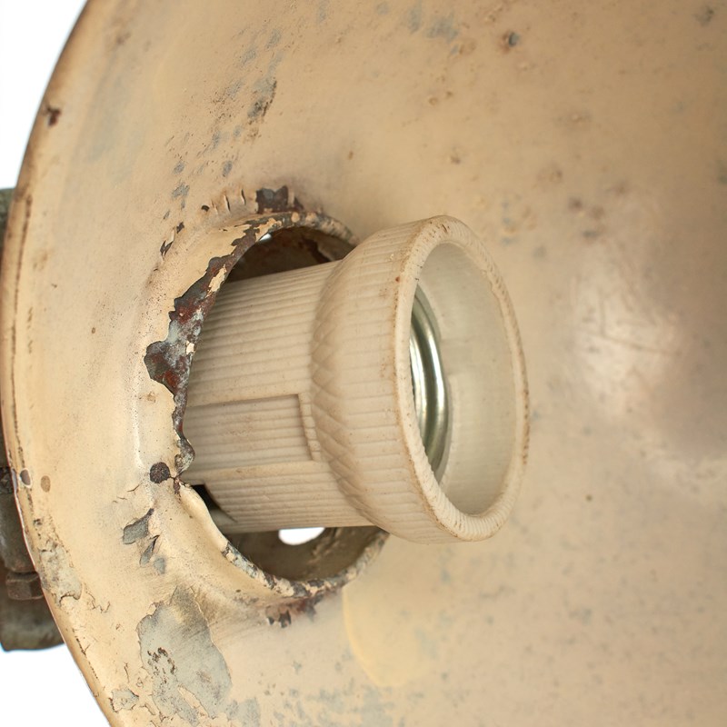 Workshop Report: The workshop team inspect all products and perform any necessary repairs to ensure many more years of future use, the lamp metalwork has been cleaned waxed and existing bulb holder has replaced with a new CE certified E27 (screw) bulb holder and it has been rewired with 2.5m of brown twisted vintage style fabric flex and a 3 pin UK plug. The metalwork is clean with a original green aged patina, the internal lampshade retains its original white paint and shows signs of wear.
