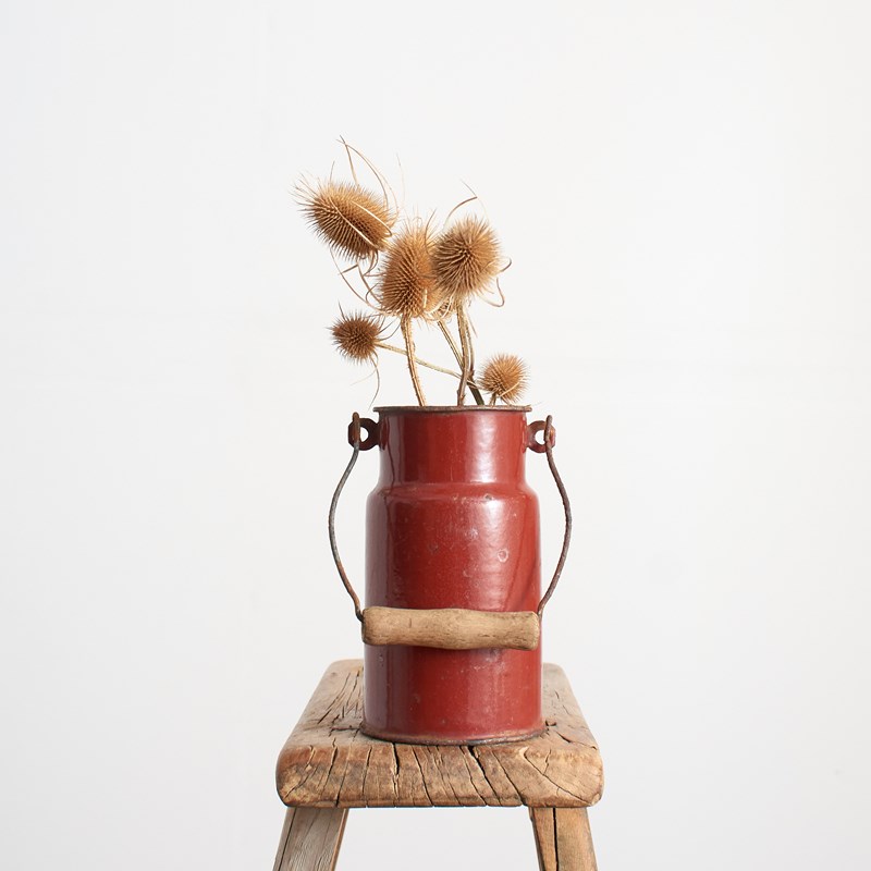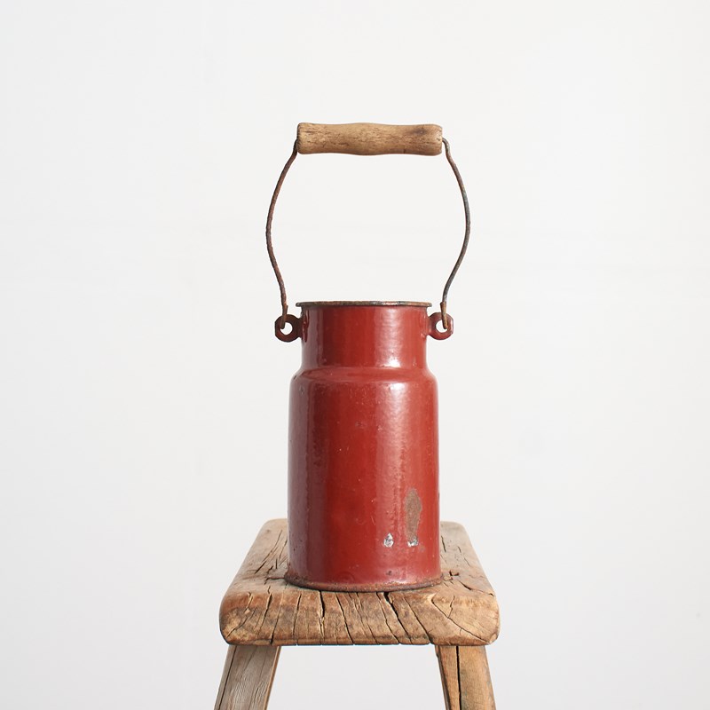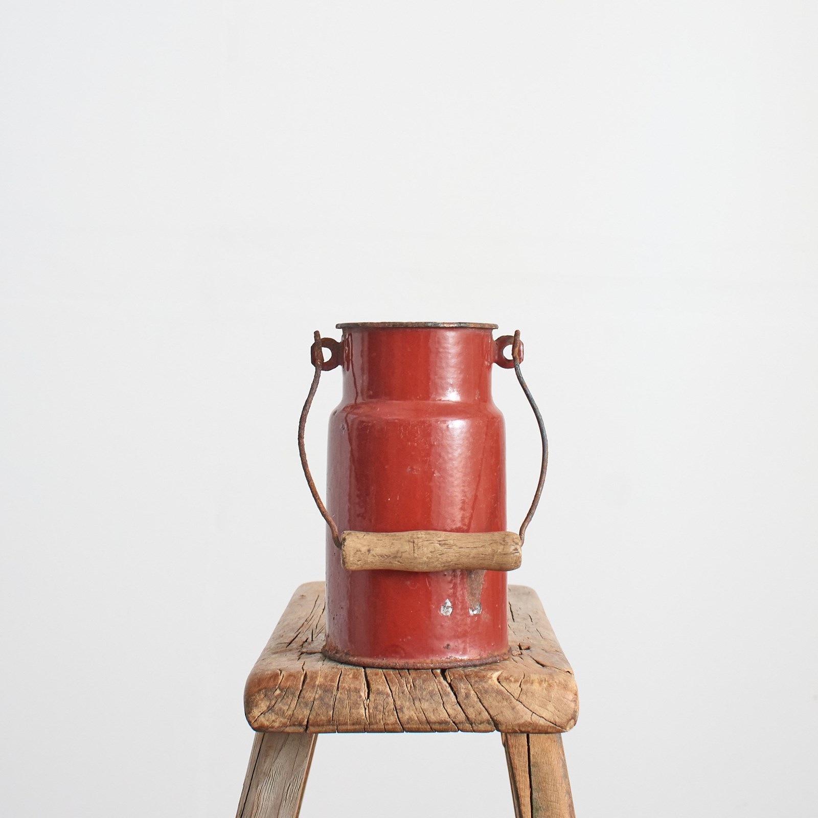 An enamel milk churn made from steel with an enamel coating. It retains its original metal wire handle and wooden handle, the churn has some wear to the enamel in places.
