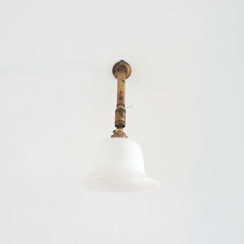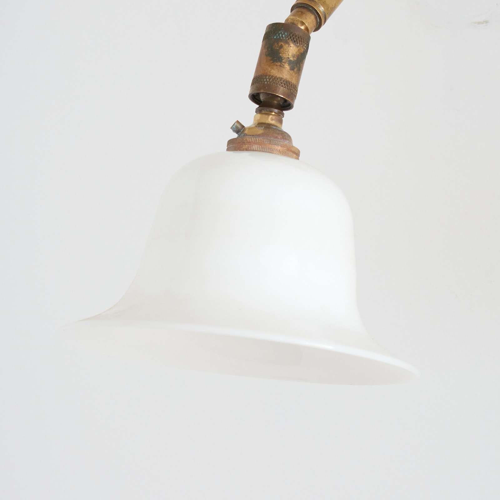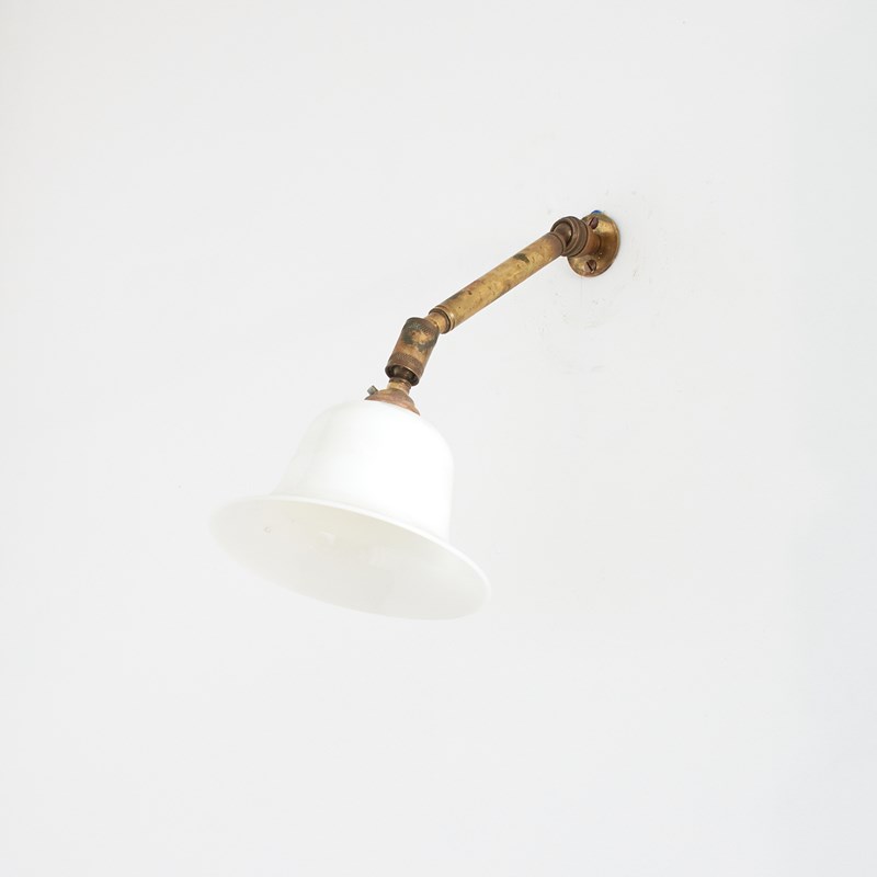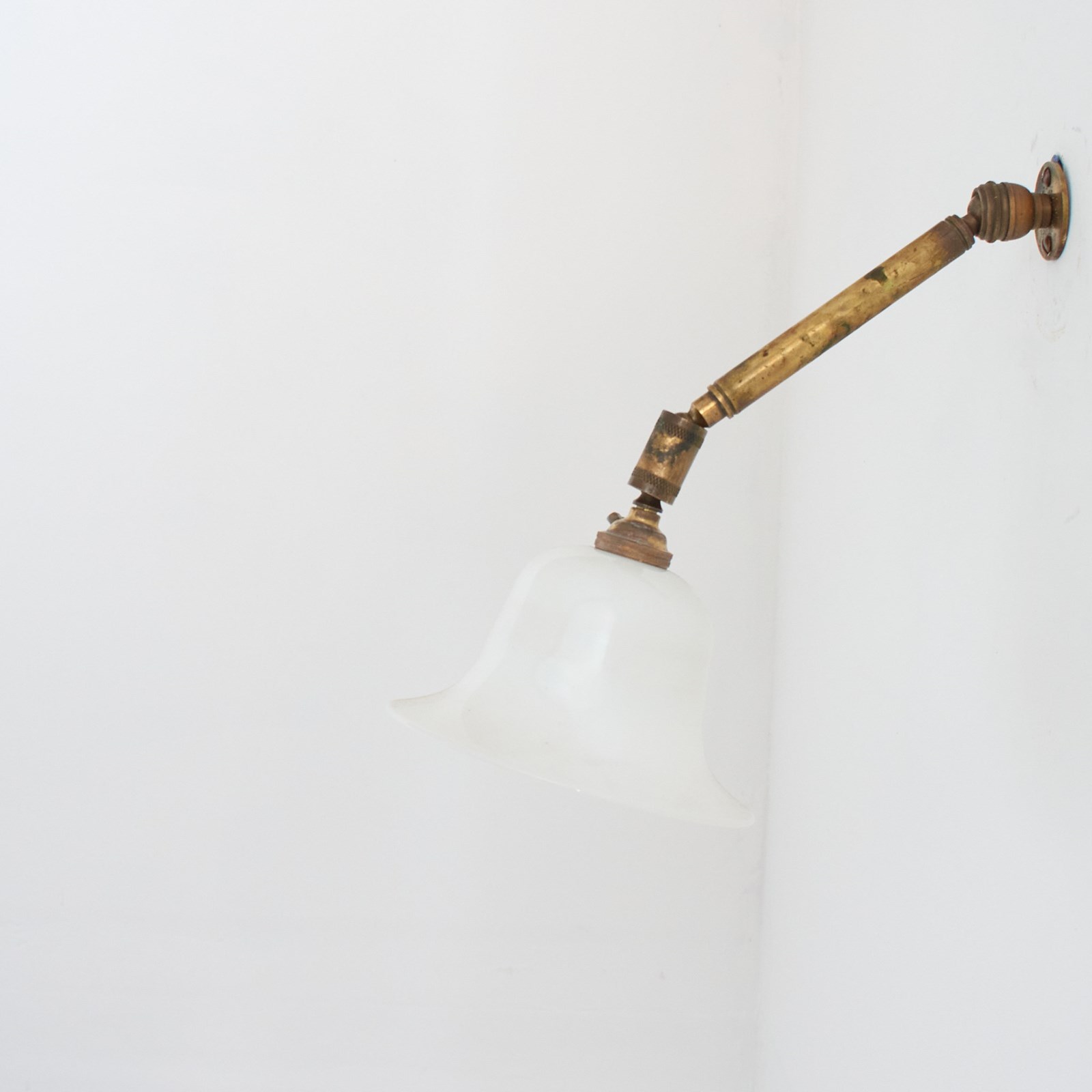An original French adjustable brass wall light. The light was salvaged from a Parisian studio, it retains its original milk glass opaline shade. There are 2 brass arms both attached with ball and socket joints enabling 360′ movement at each joint. The light could be wall, ceiling or shelf mounted depending on the use scenario. It has 2 holes in the back plate to enable mounting.