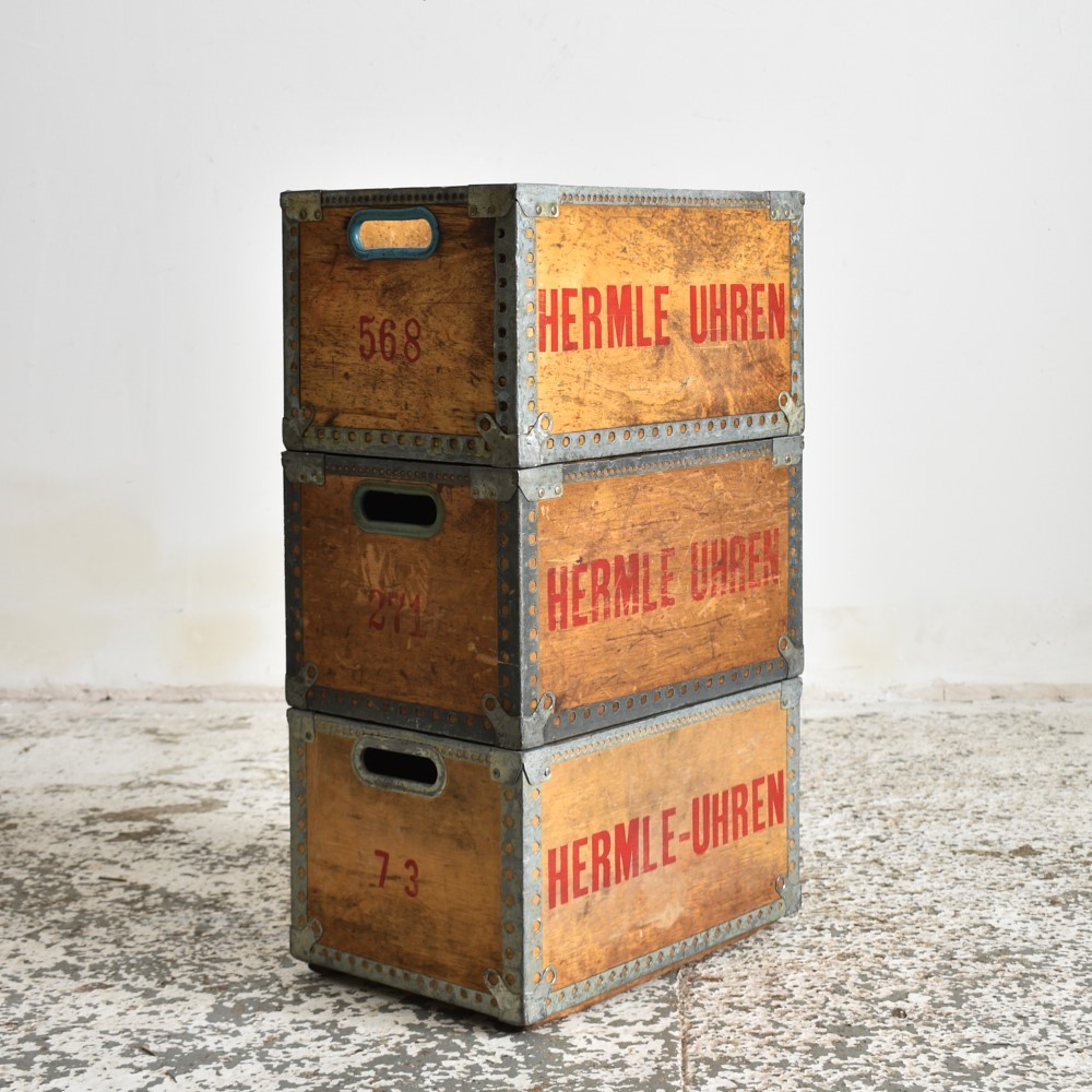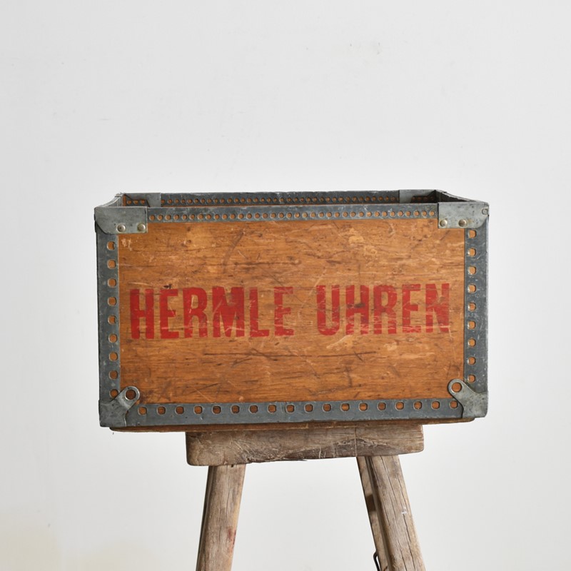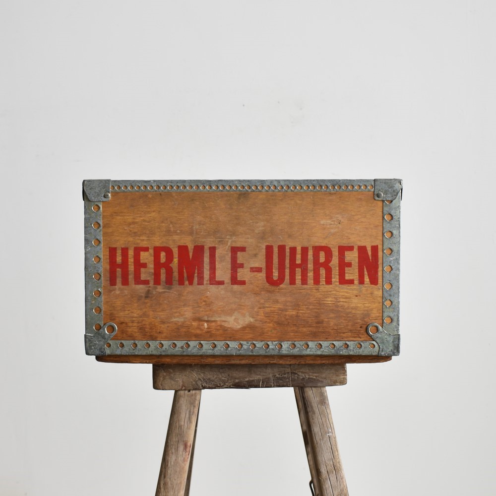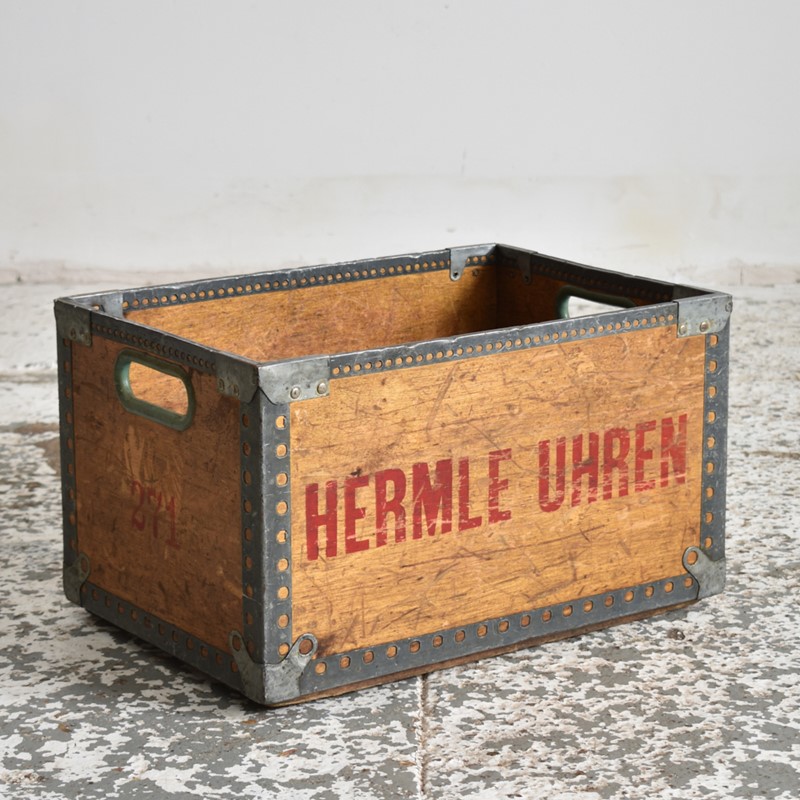 Hermle Clocks Antique Storage Crate – B An original wooden stocking storage crate from the Hermle Clock factory in Germany. The crate is manufactured from wood with re-enforced metal edges and carry handles at either end. The crate is designed to stack. The crate has the manufacturers name stamped onto the sides in red paint – Hermle Urhen – Urhen is clocks in German. There is also a unique number stamped onto the end of the crate. Origin: Germany Circa: 1950s Workshop Report: The crate is structurally sound, it has been cleaned and waxed for protection, there is wear to the wood and metal in places. As with all our products, this product is an original vintage item so there are signs of wear from use. Listing is for a single storage crate Shipping: Will be Shipped by Parcel , 3-5 days, Rate is for England only please contact us for other destinations. Please contact us for a shipping quote.