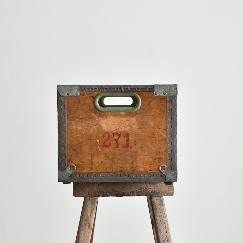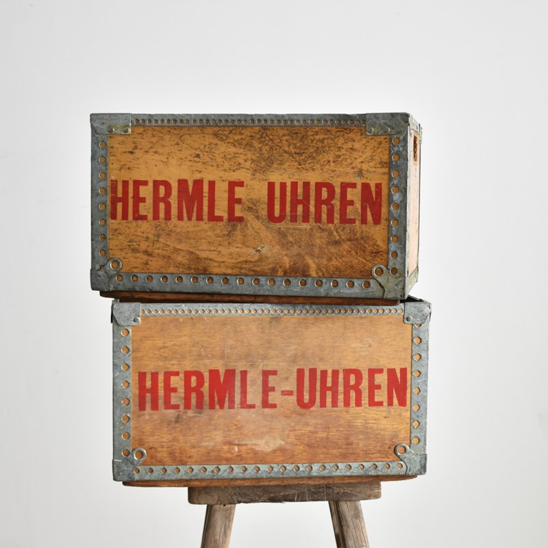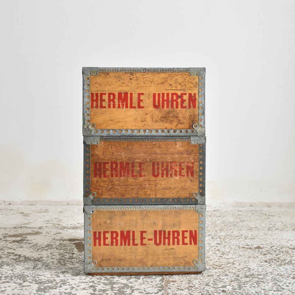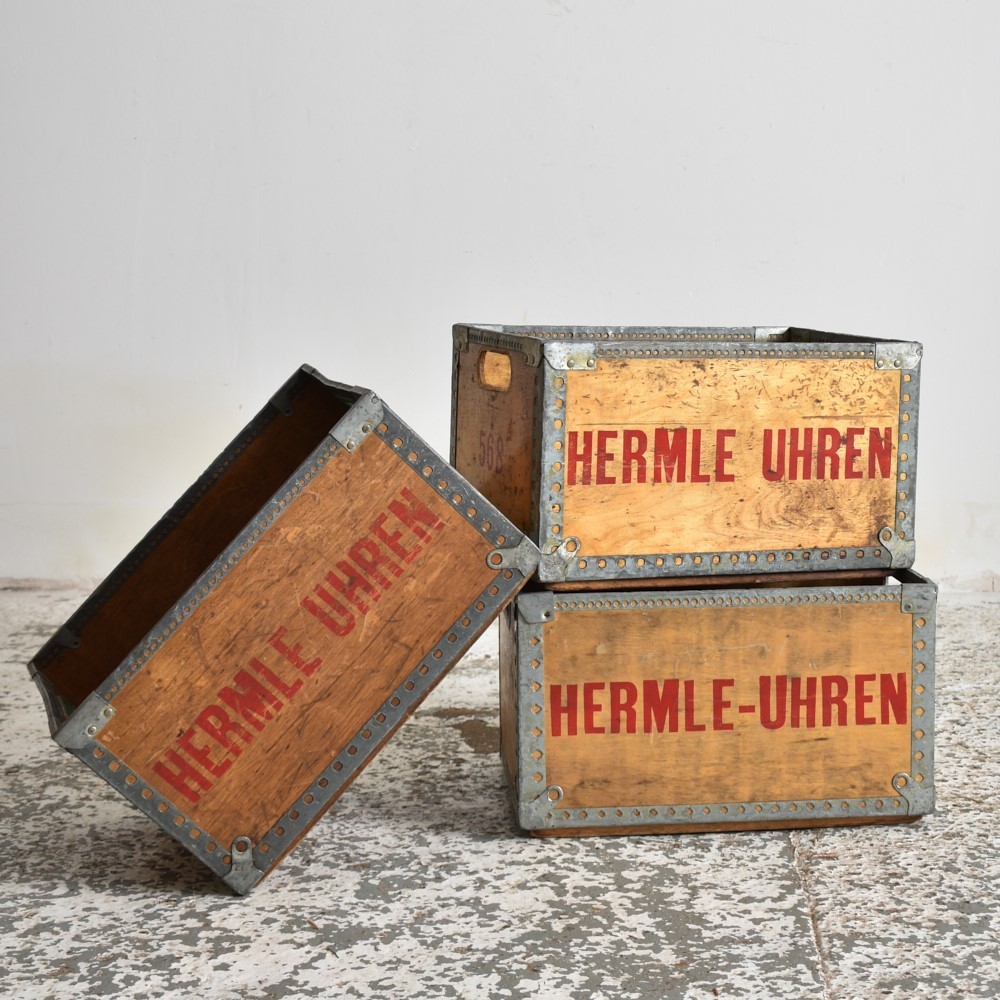Hermle Clocks Antique Storage Crate – B An original wooden stocking storage crate from the Hermle Clock factory in Germany. The crate is manufactured from wood with re-enforced metal edges and carry handles at either end. The crate is designed to stack. The crate has the manufacturers name stamped onto the sides in red paint – Hermle Urhen – Urhen is clocks in German. There is also a unique number stamped onto the end of the crate. Origin: Germany Circa: 1950s Workshop Report: The crate is structurally sound, it has been cleaned and waxed for protection, there is wear to the wood and metal in places. As with all our products, this product is an original vintage item so there are signs of wear from use. Listing is for a single storage crate Shipping: Will be Shipped by Parcel , 3-5 days, Rate is for England only please contact us for other destinations. Please contact us for a shipping quote.