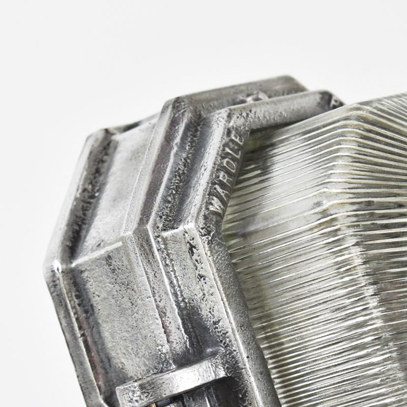 Original British industrial prismatic bulkhead light by ‘Wardle’. Circa 1950. Linear prismatic glass lens located within two part brushed metal housing with cast makers mark ‘Wardle Prismalux.’ Striking art deco style lights with their angular shape and prismatic glass.