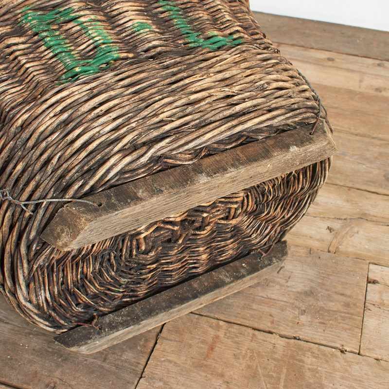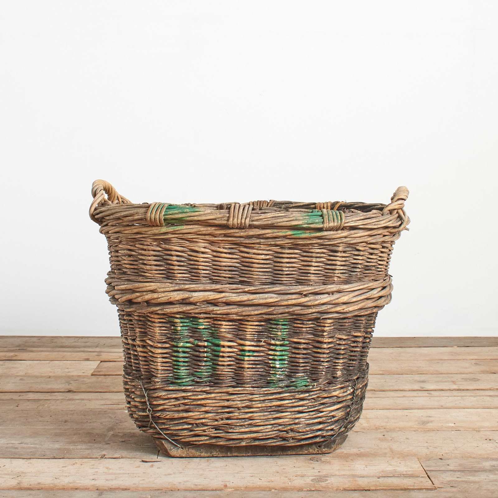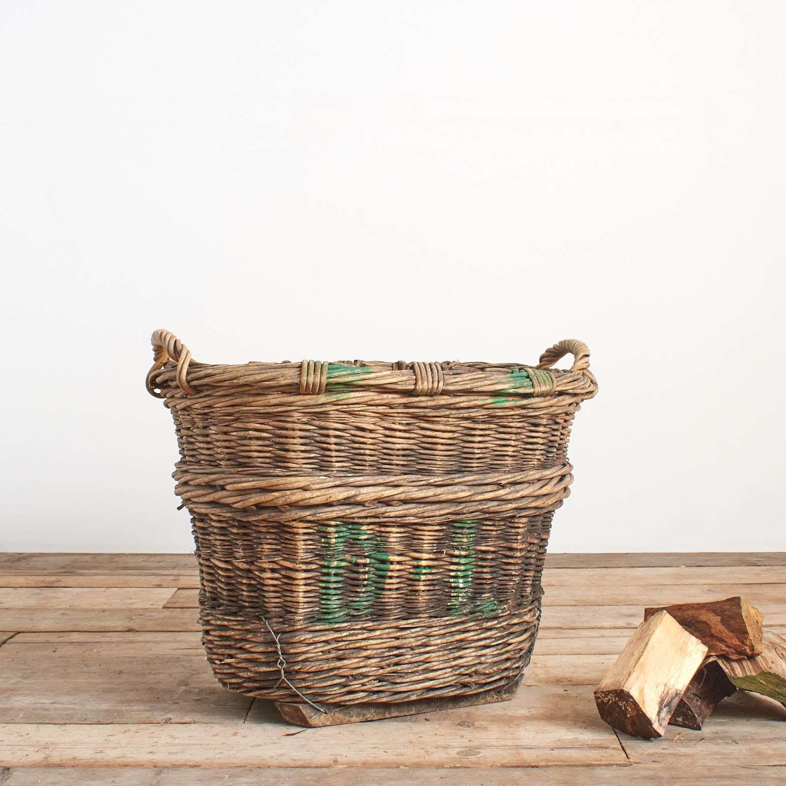 A beautiful hand-made wicker champagne basket from France used to harvest grapes in the champagne region. The markings identify the grower and vineyard it belonged to. The basket has reinforced sides with chestnut splints and a pair of oak wooden base runners give extra strength and manoeuvrability. It is very sturdy and perfect for storing logs by the fire.