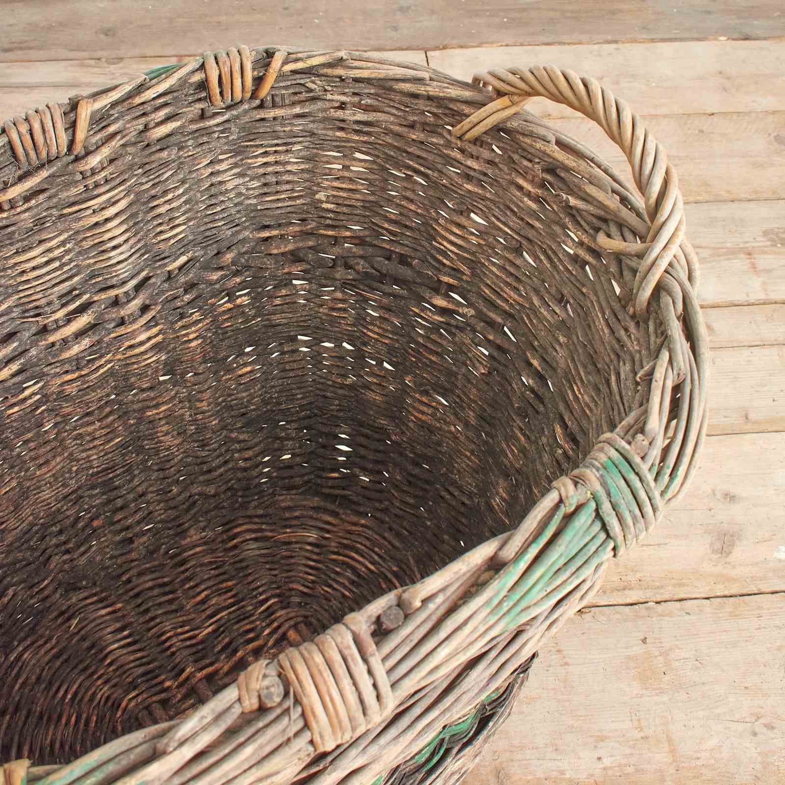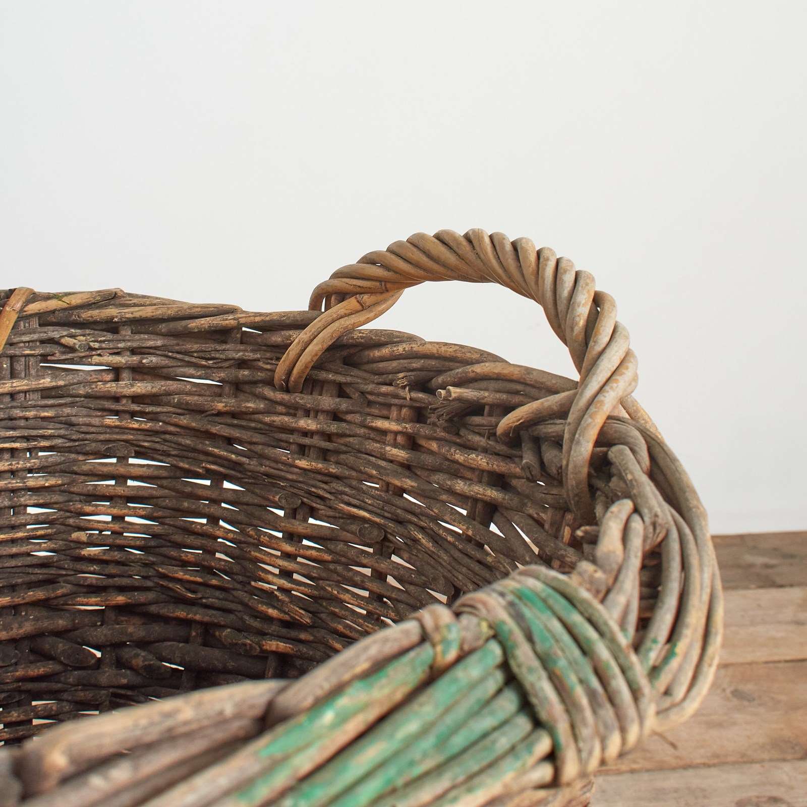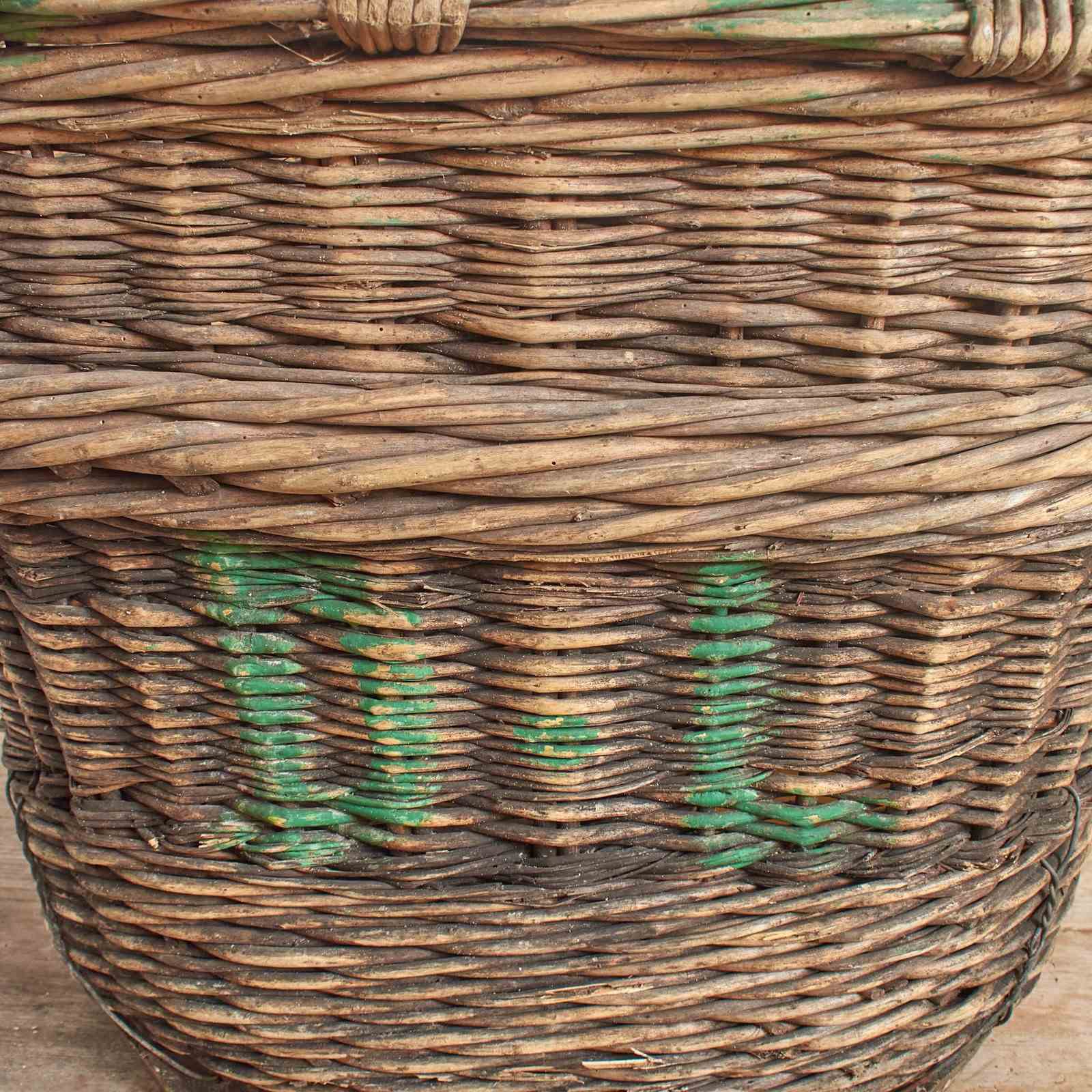 A beautiful hand-made wicker champagne basket from France used to harvest grapes in the champagne region. The markings identify the grower and vineyard it belonged to. The basket has reinforced sides with chestnut splints and a pair of oak wooden base runners give extra strength and manoeuvrability. It is very sturdy and perfect for storing logs by the fire.