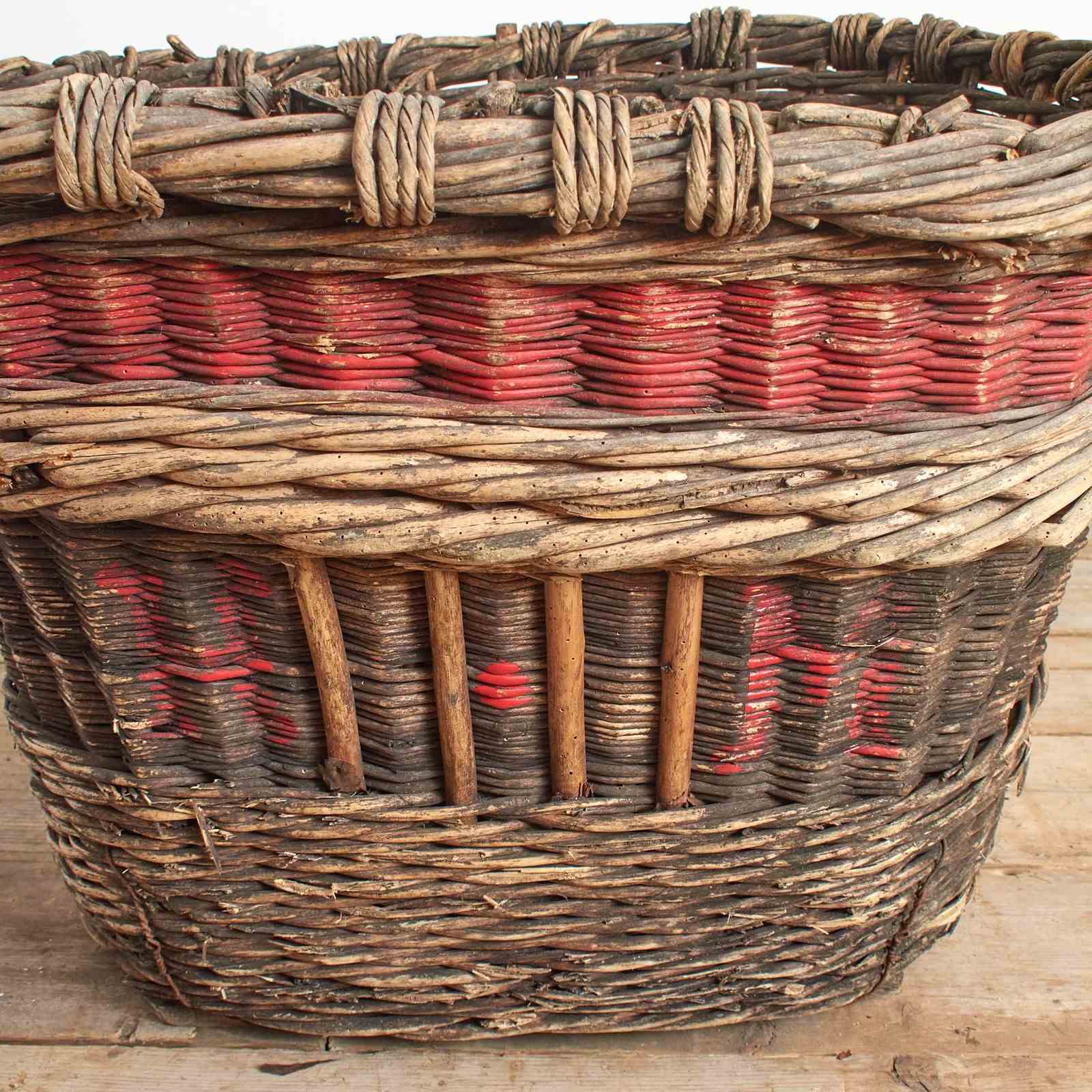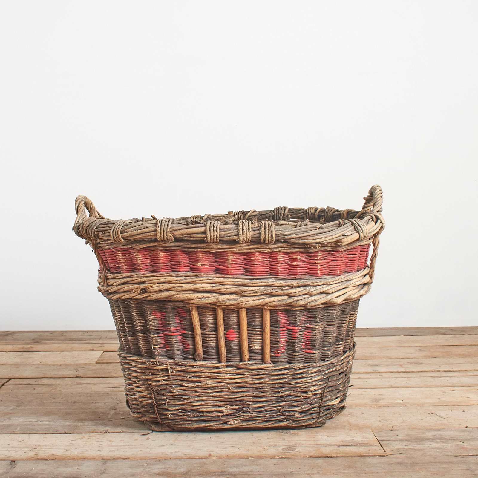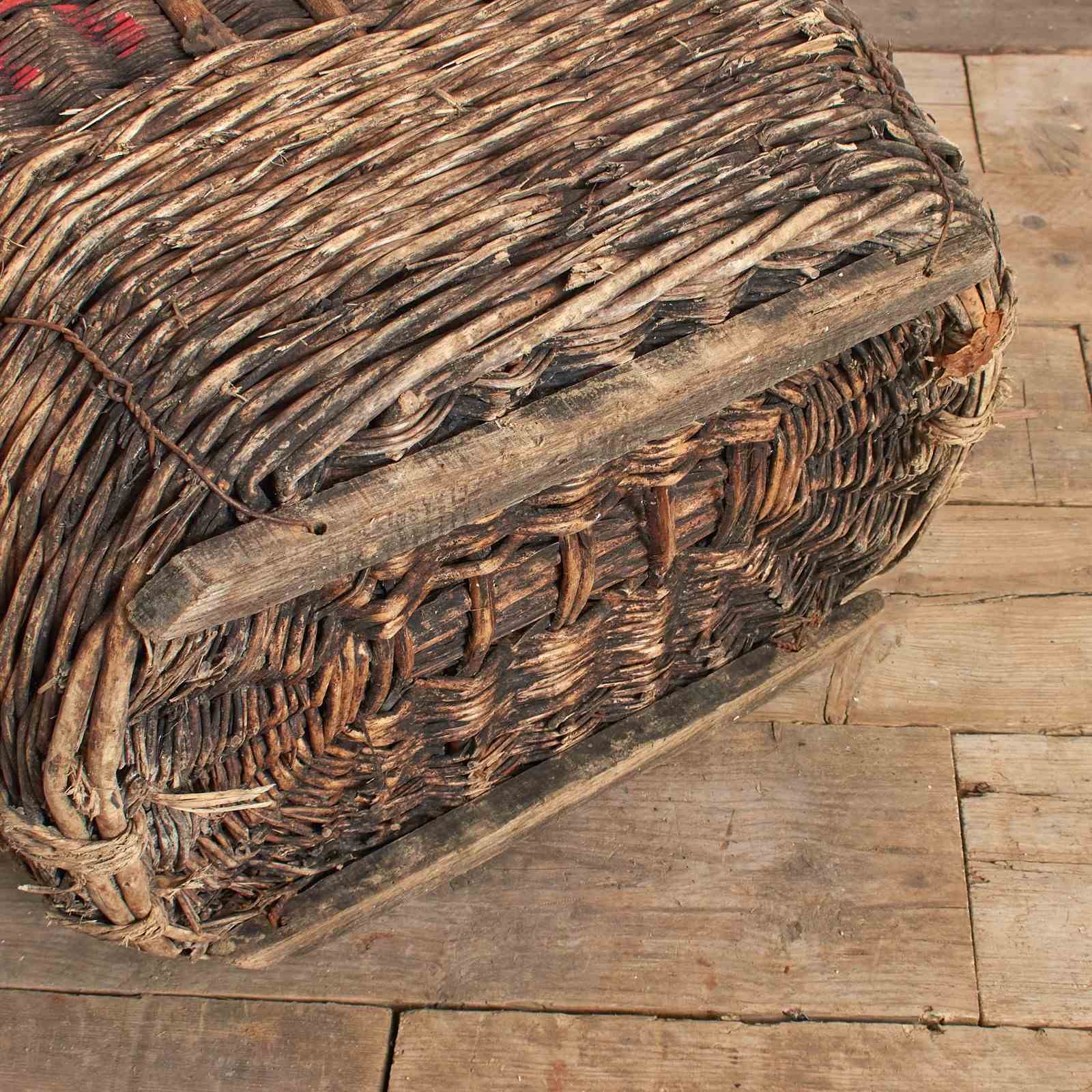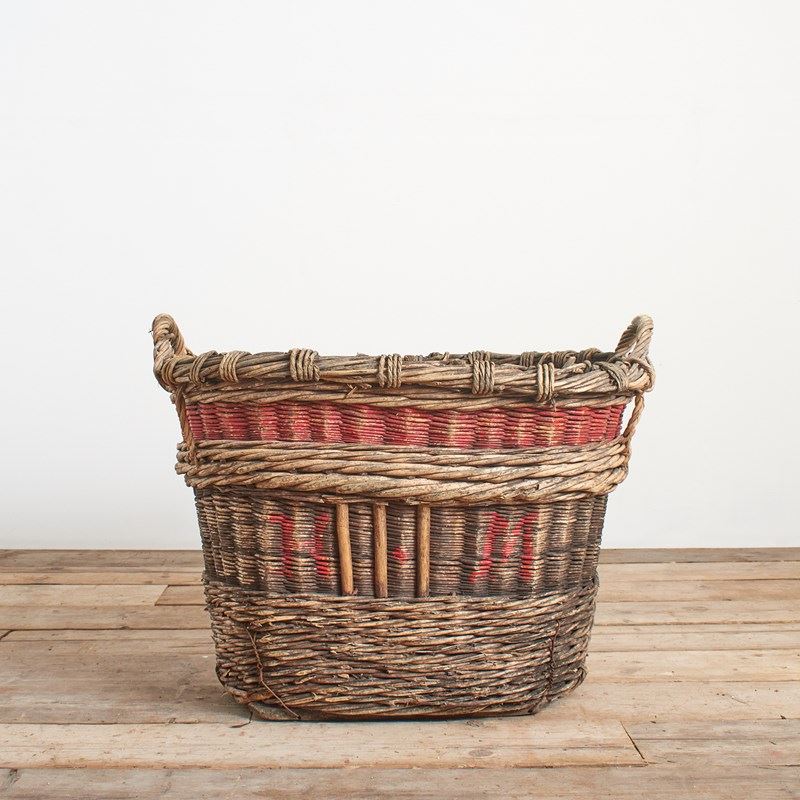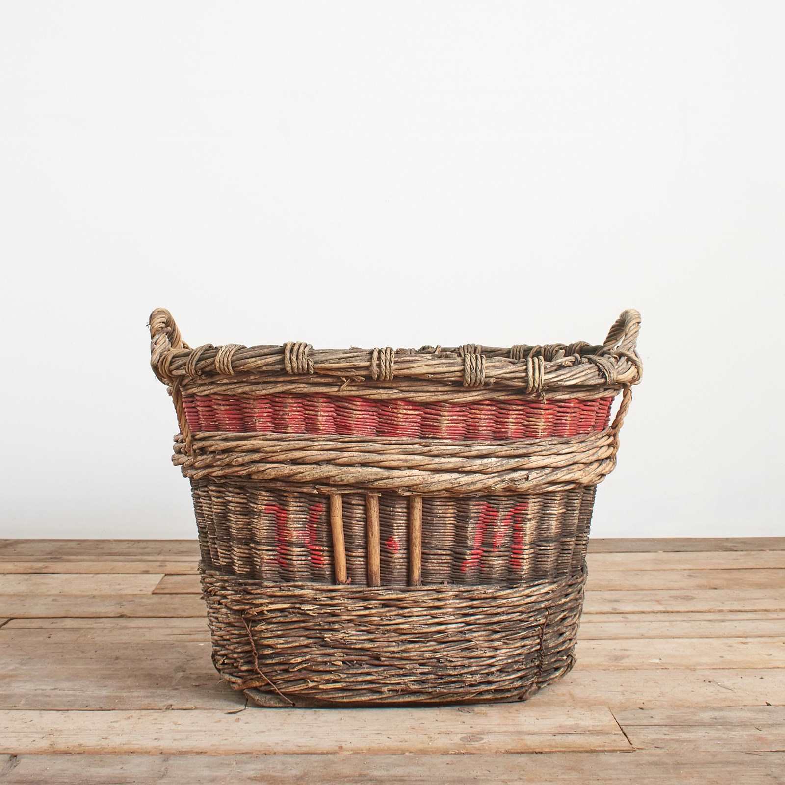 A beautiful hand-made wicker champagne basket from France used to harvest grapes in the champagne region. The markings identify the grower and vineyard it belonged to. The basket has reinforced sides with chestnut splints and a pair of oak wooden base runners give extra strength and manoeuvrability. It is very sturdy and perfect for storing logs by the fire.