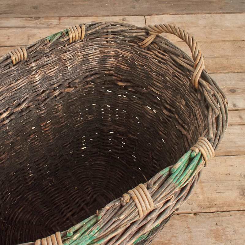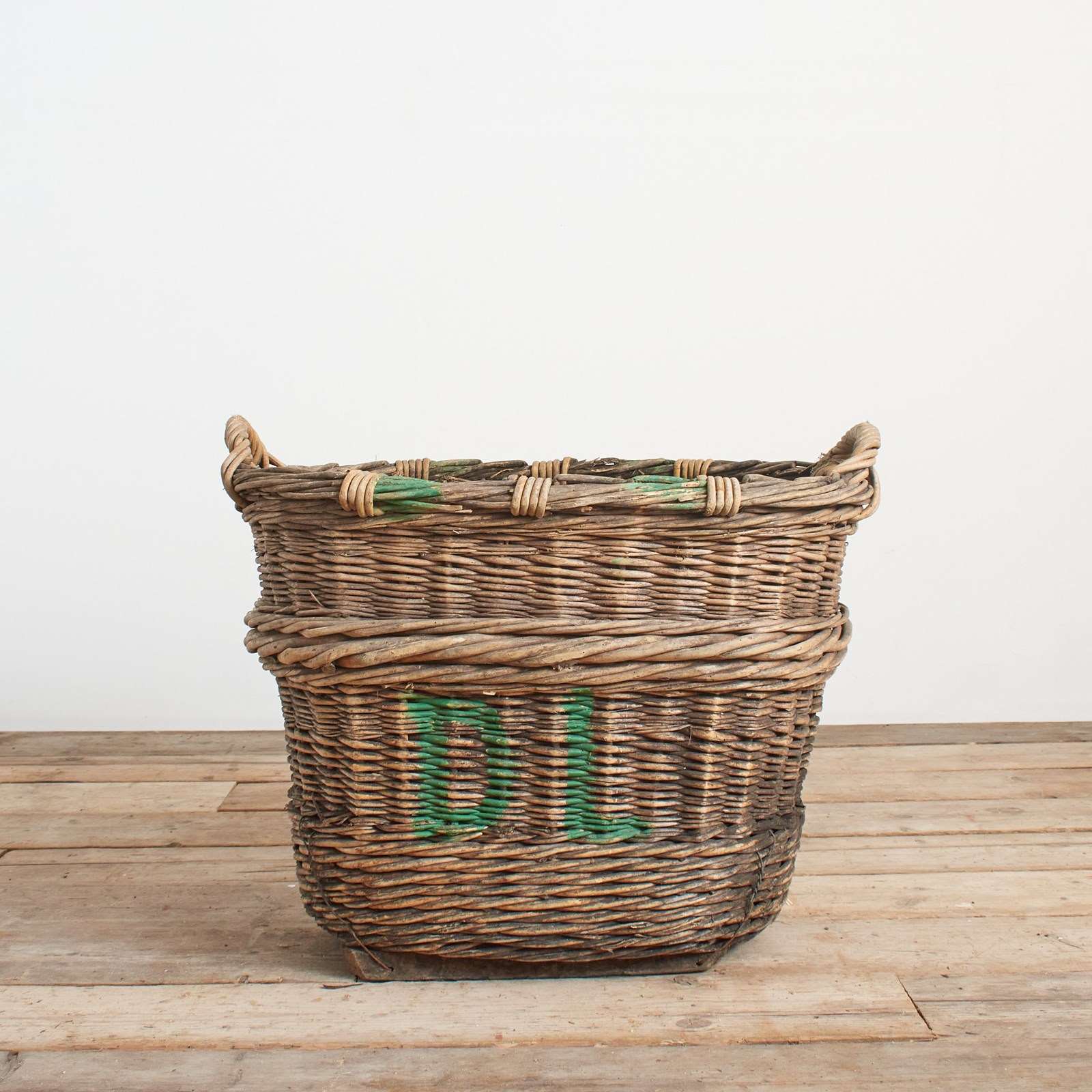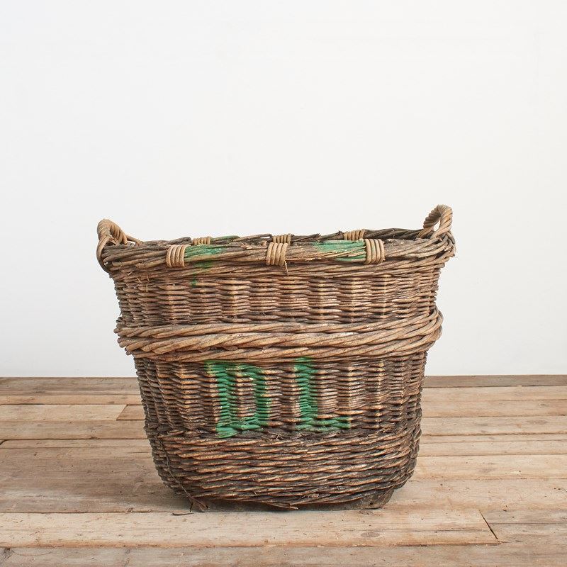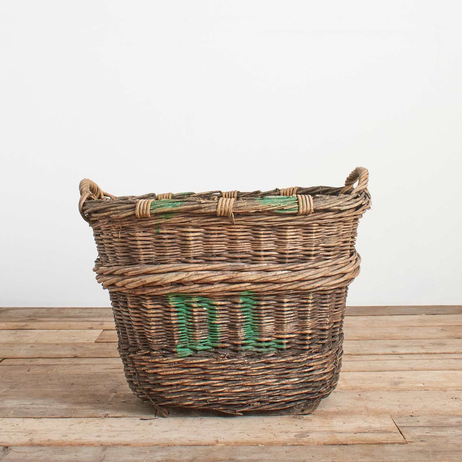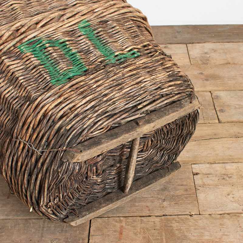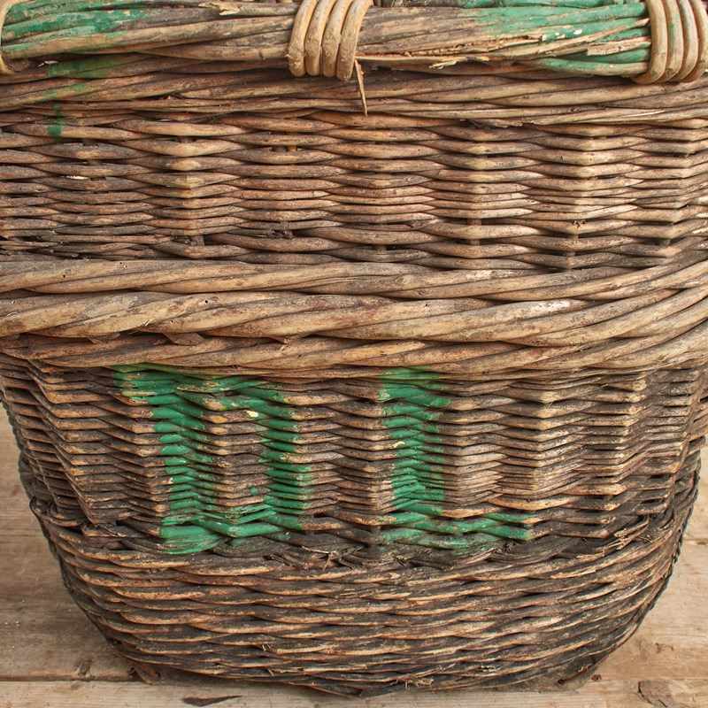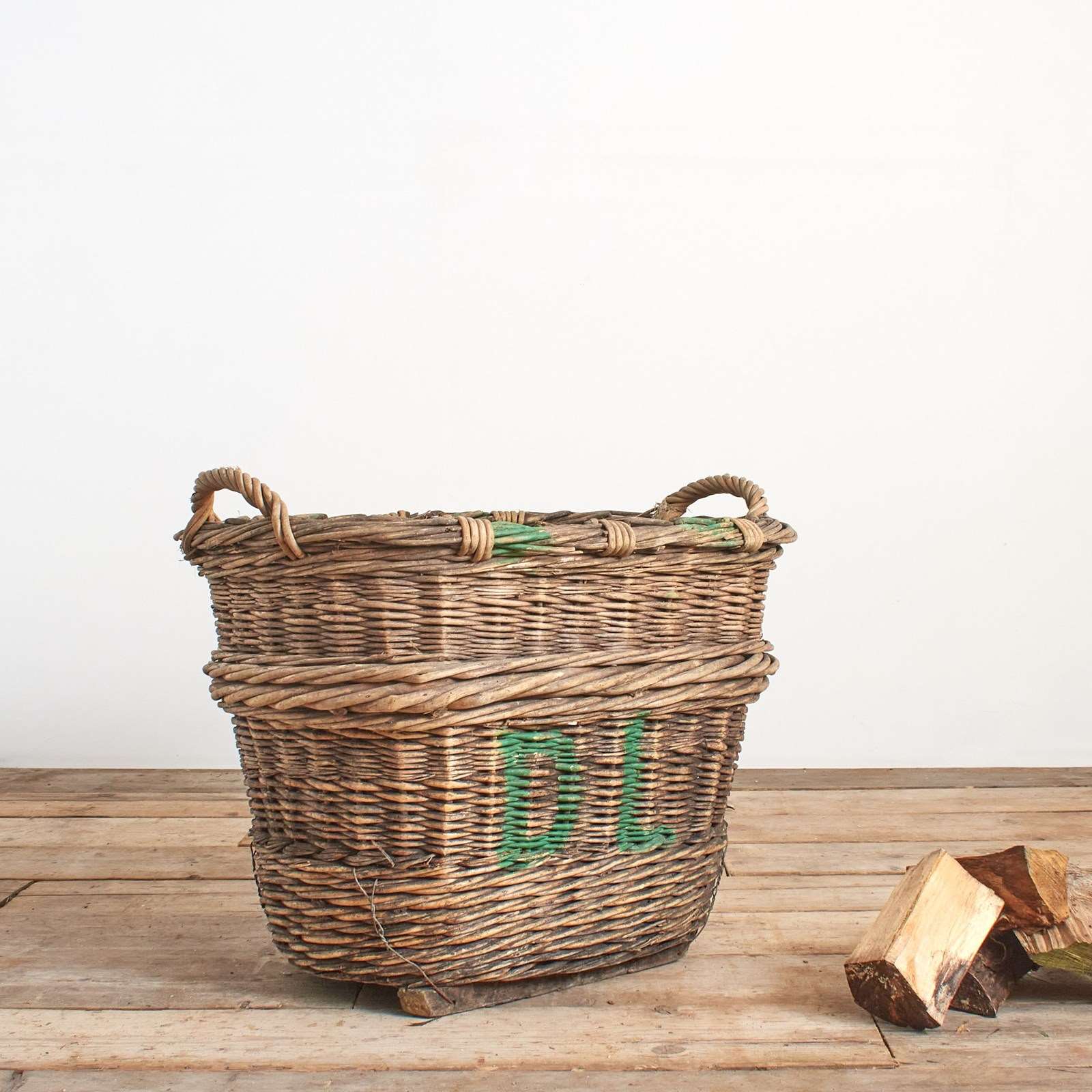 A beautiful hand-made wicker champagne basket from France used to harvest grapes in the champagne region. The markings identify the grower and vineyard it belonged to. The basket has reinforced sides with chestnut splints and a pair of oak wooden base runners give extra strength and manoeuvrability. It is very sturdy and perfect for storing logs by the fire.