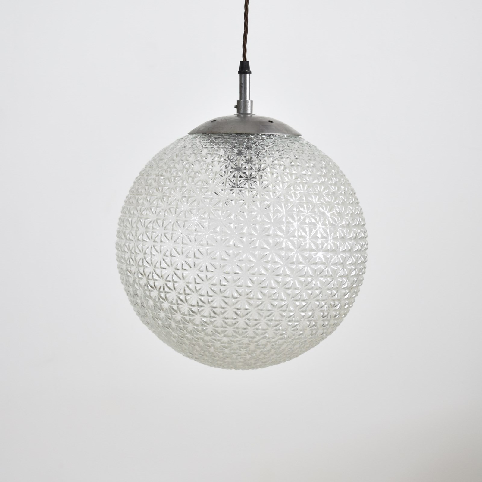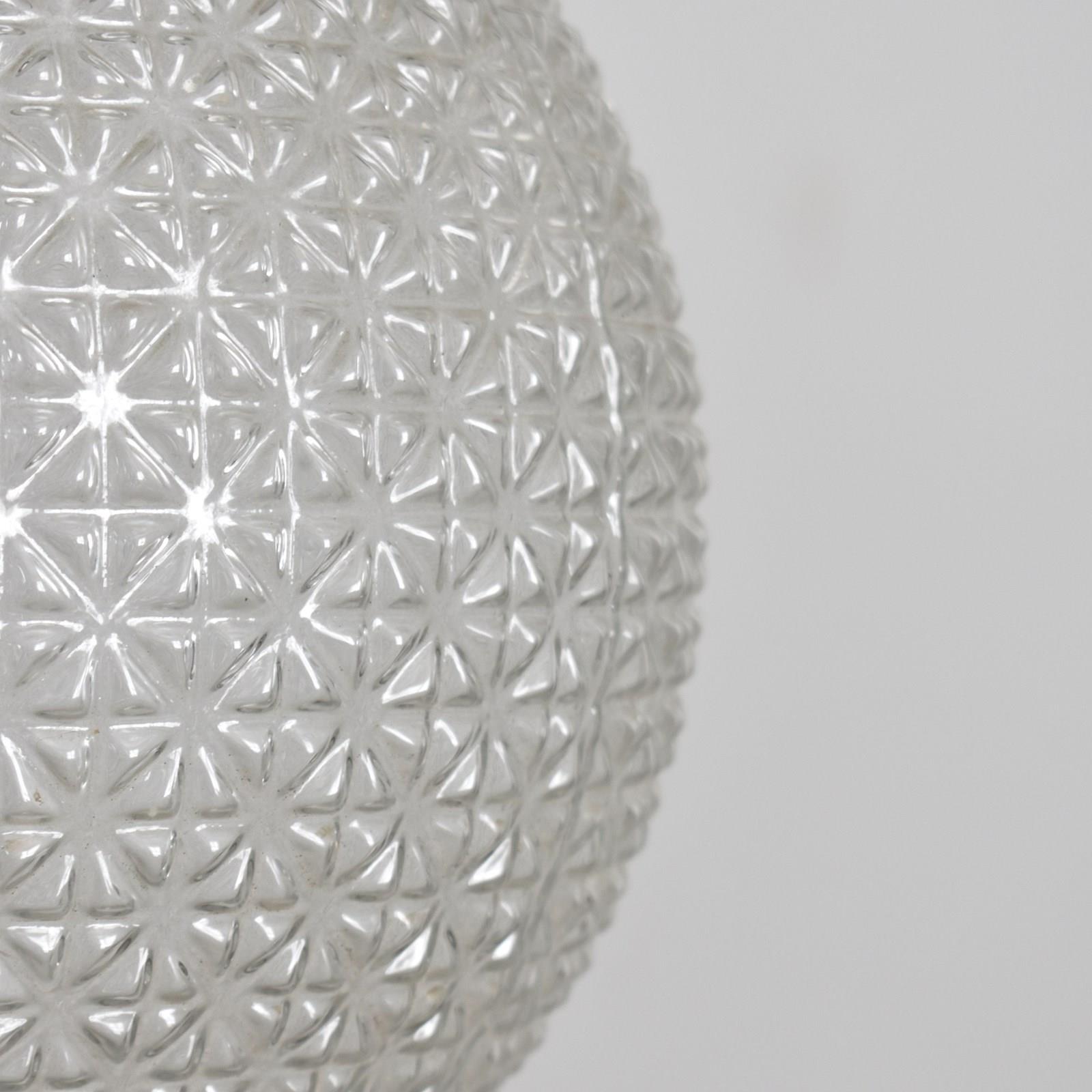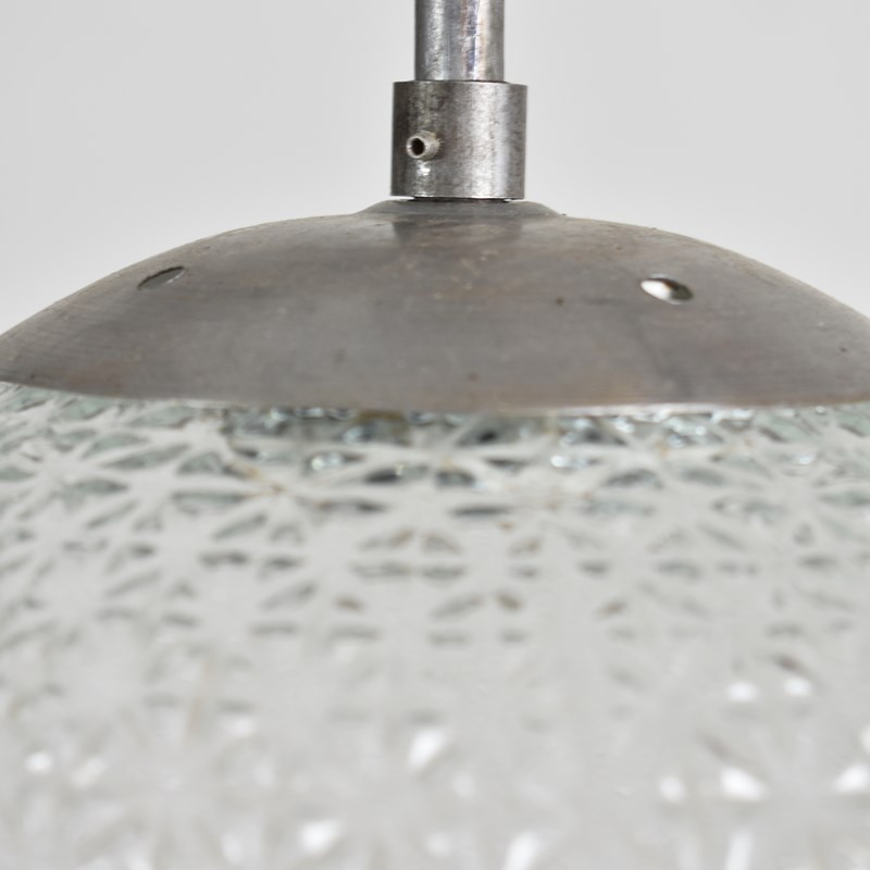A unique glass pendant light featuring cross-cut diamond glass. The glass provides a striking even glow when illuminated. The light gallery and hanging rod is steel.