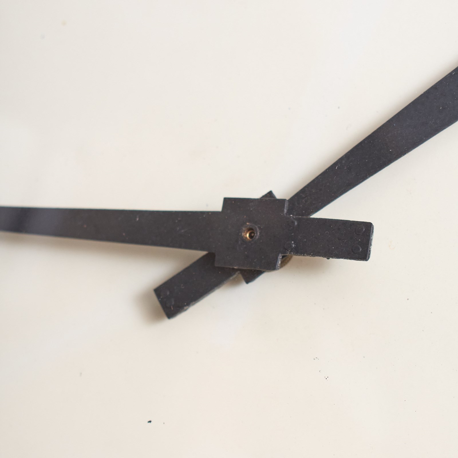 The clock has been restored, converted to a quartz battery movement mechanism powered by a AA battery retaining its original black metal hands.