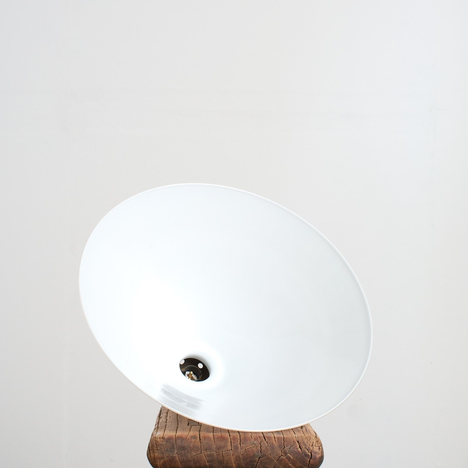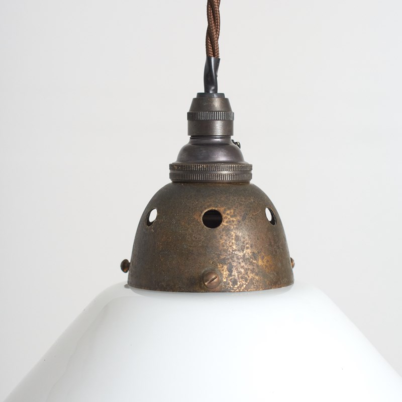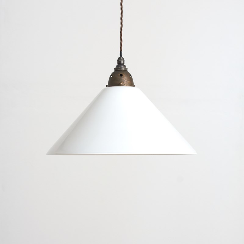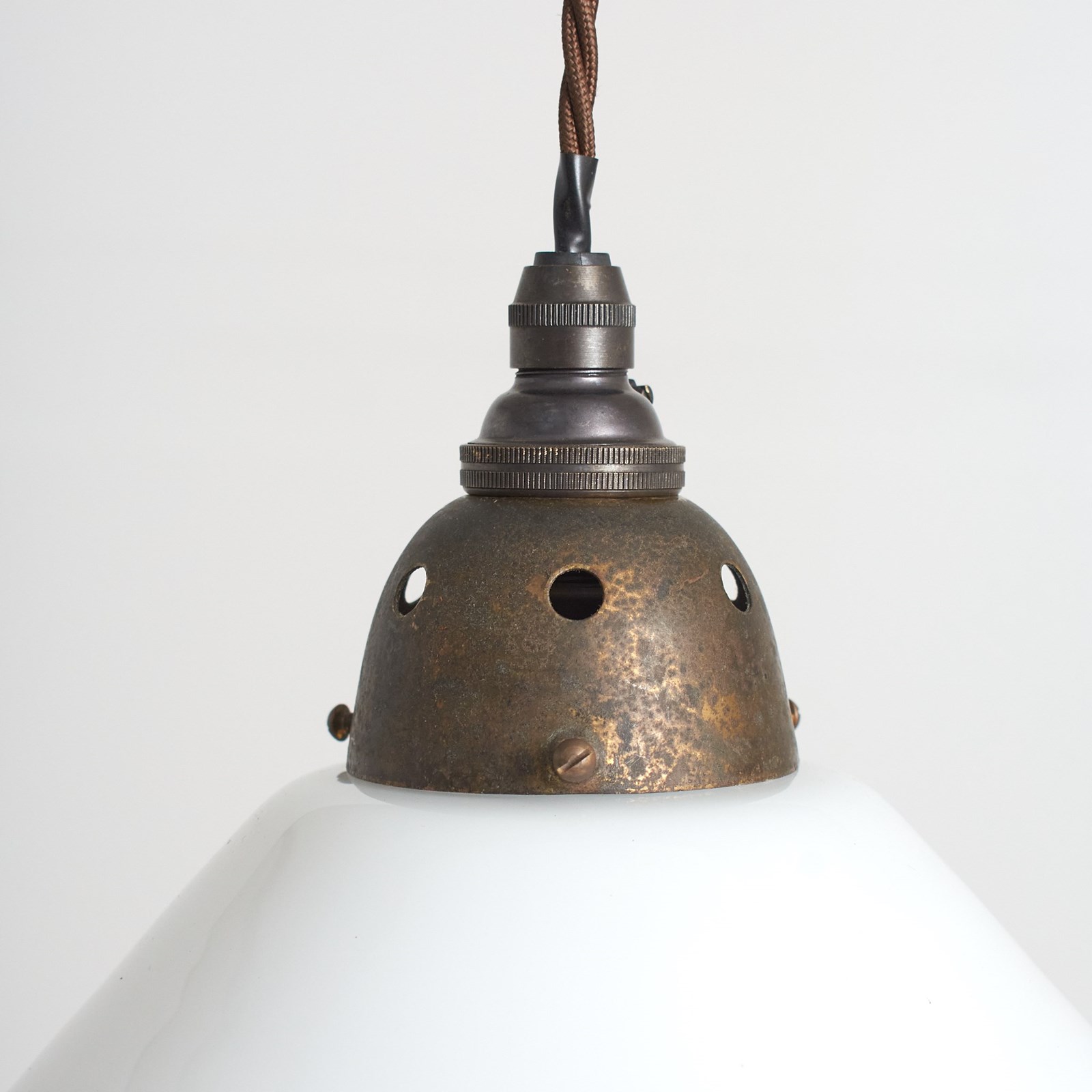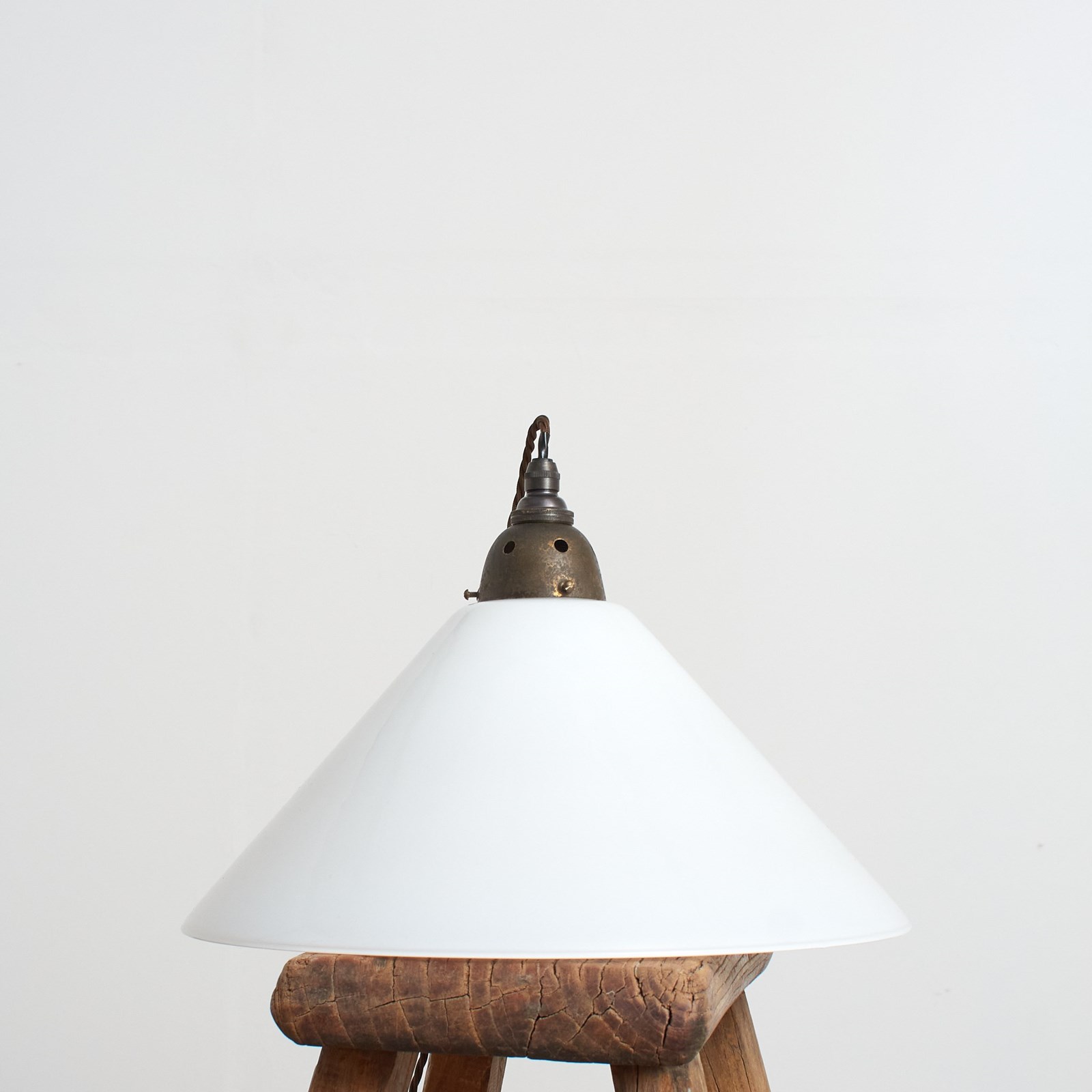 A larger than standard glass coolie pendant light. The conical milk glass shade has been hand spun from opaque glass. The light has an original antique aged brass gallery. Great as a task light in the kitchen or work room.