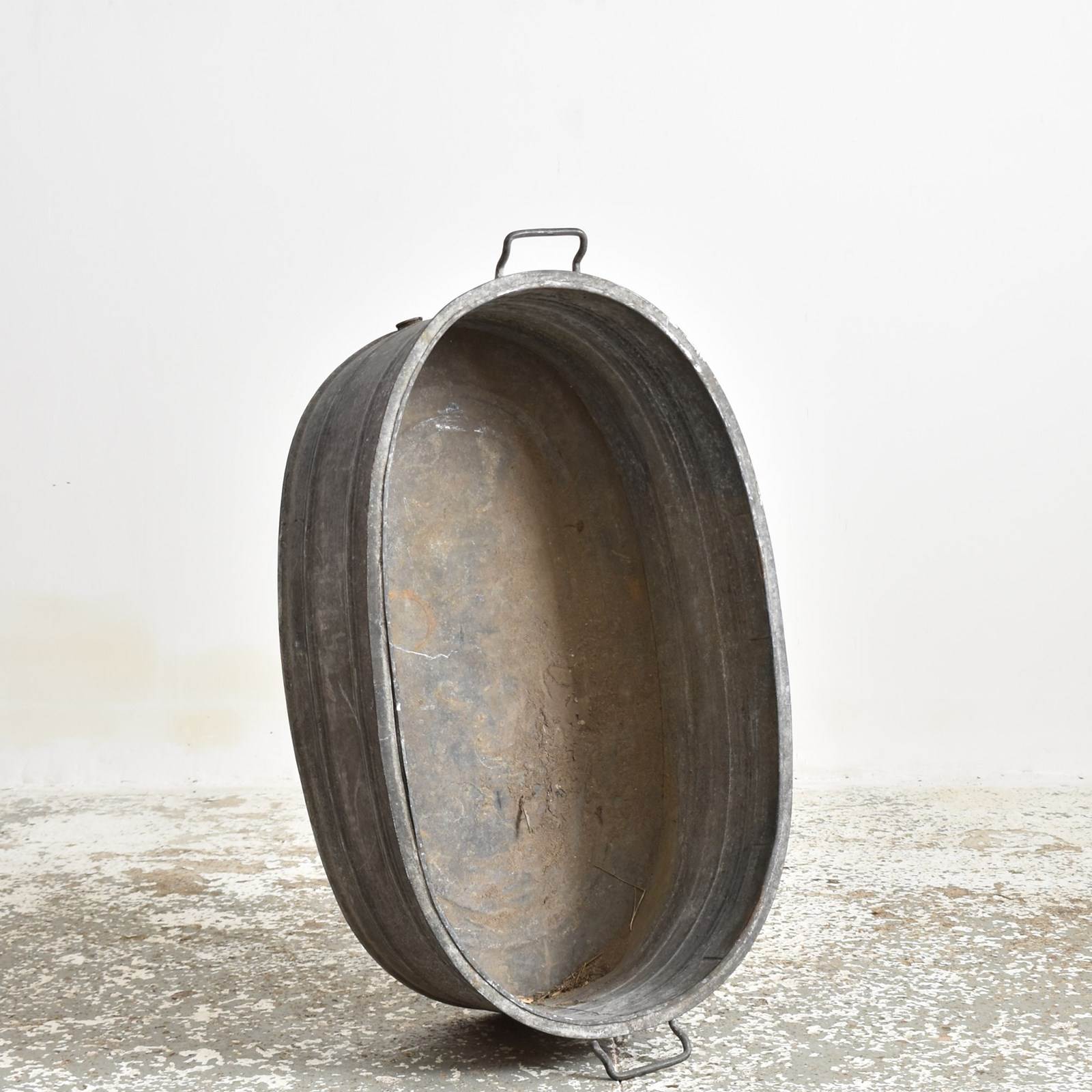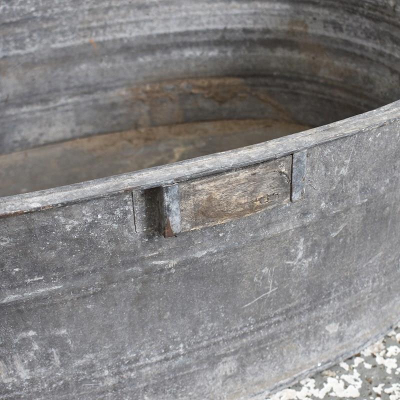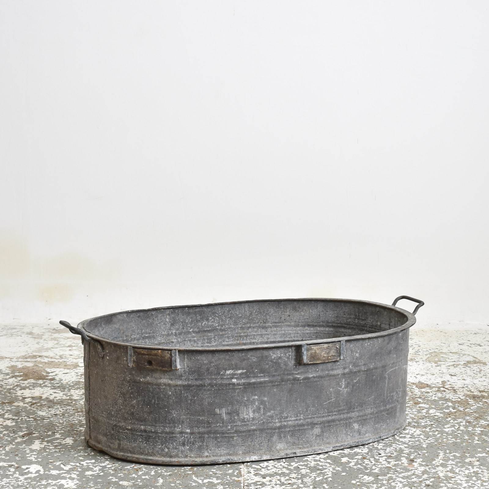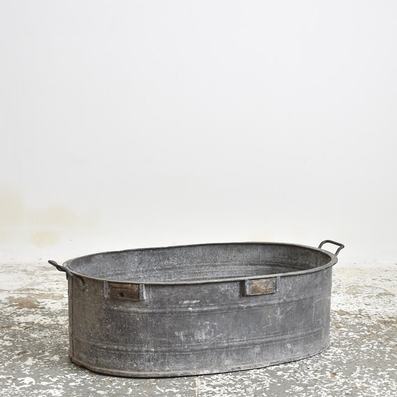 An oval shaped planter made from galvanised steel. The baths have straight sides and a curved lip. Each bath has a ribbed bands around the bath and a pair of carry handles. Perfect as a garden planter.