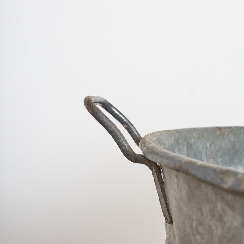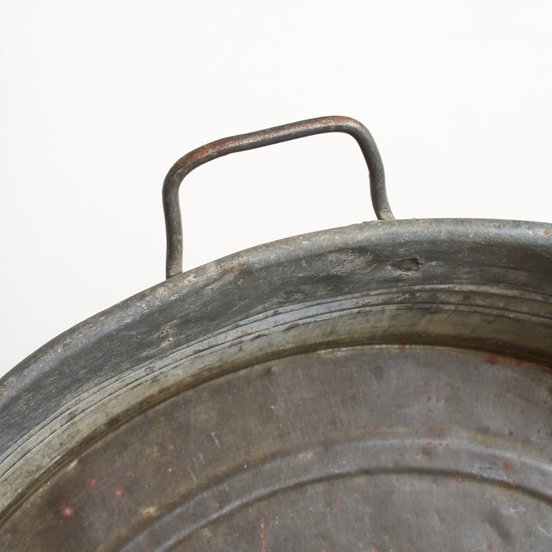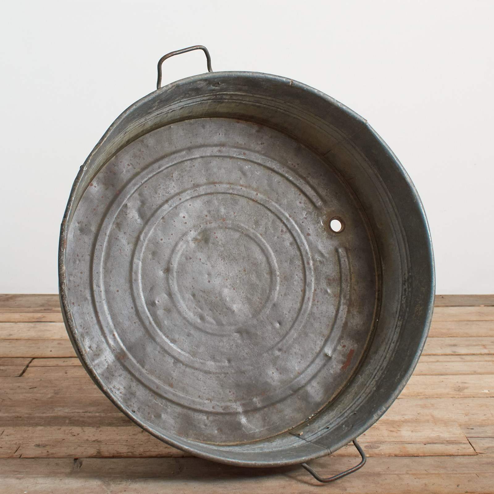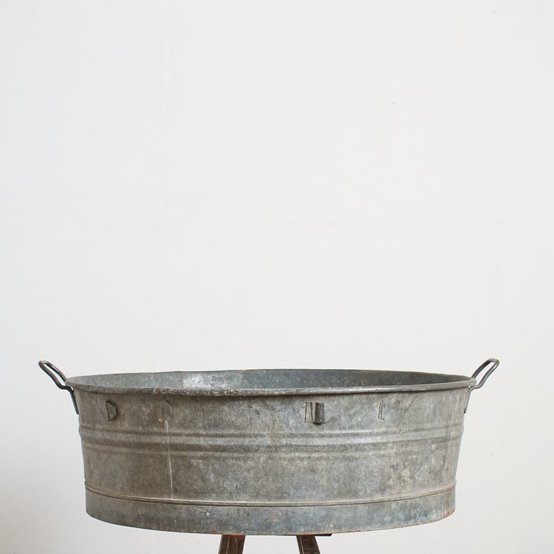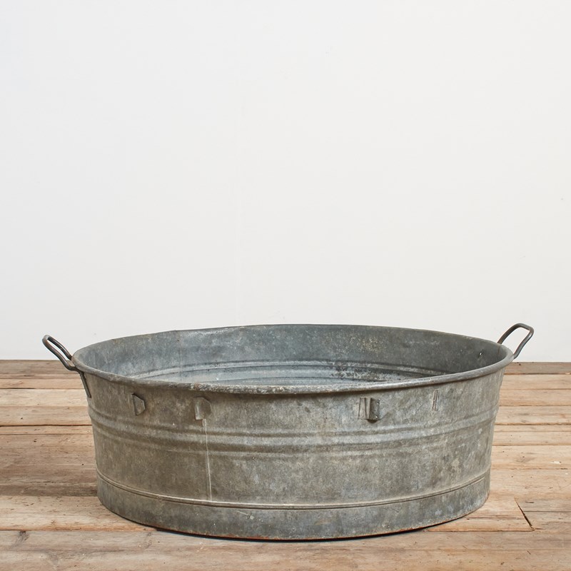 An unusual round shaped planter made from galvanised metal. Each bath has a ribbed band around the upper section and a pair of carry handles some have wooden brackets on the sides. Perfect as a garden planter, pond or dog bath.
