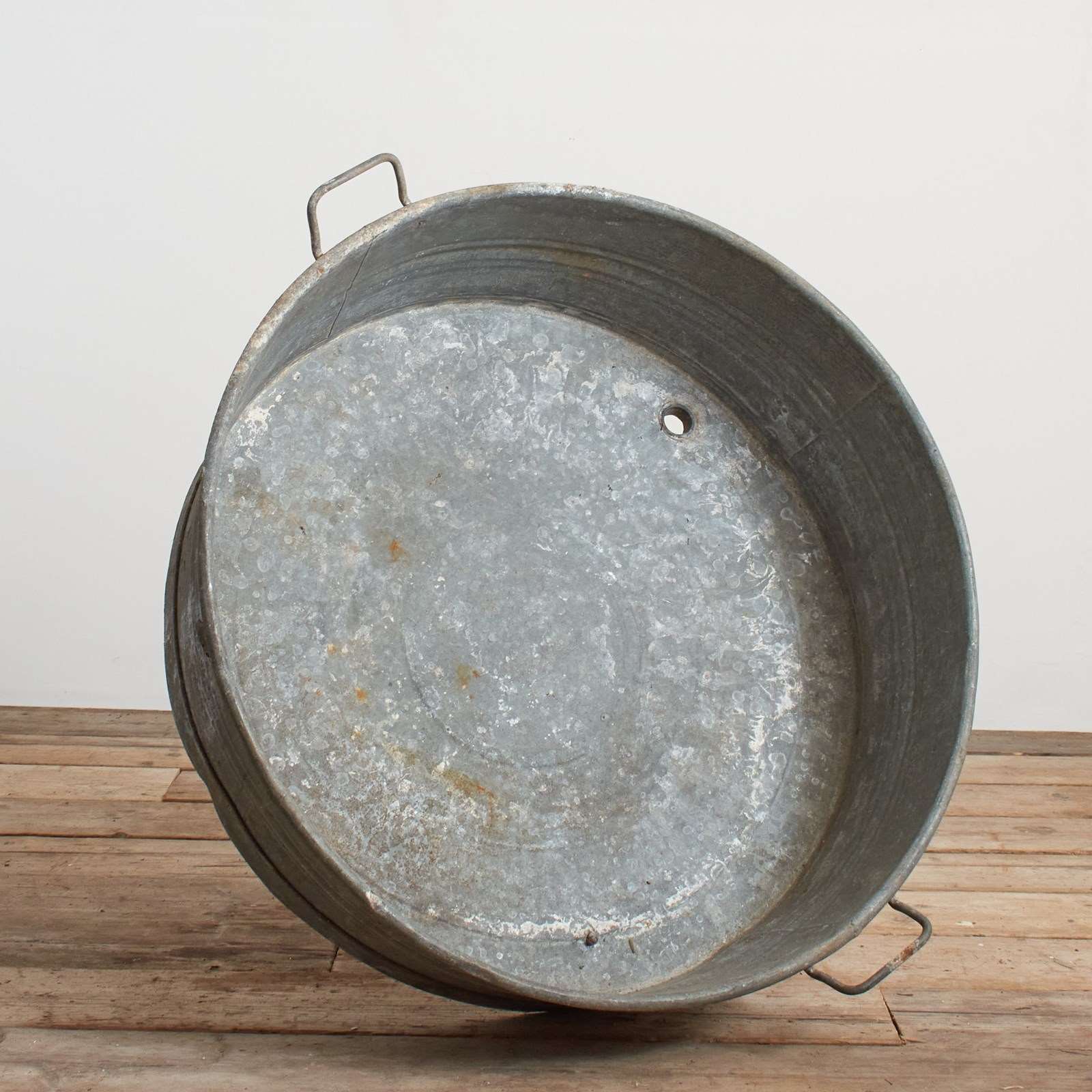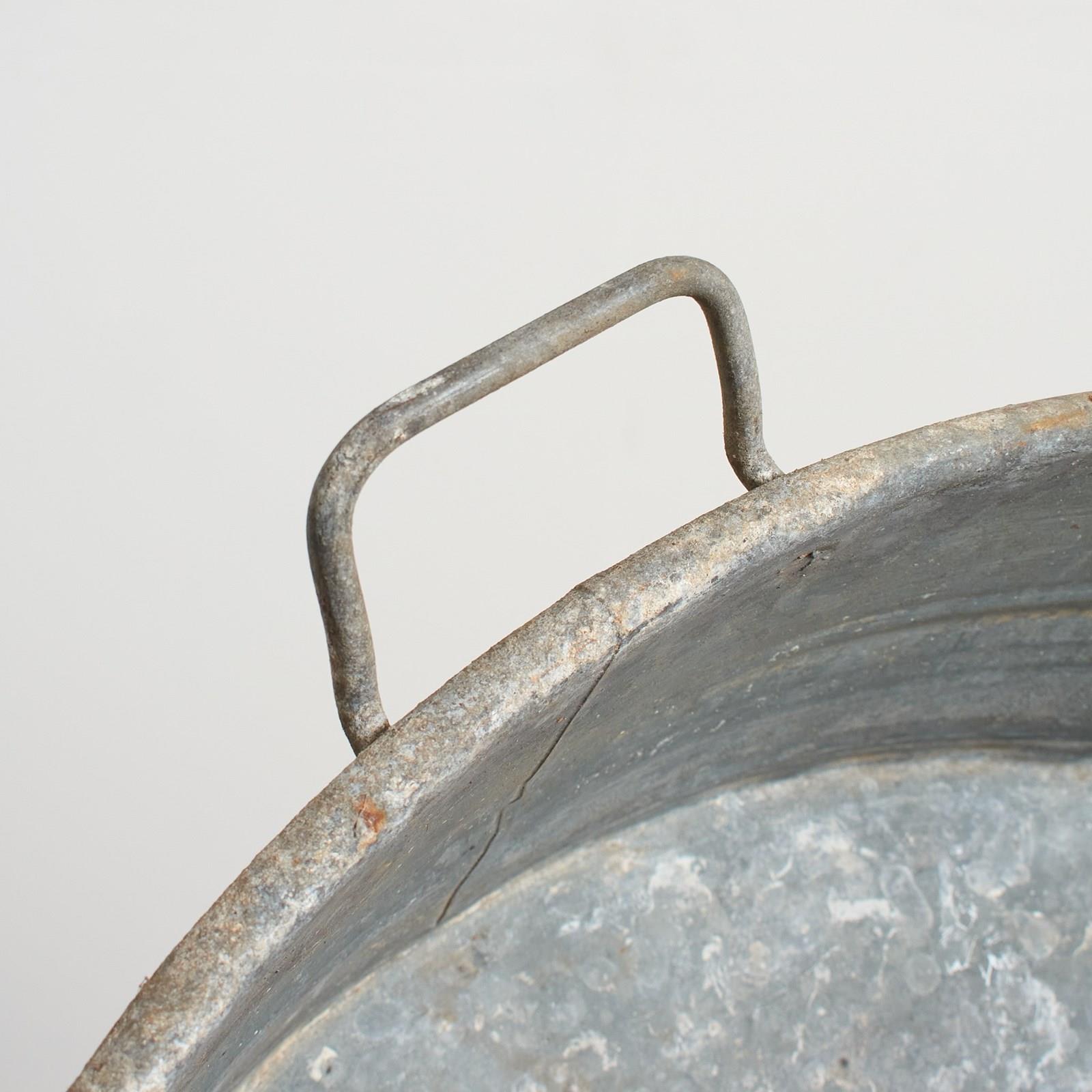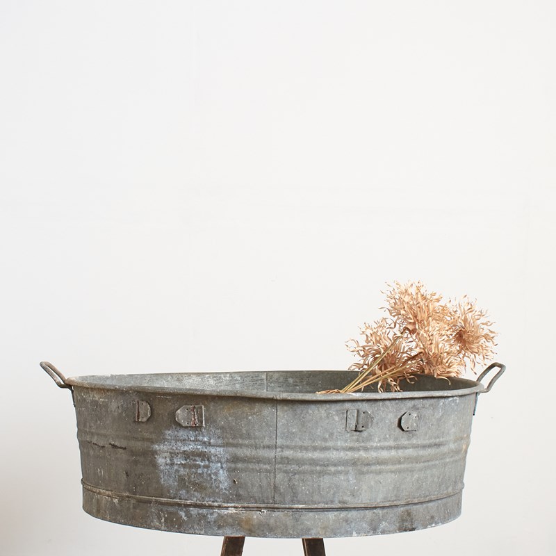 An unusual round shaped planter made from galvanised metal. Each bath has a ribbed band around the upper section and a pair of carry handles some have wooden brackets on the sides. Perfect as a garden planter, pond or dog bath.