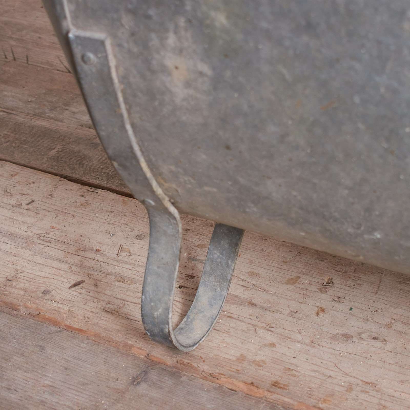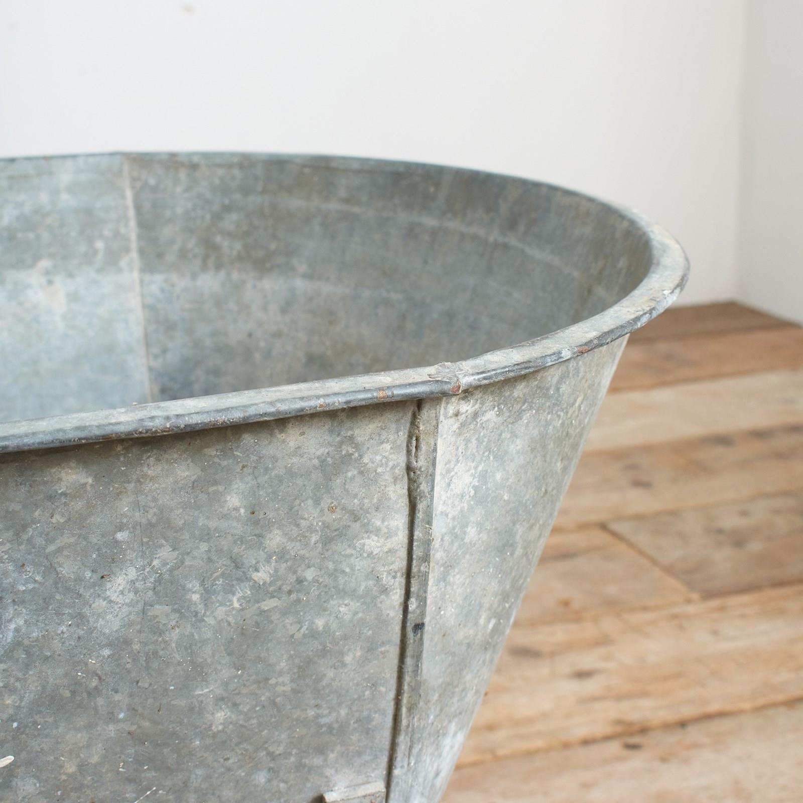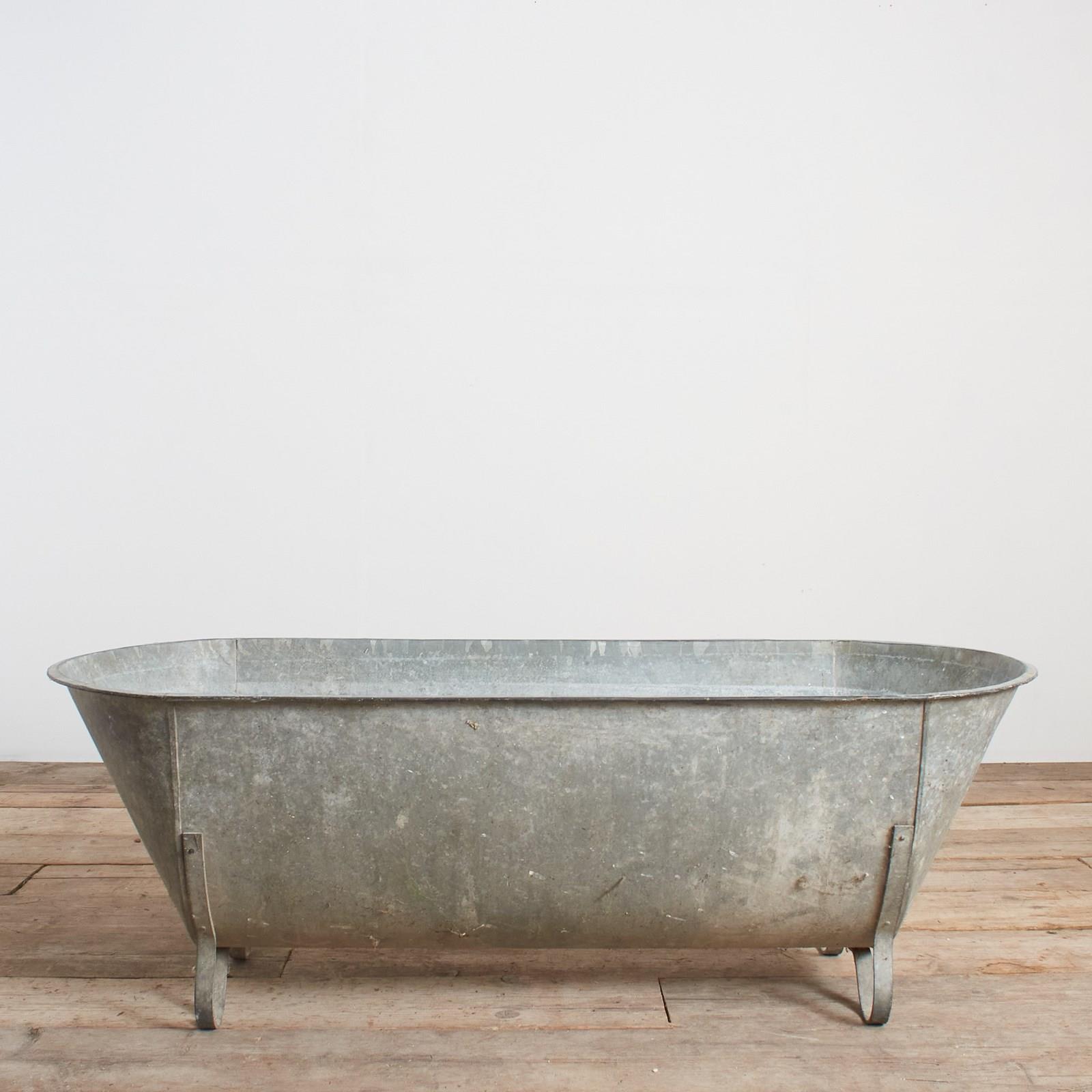 The bath tub is made of galvanised metal with galvanised feet.