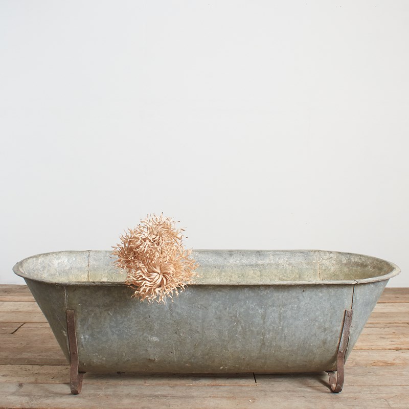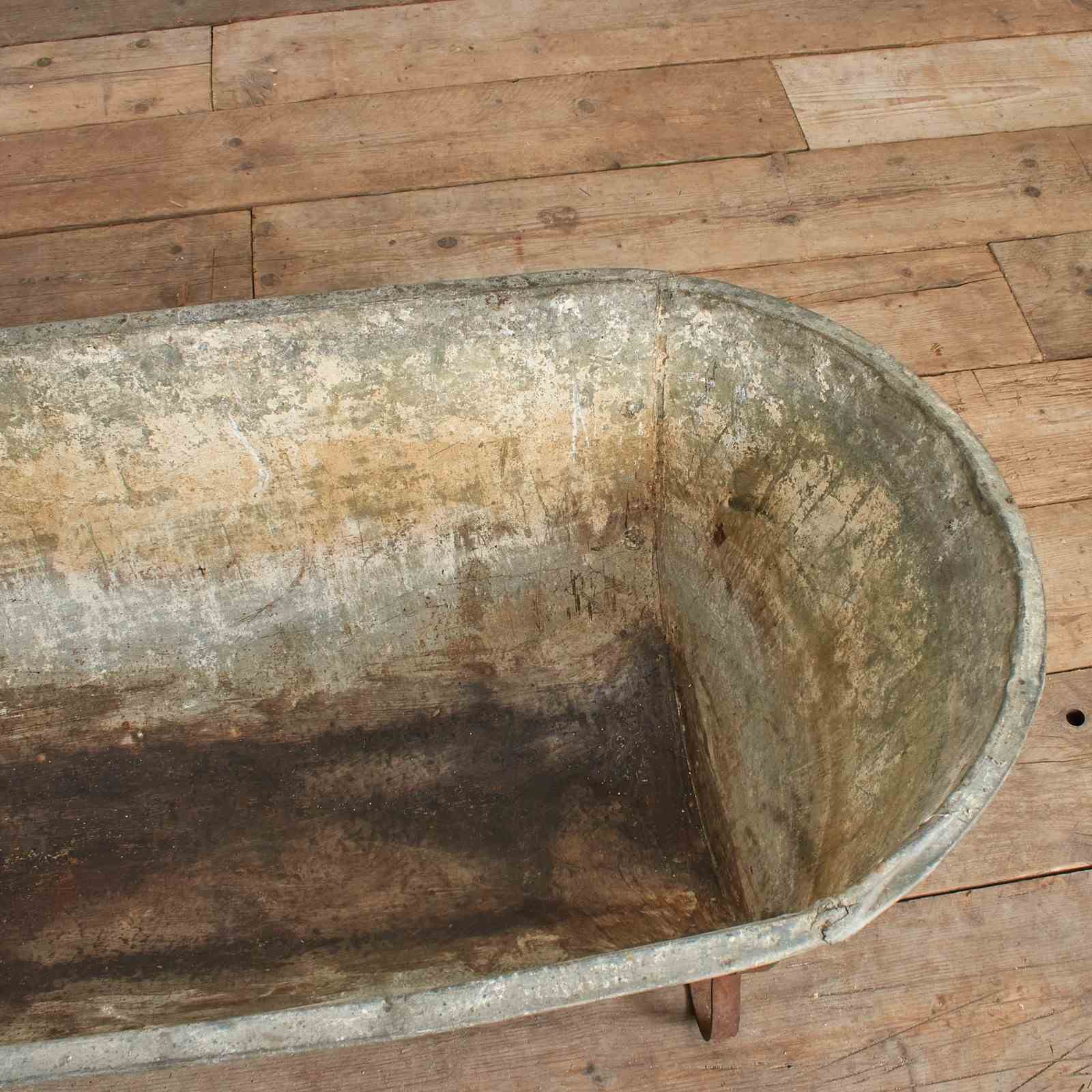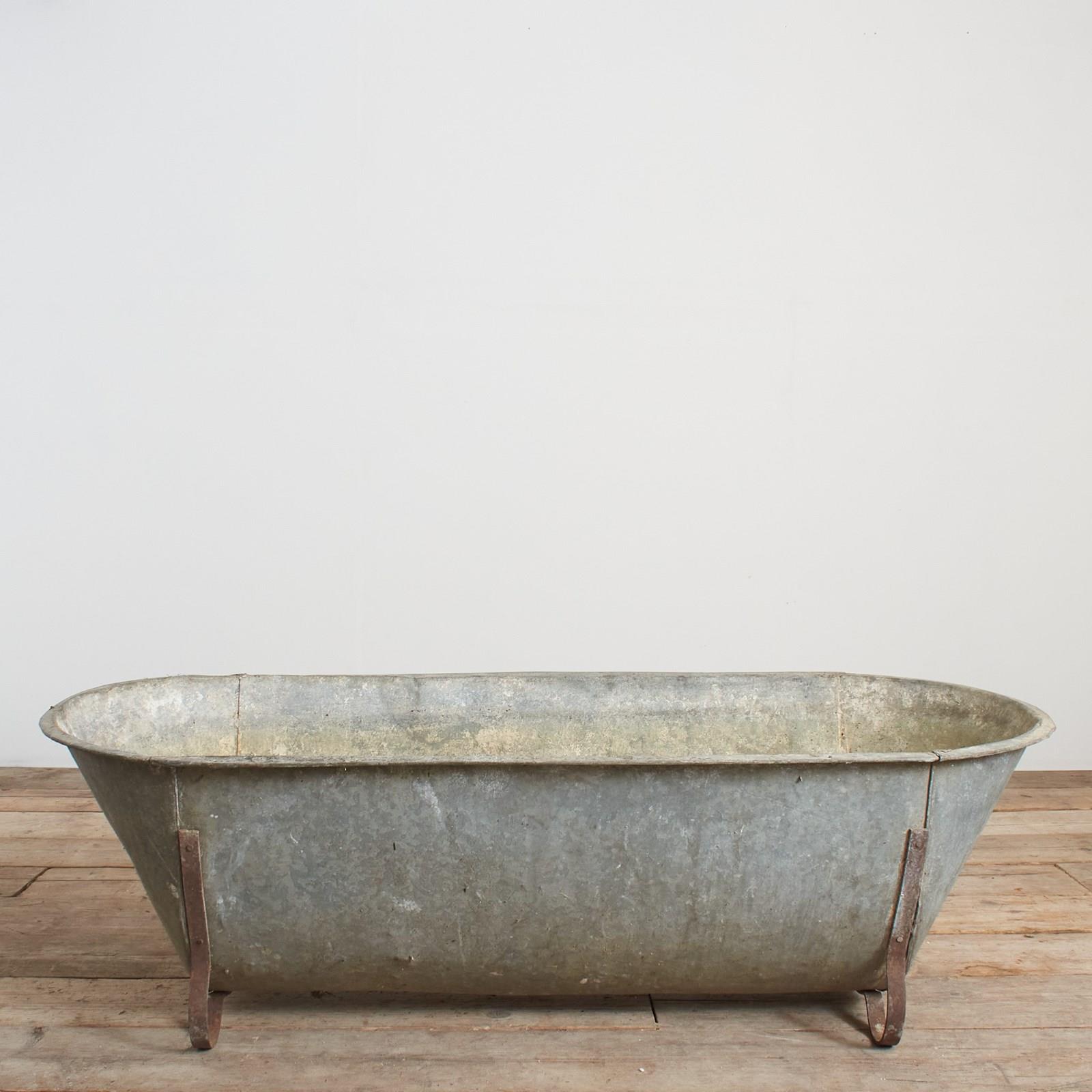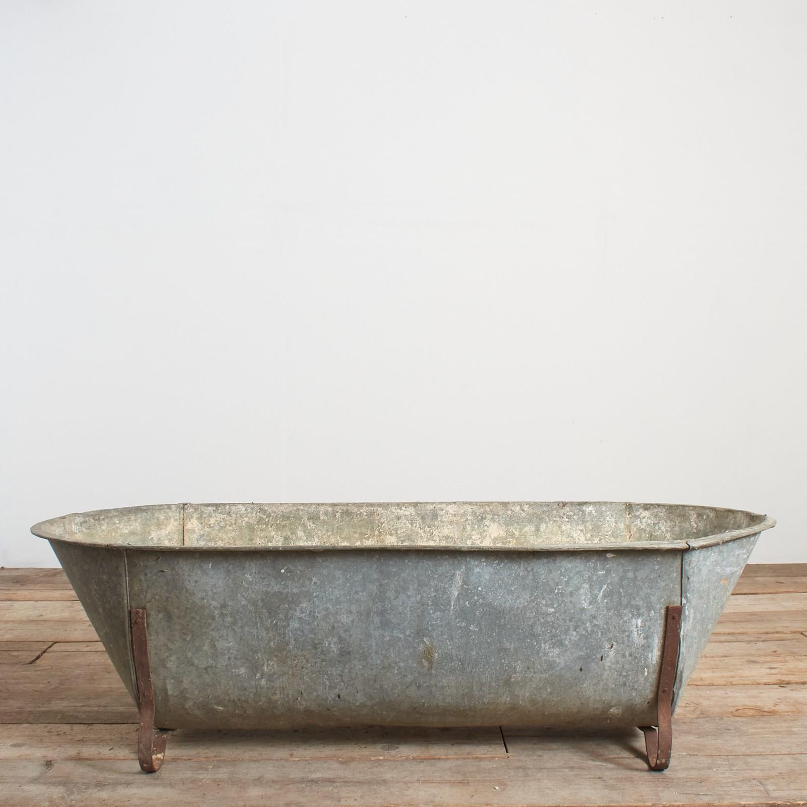 The bath tub is made of galvanised metal with galvanised feet.