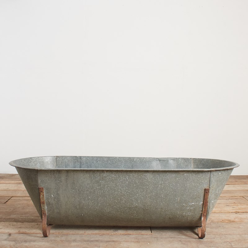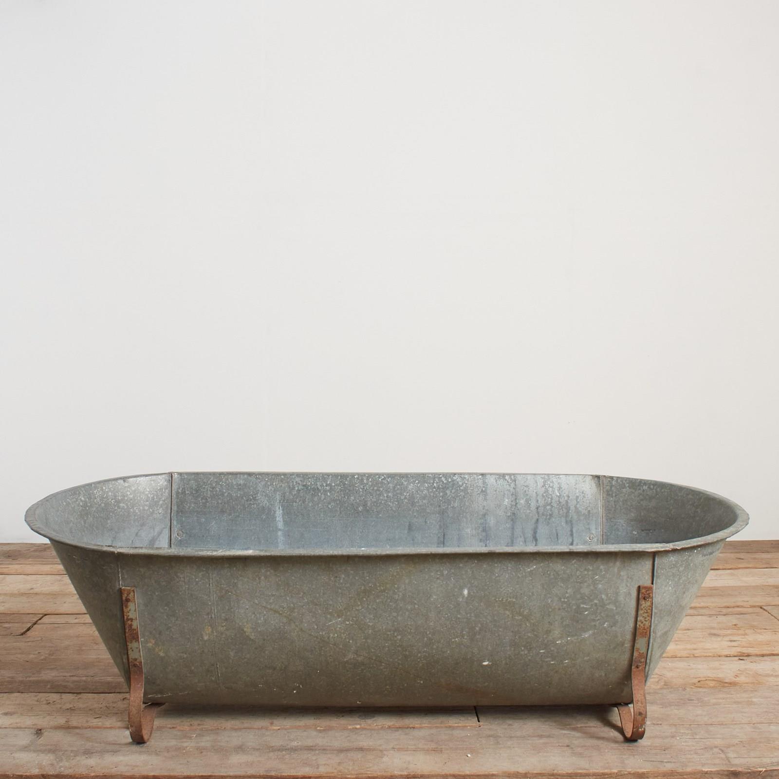 The bath tub is made of galvanised metal with galvanised feet.