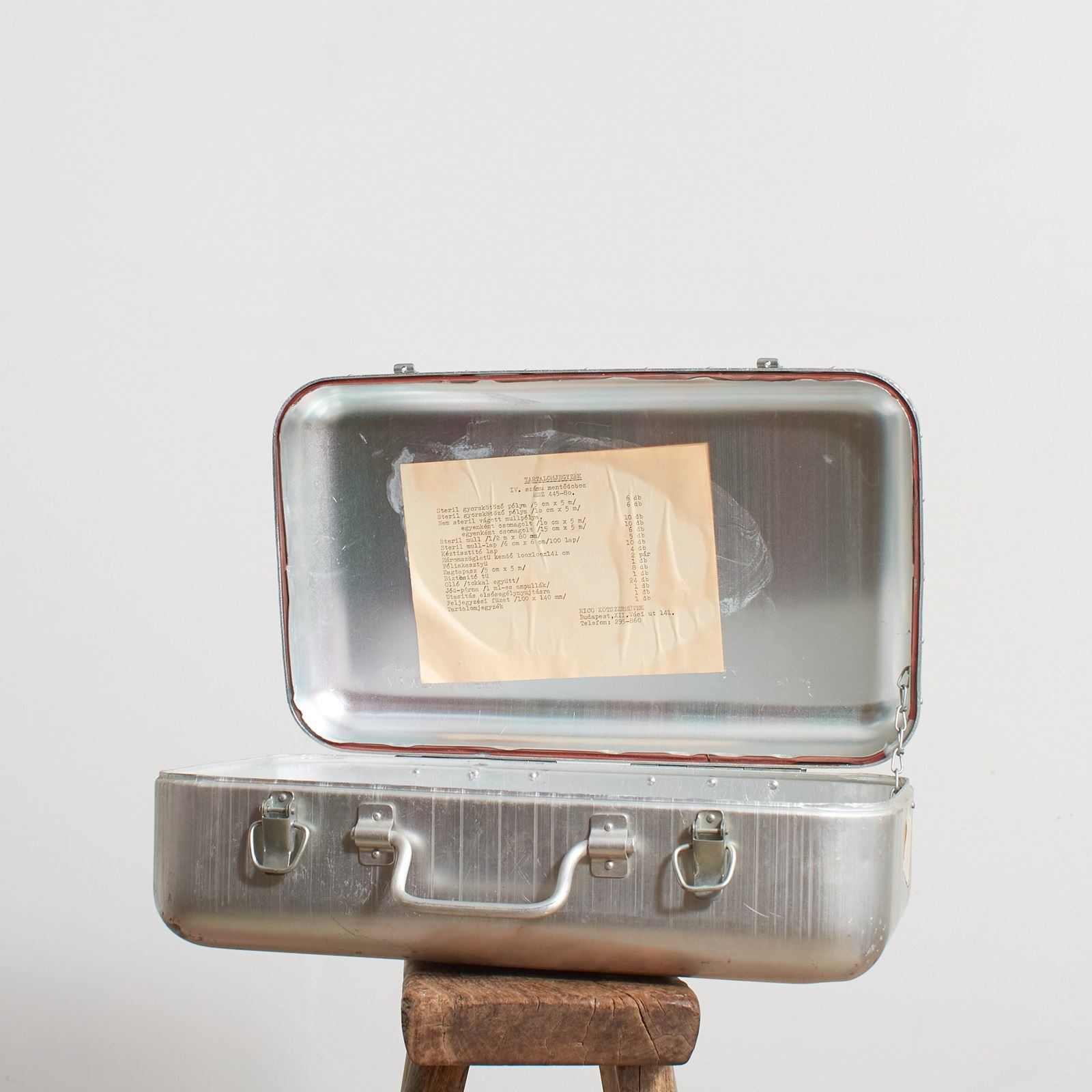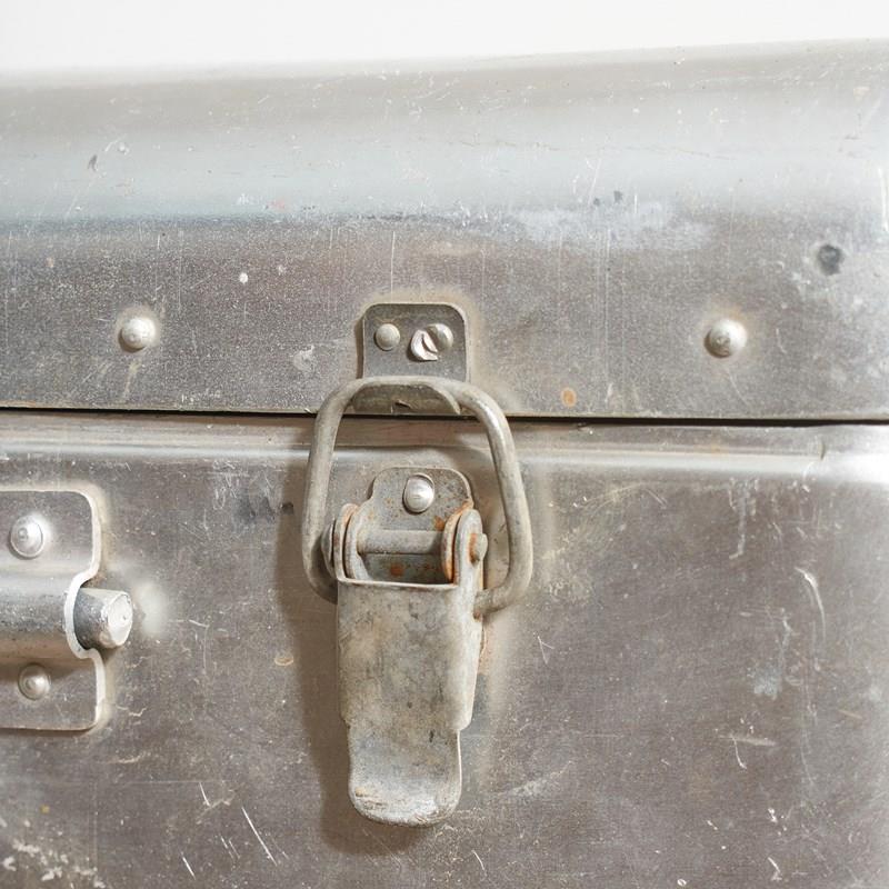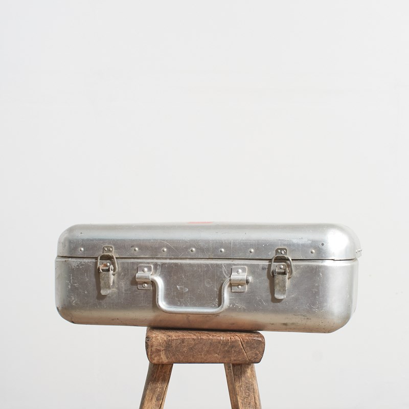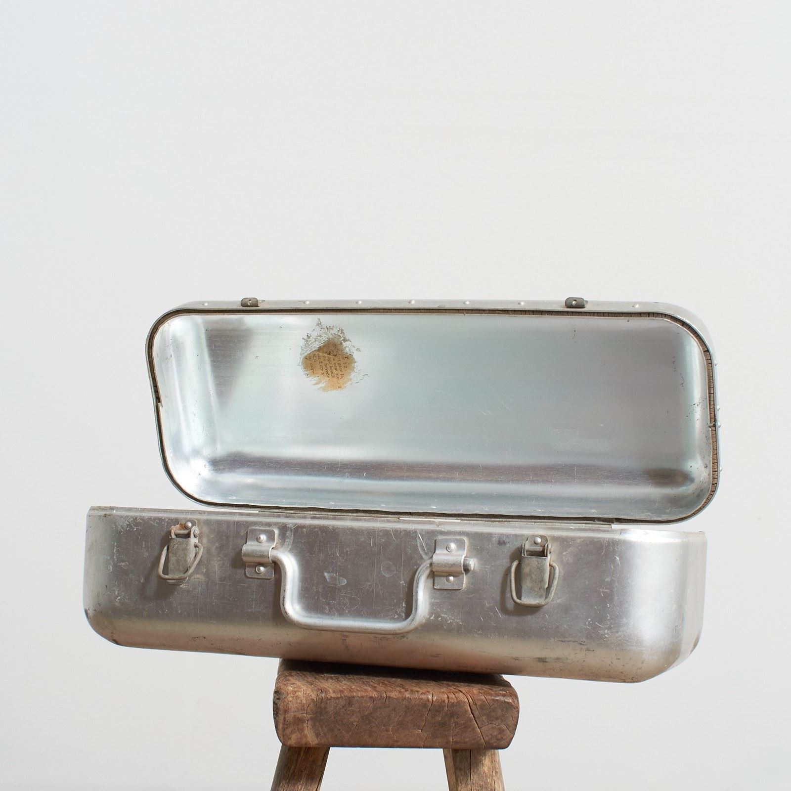 The box is made from aluminium with a clasp to open and close. A practical storage box which could be used for storing first aid items, craft materials, pens and pencils, the list is endless. The case retains its original red painted cross on the front.