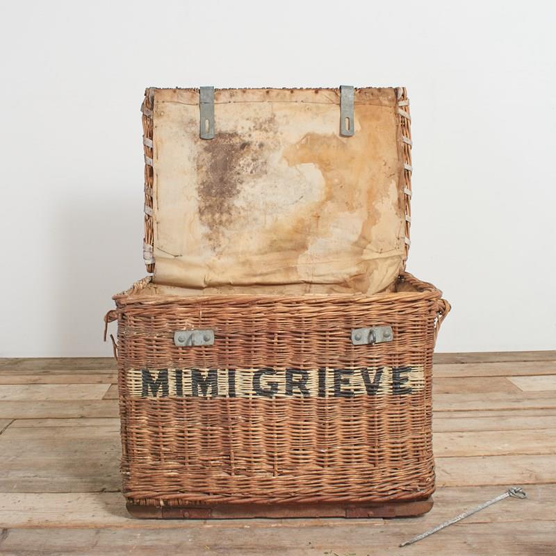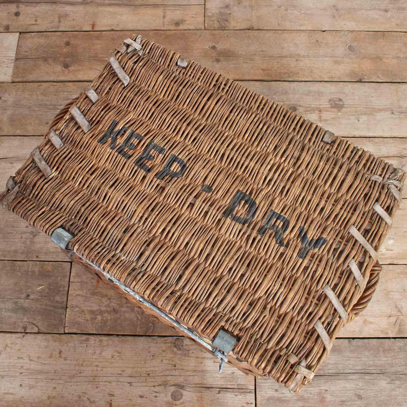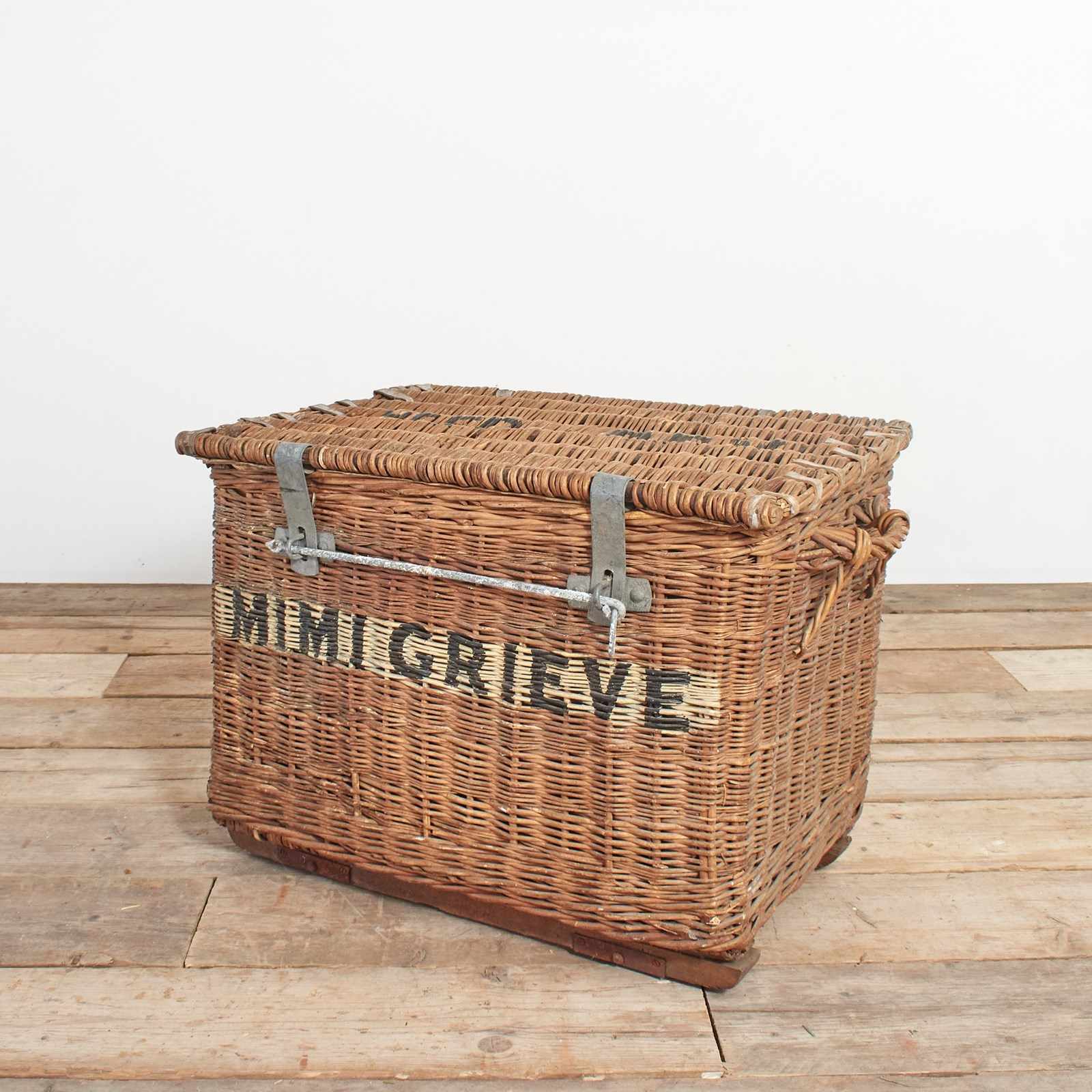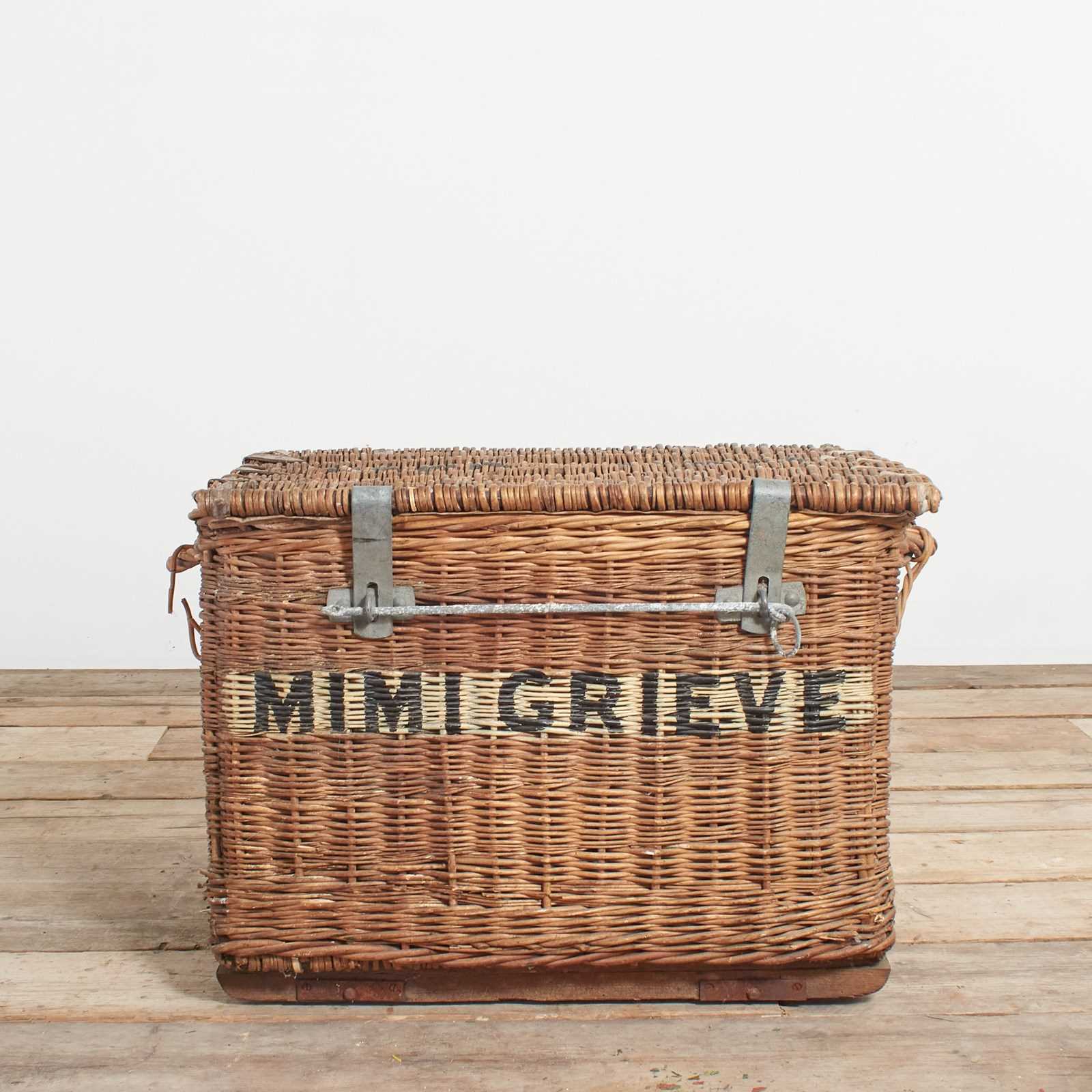 A fantastic wicker basket salvaged from a prop department. The basket retains possibly its original owners name stencilled on the front and has ‘Keep Dry’ on the lid so it could have originally been used as a travelling trunk. The basket has wicker carry handles at each end and the lid is secured with its original steel bar. The basket stands on wooden base slats. Internally it retains its original cream fabric lining and there are some old copies of ‘The Stage’ newspaper from 1954 used to line the base of the basket. There are also some inner support straps.