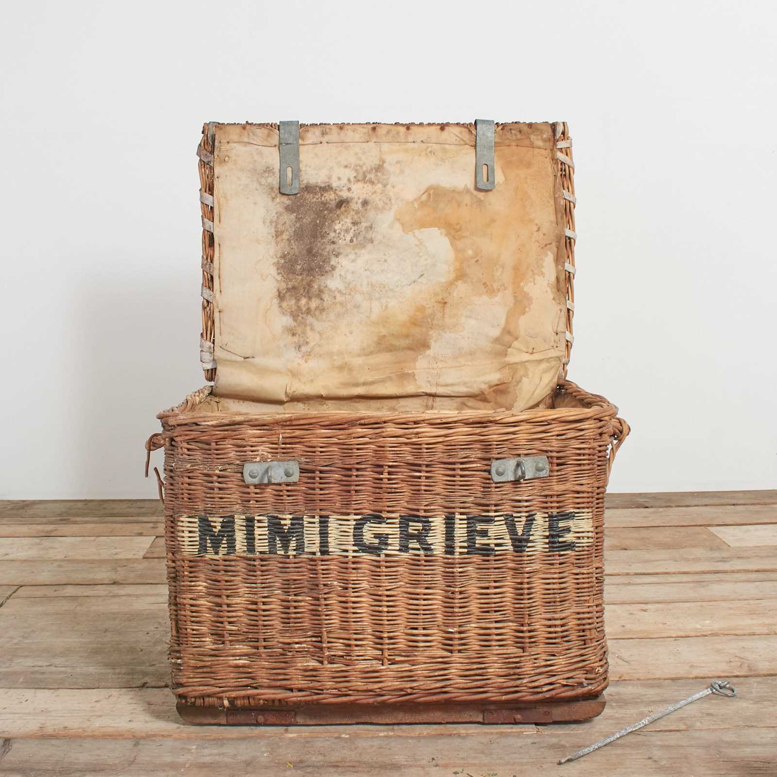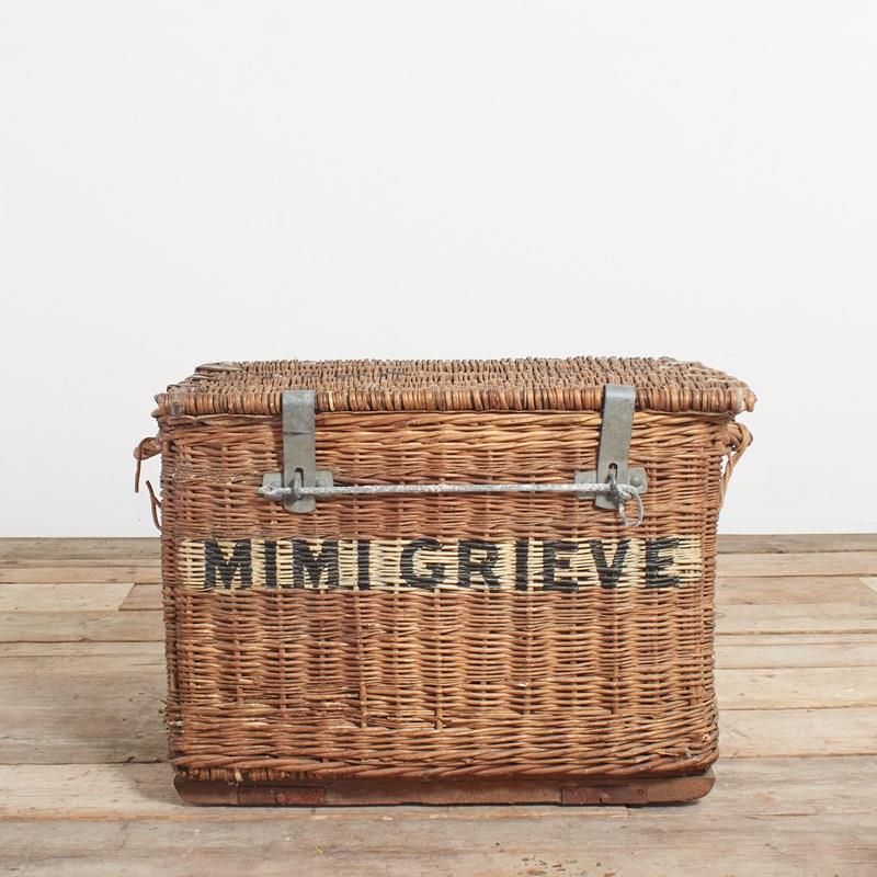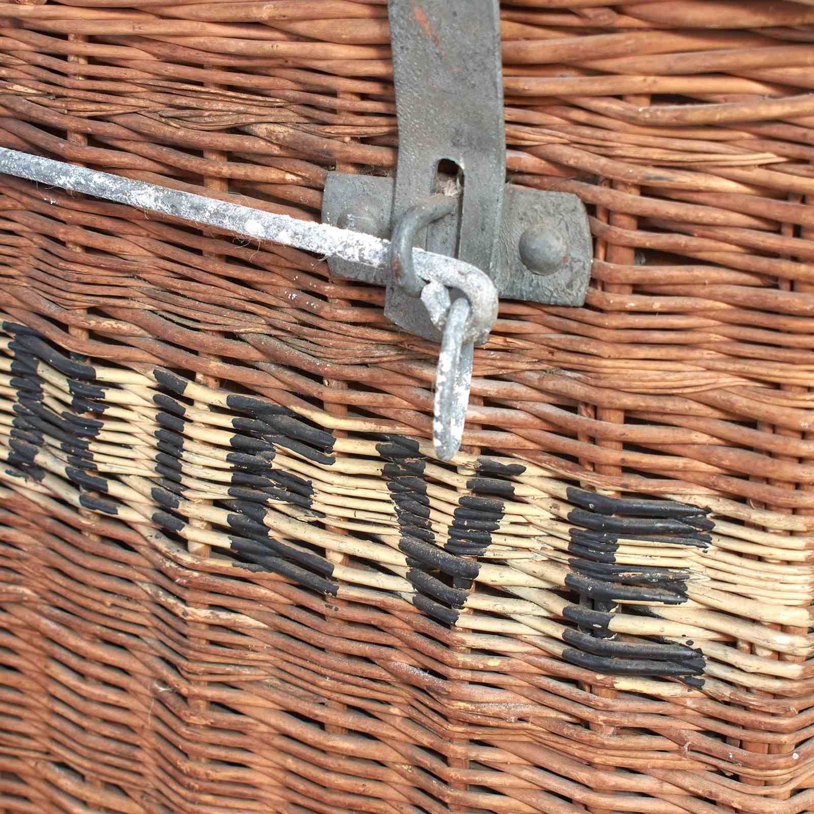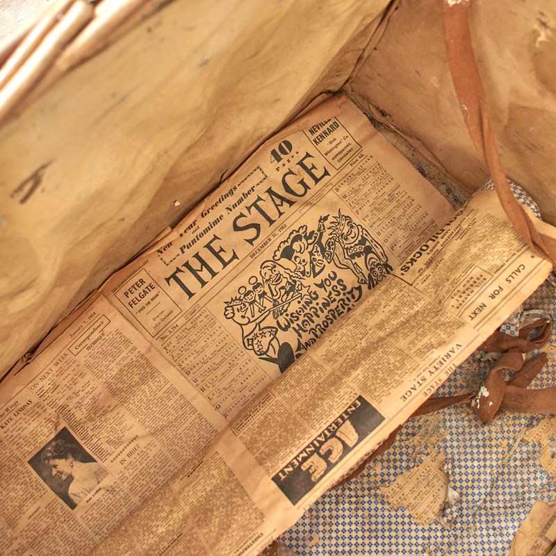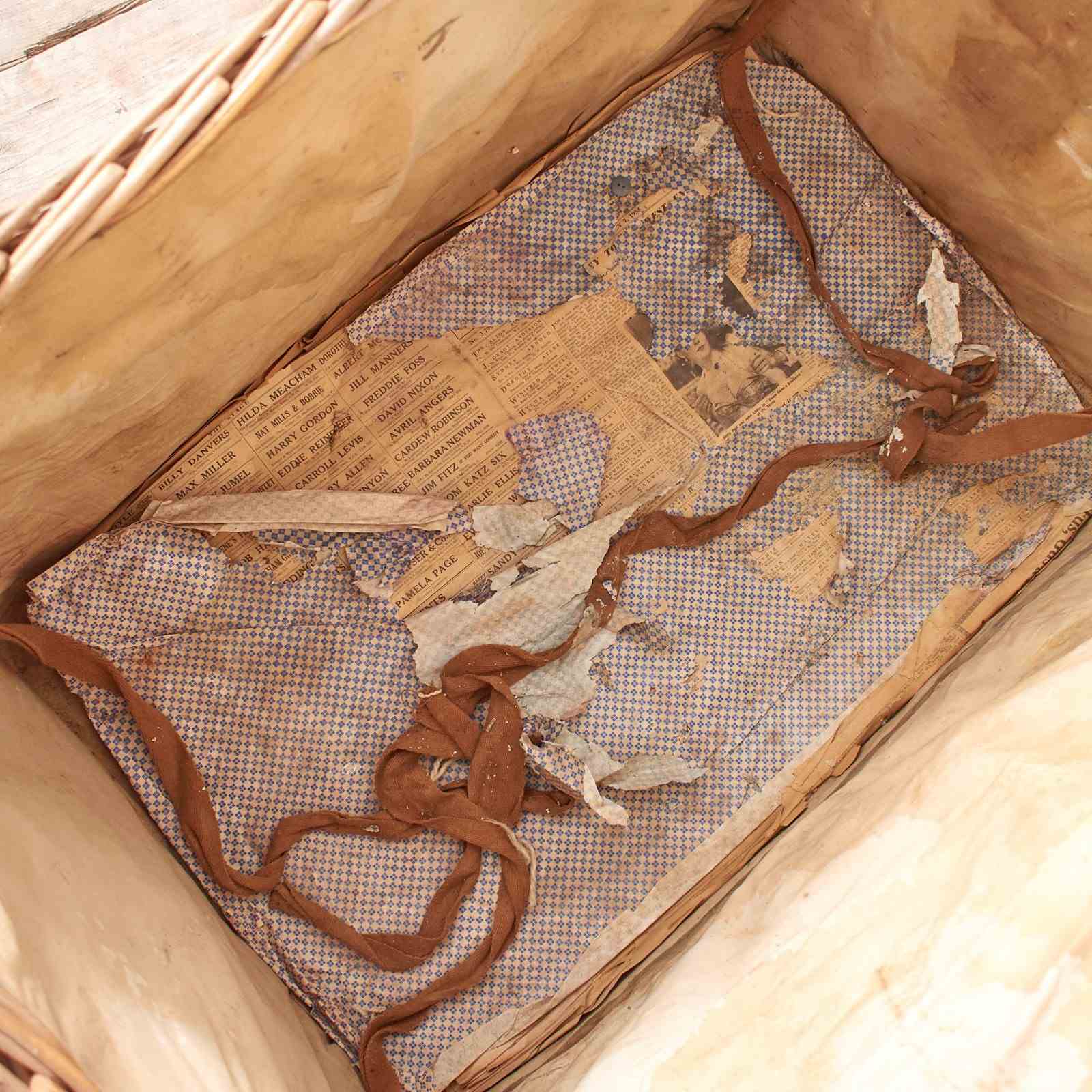 A fantastic wicker basket salvaged from a prop department. The basket retains possibly its original owners name stencilled on the front and has ‘Keep Dry’ on the lid so it could have originally been used as a travelling trunk. The basket has wicker carry handles at each end and the lid is secured with its original steel bar. The basket stands on wooden base slats. Internally it retains its original cream fabric lining and there are some old copies of ‘The Stage’ newspaper from 1954 used to line the base of the basket. There are also some inner support straps.
