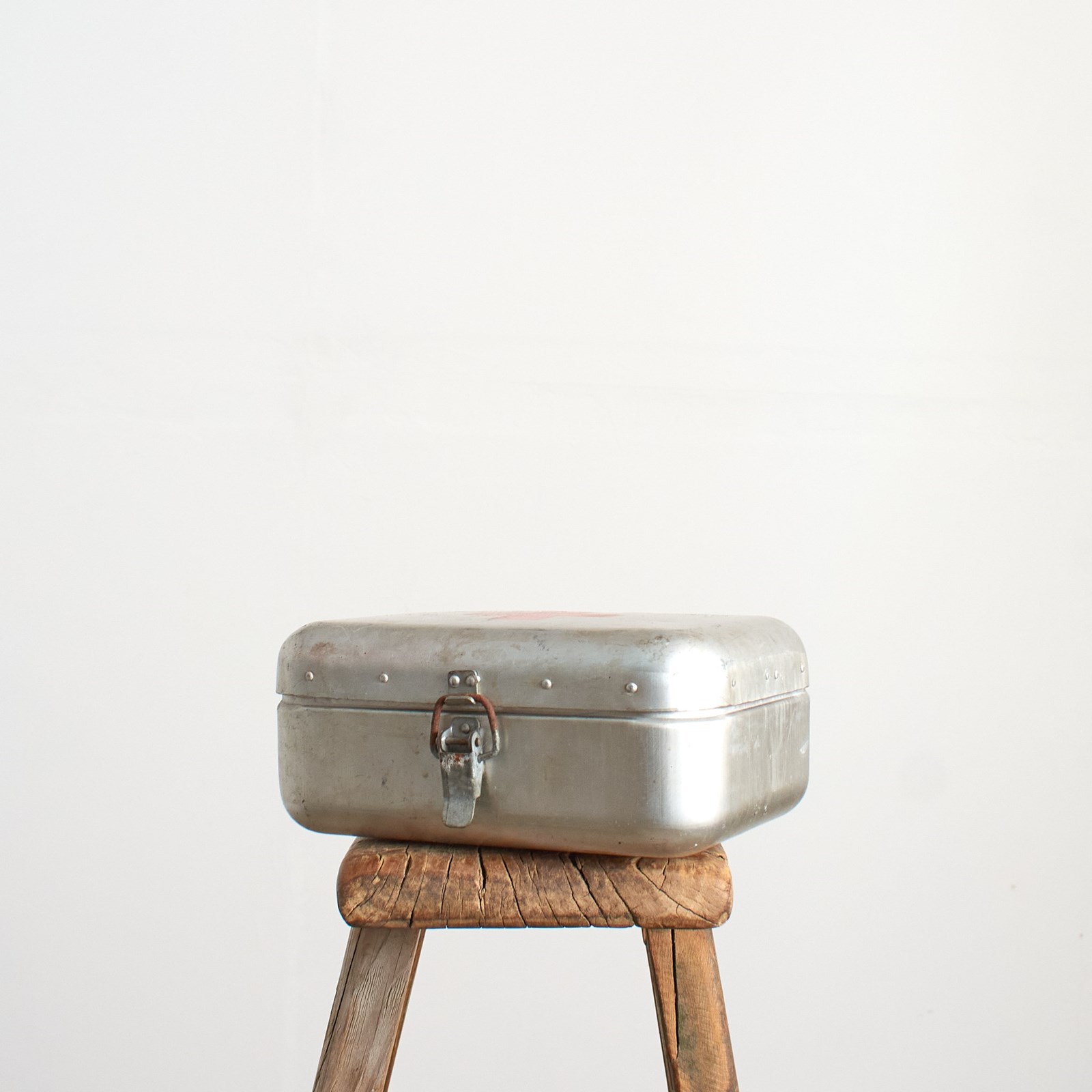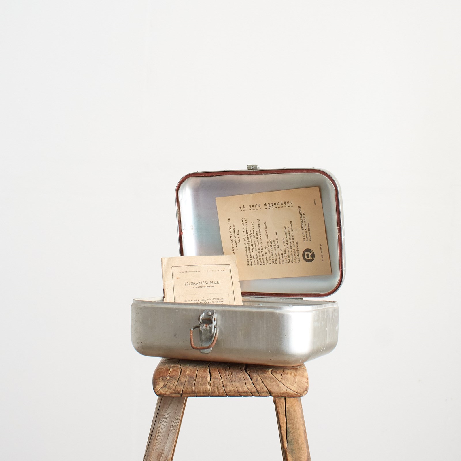 A unique first aid box believed to have been formerly used by the Hungarian military. The box is made from aluminium with a clasp to open and close. A practical storage box which could be used for storing first aid items, craft materials, pens and pencils, the list is endless. The case retains its original red painted cross on the front.
