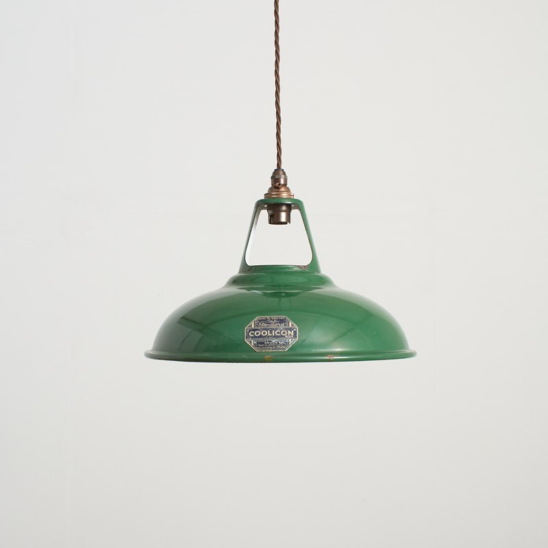 Early English factory shades by ‘Coolicon’ salvaged from an old factory storeroom where they have been sat untouched for the past 70 years. The shades are green in colour all in excellent condition with their original navy makers label. Vitreous enamelled spun steel, the light shades have side vents to allow uplighting.