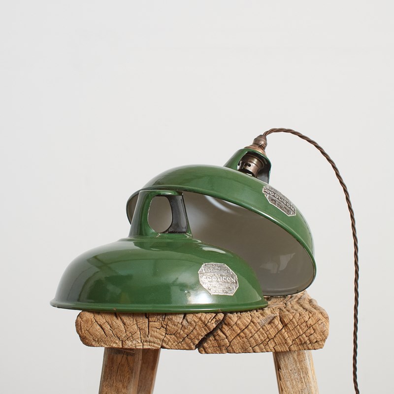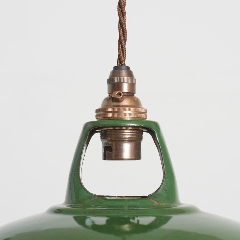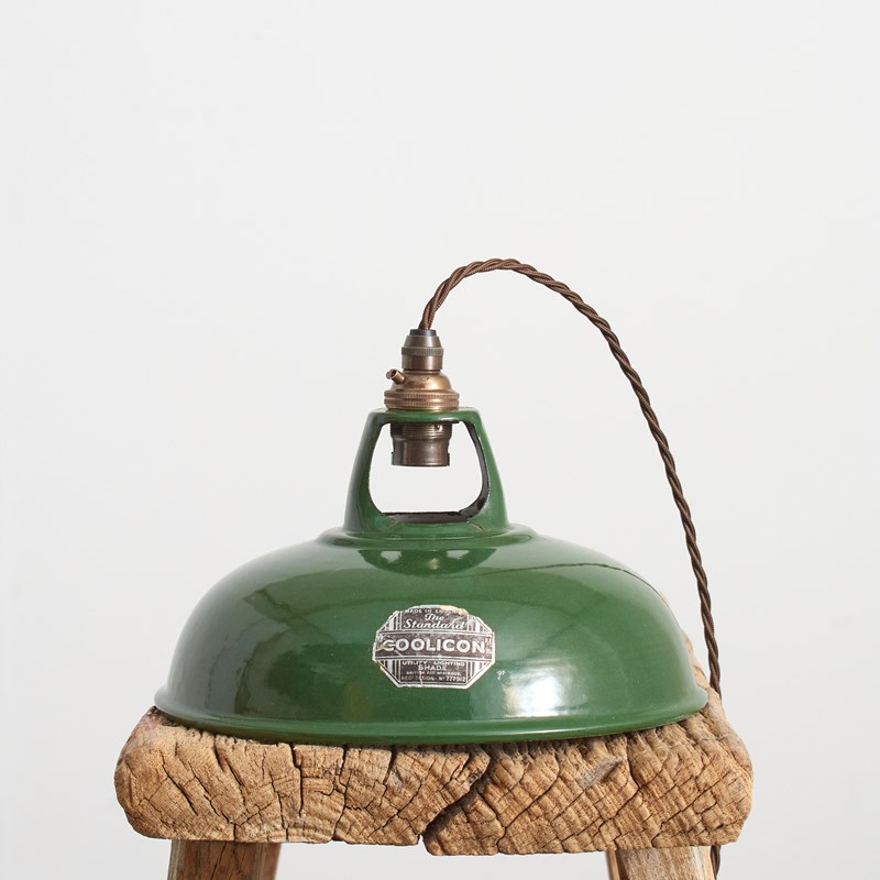 Original Antique 9″ Green Coolicon Enamel Pendant Light -D
