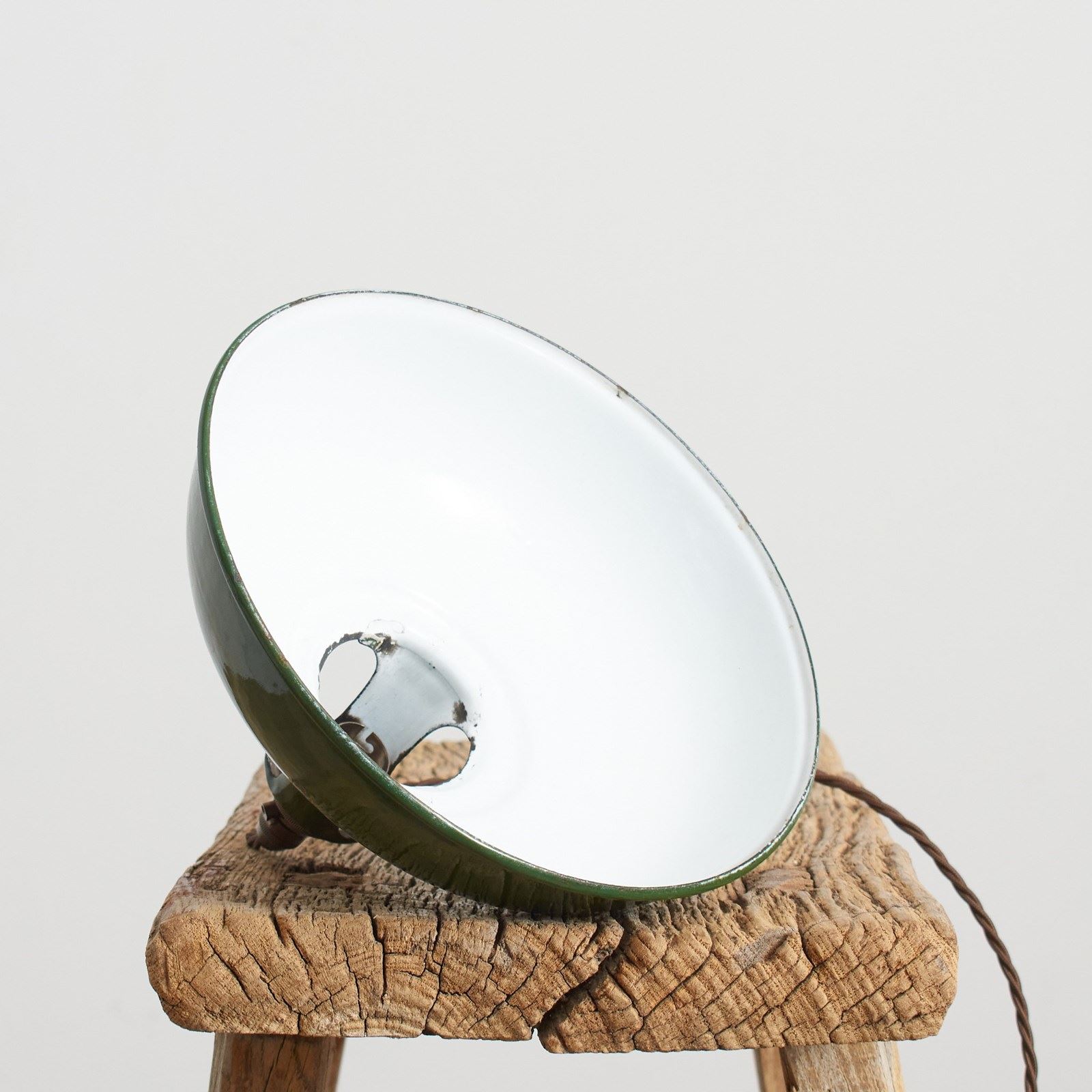 An early English factory shade by ‘Coolicon’ salvaged from an old factory. Vitreous enamelled spun steel, the light shade has side vents to allow uplighting.