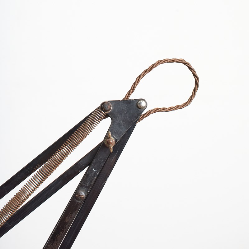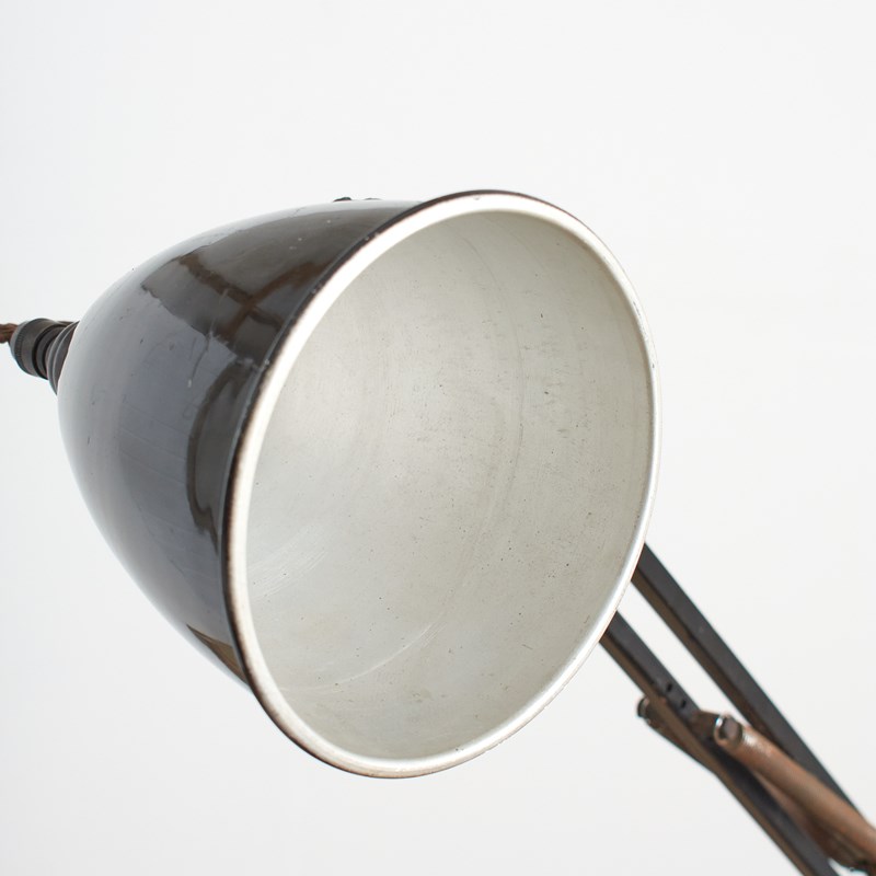 Workshop Report: This lamp is in its original condition, lightly cleaned and waxed. There is some paint wear in places and a few minor dings to the shade, The Lamp retains its original black paint and crinkle paint to the base with wear in places. It has been rewired with 2.5m twisted brown flex and a CE certified bayonet bulbholder and 3 pin UK Plug. Lamp has been PAT tested.