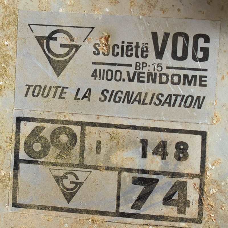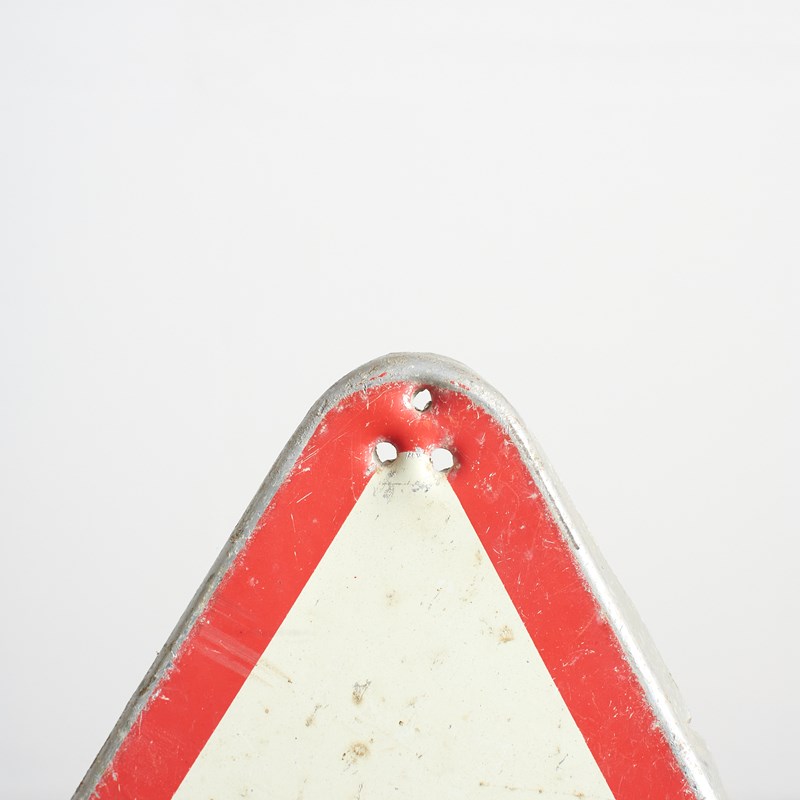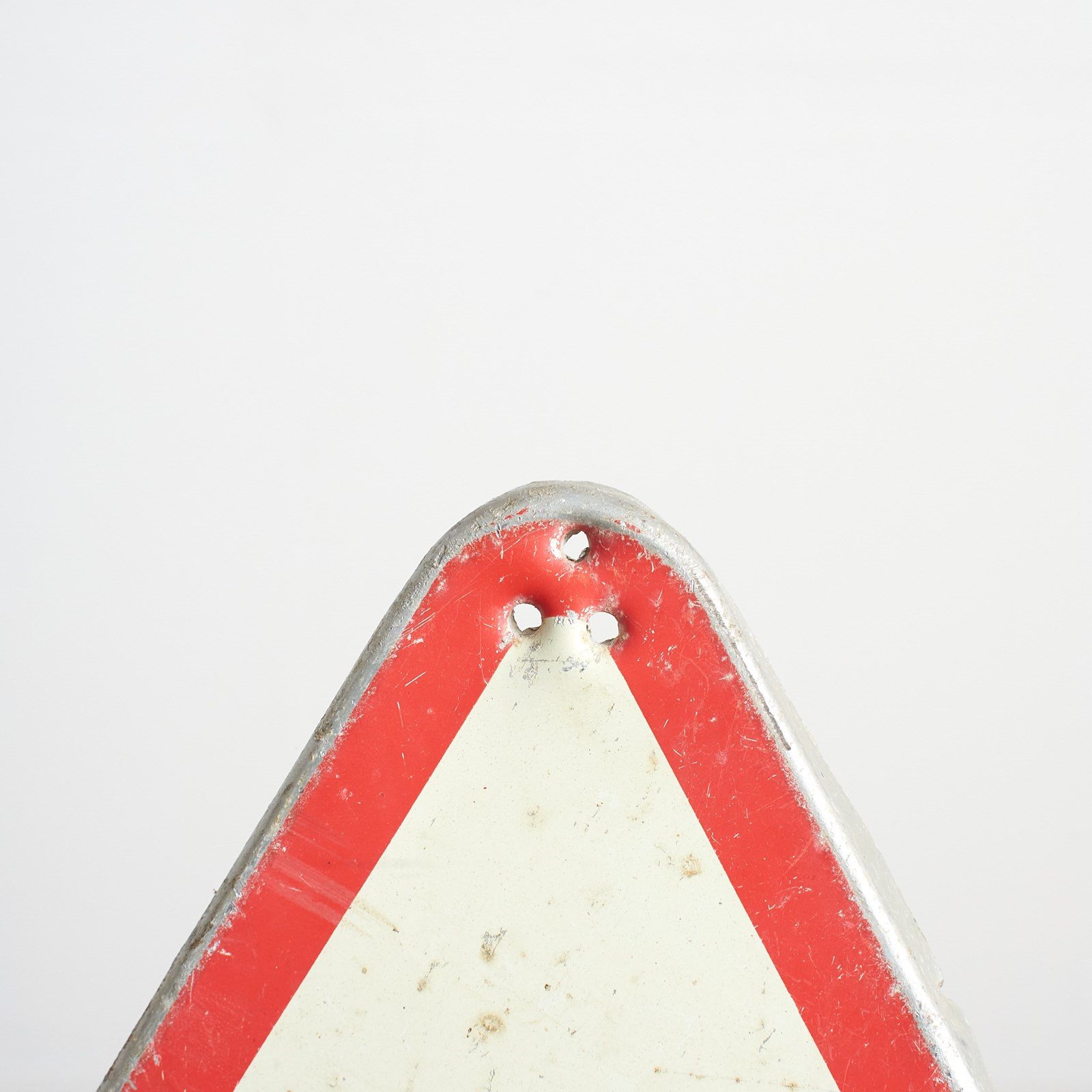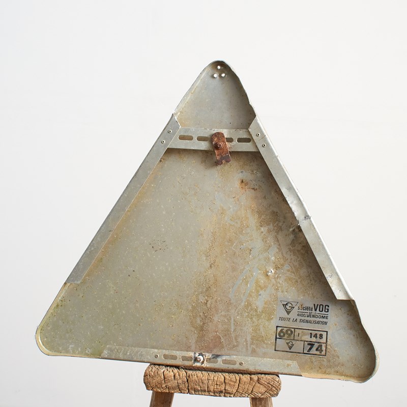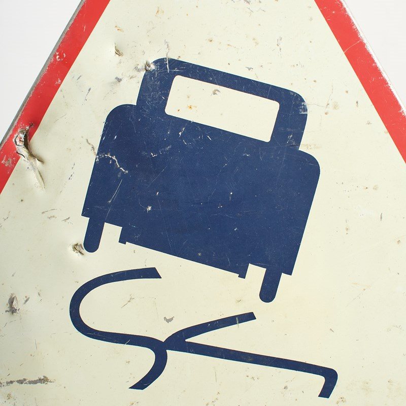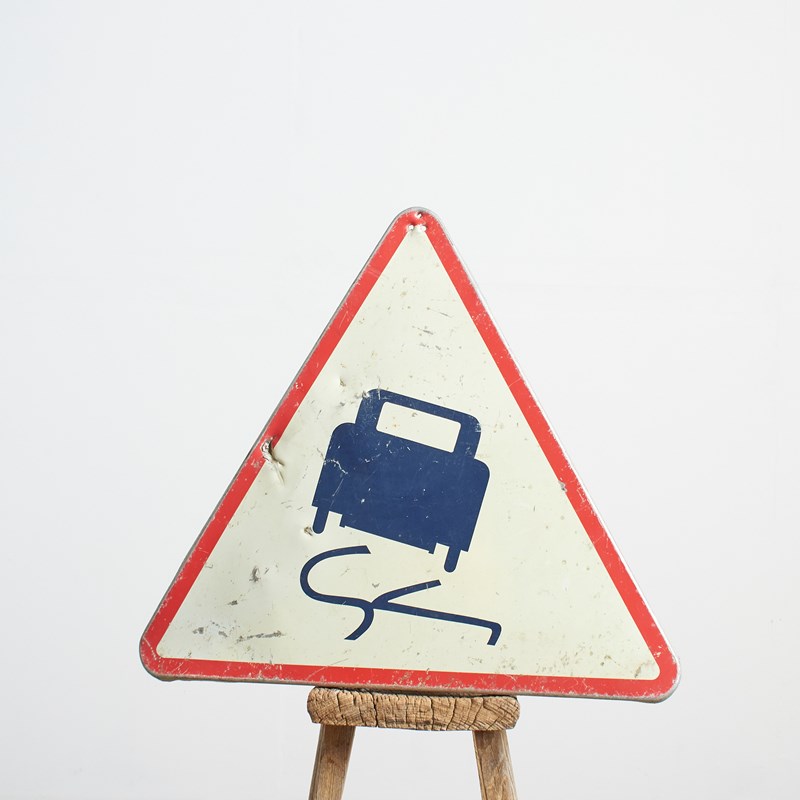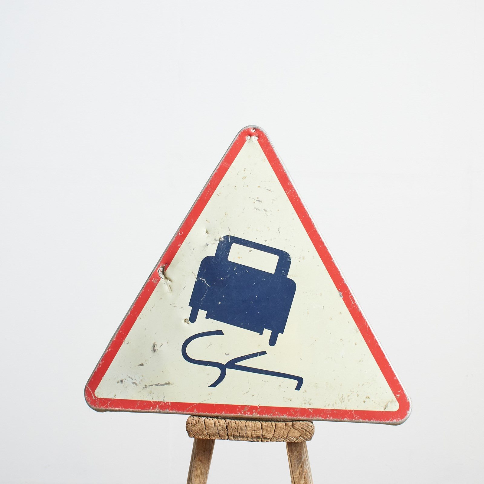 A fabulous original road safety sign salvaged from France to warn of slippery/bendy roads ahead.