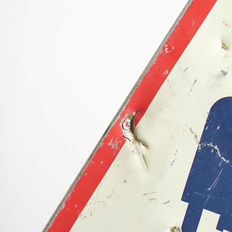 Workshop Report: The sign is structurally sound, some markings and denting to the metal in places- see photos. The metal has been waxed for future protection.