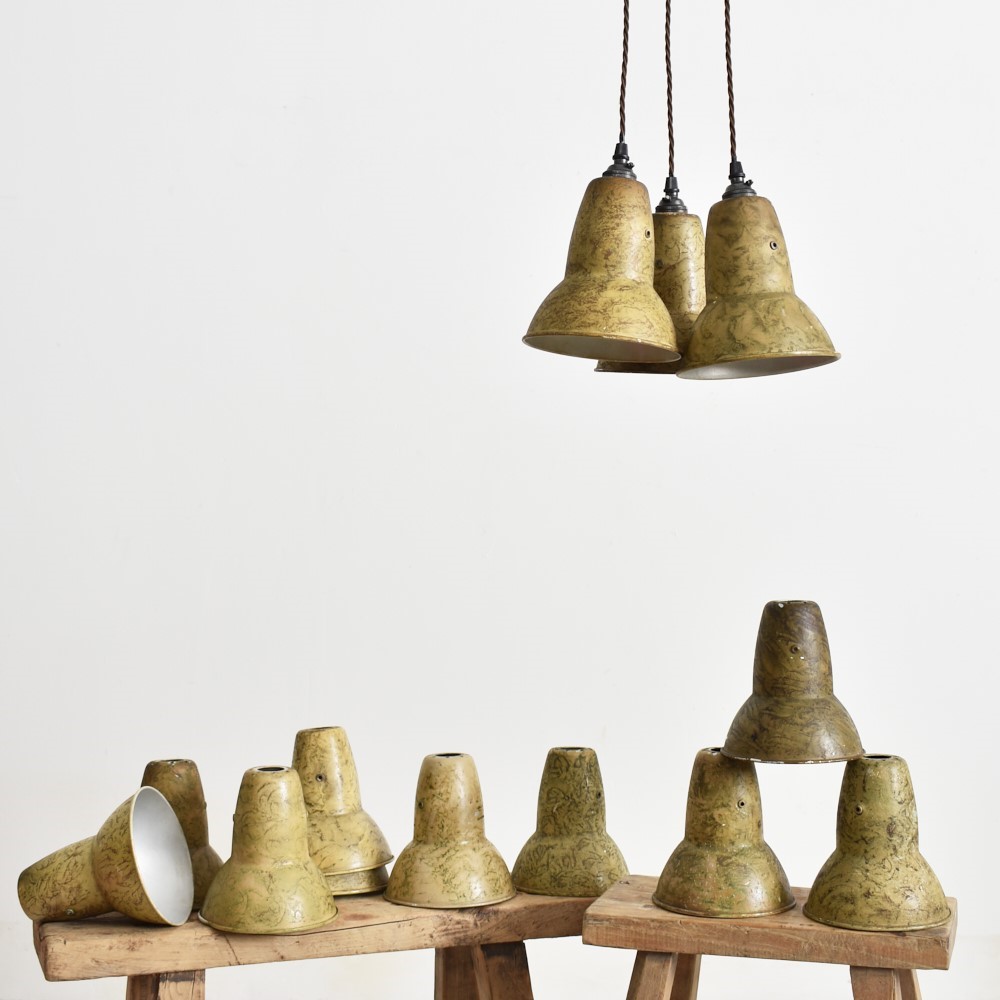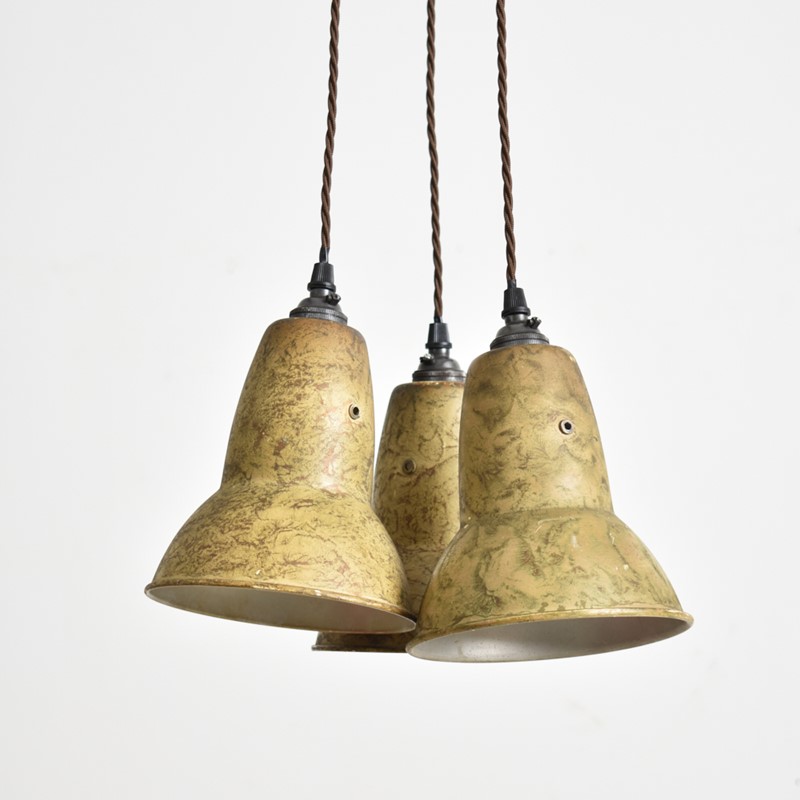 Original Herbert Terry Anglepoise Pendant Light – Scumbled An lampshade which would have originally been on a 1227 Model 2 Step Anglepoise desk lamp designed by Herbert Terry. The lampshade is made from aluminium with vent holes at a the top and a rolled edge at the base. The shade still retains a mounting hole on either side for the arm connections. The shade is painted in its original scumbled paint finish. These shades look great either hung alone or in a group. Origin: Lighting Engineers Workshop, London, UK Circa: 1940s Workshop Report: Overall Good Vintage, lights are supplied with 1.5m of brown twisted fabric flex and dark brass CE certified bc22 bayonet lampholder. Lights can take up to 100W Equivalent LED bulb. As with all our products, This product is an original vintage item so there are signs of wear from use. Additional Info: Price is for one light, we advise all lighting is installed by a qualified electrician. Shipping: Will be Shipped by Parcel, 3-5 days, Rate is for England only please contact us for other destinations.