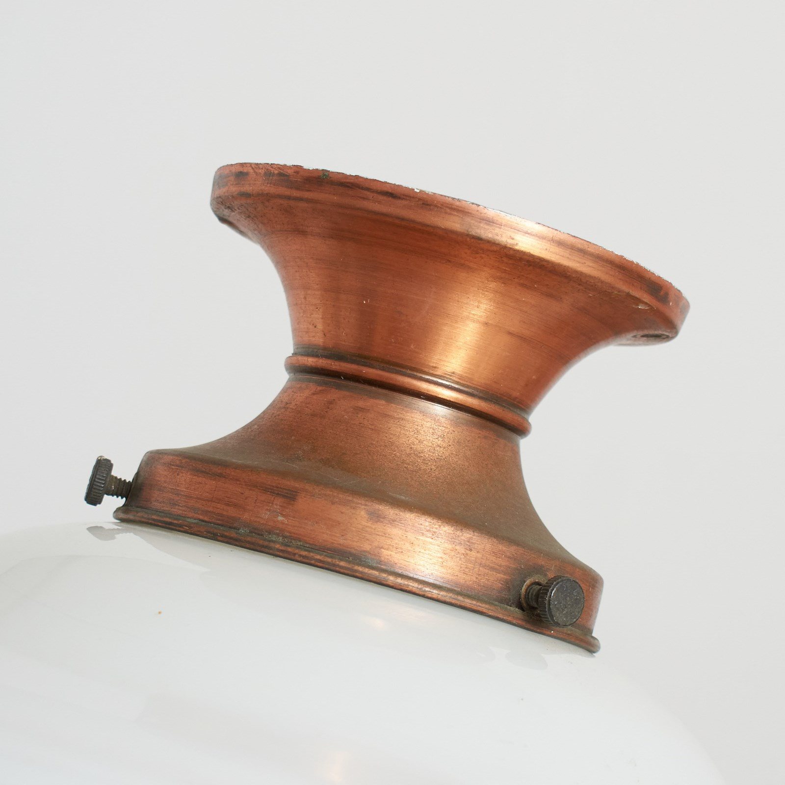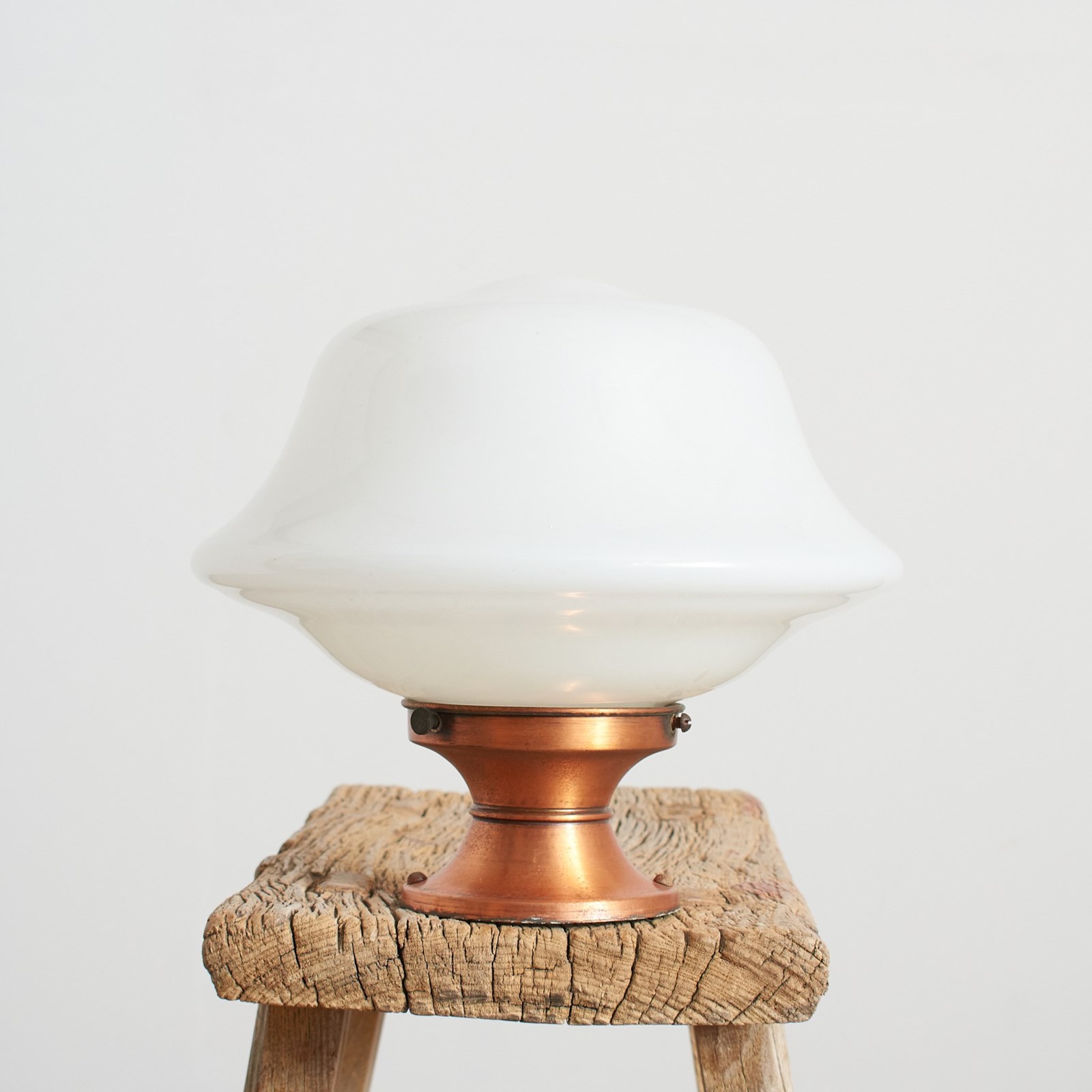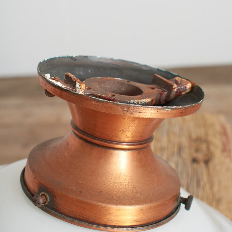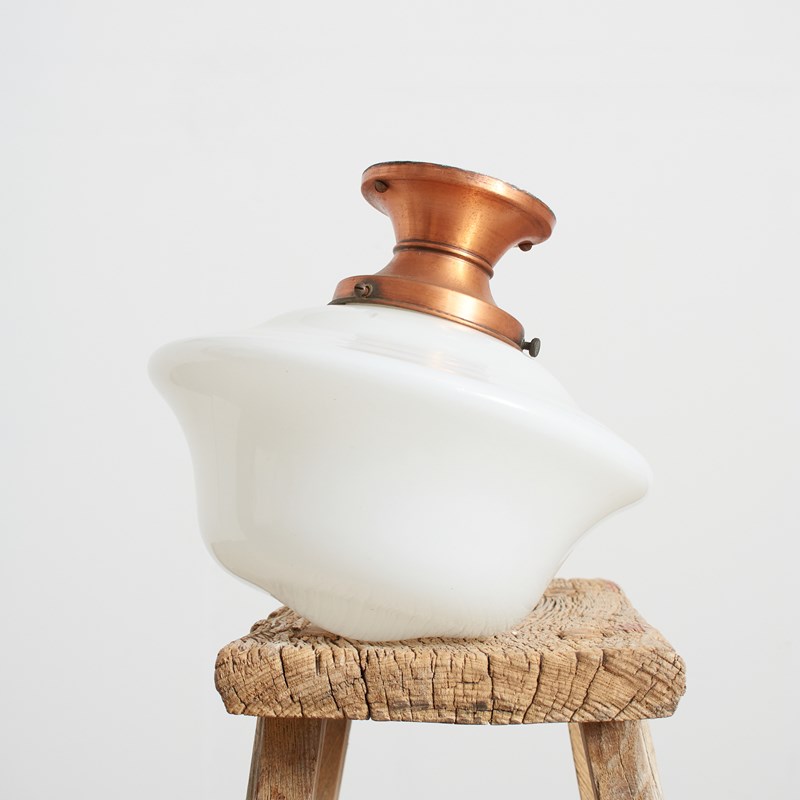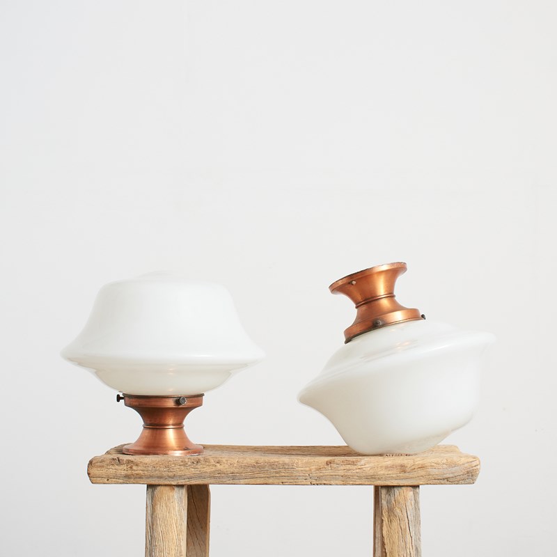 A pair of original opaline glass ceiling lights. The lights have a shapely milk glass opaline shade and retain their original coppered ceiling galleries. The stepped brass gallery finish has been left untouched and are in original condition.