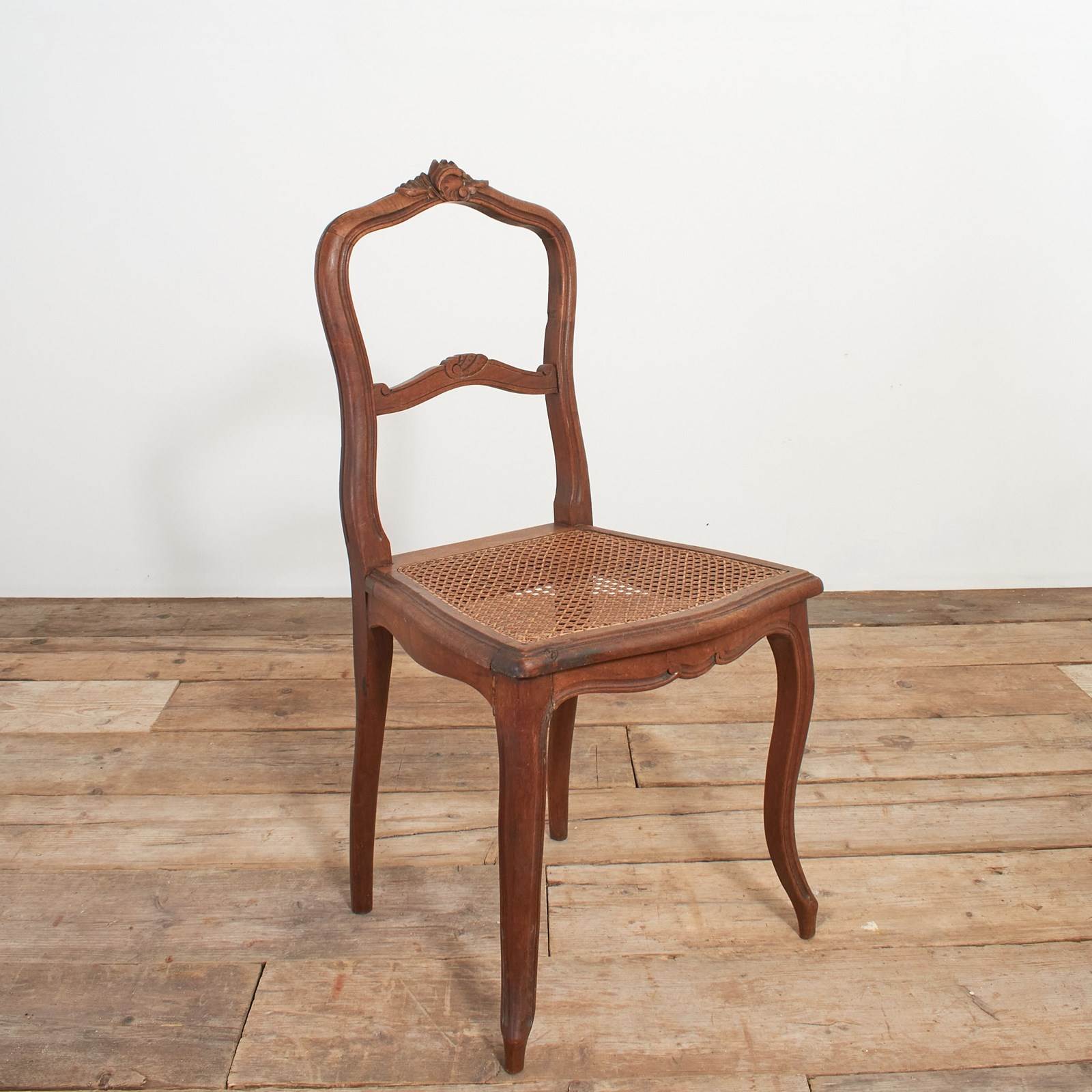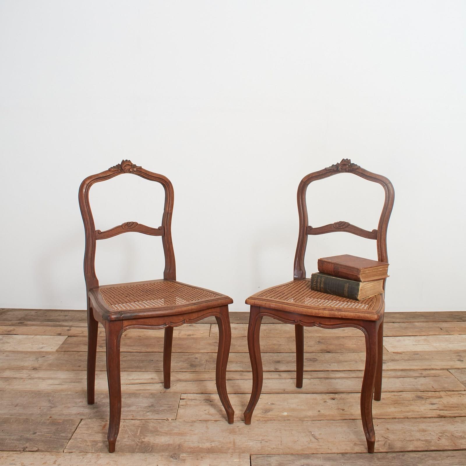 A pair of beautiful carved French chairs with cane seats. They have a pretty decorative detail in the back rests and elegantly splayed out front legs. They are in good condition for their age and are ideal as occasional use chairs in a bedroom.