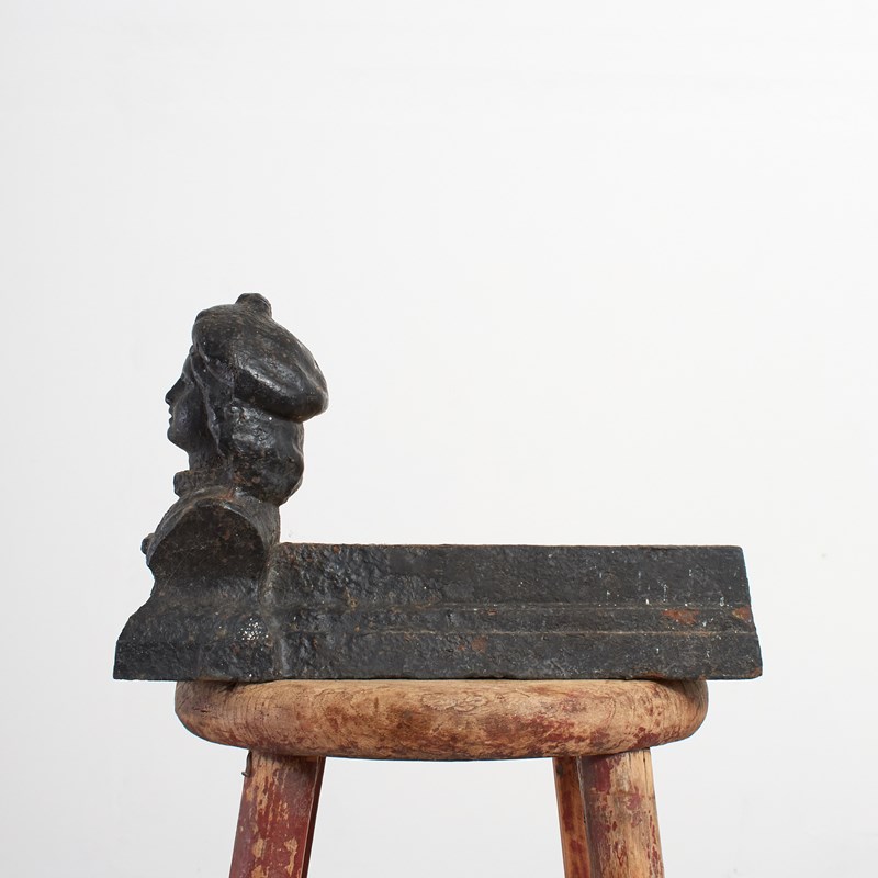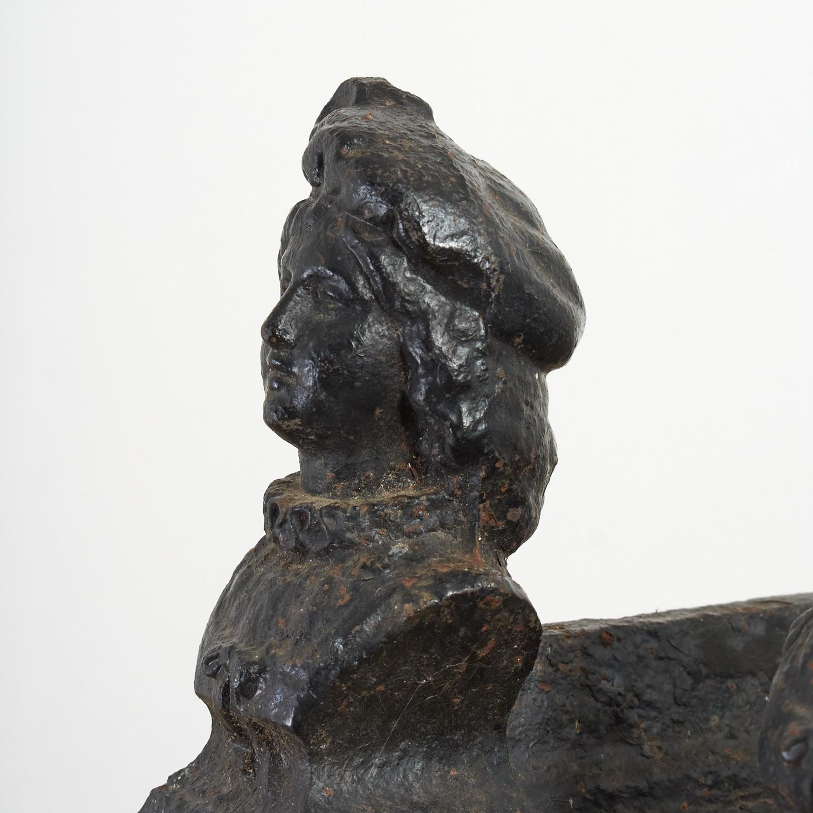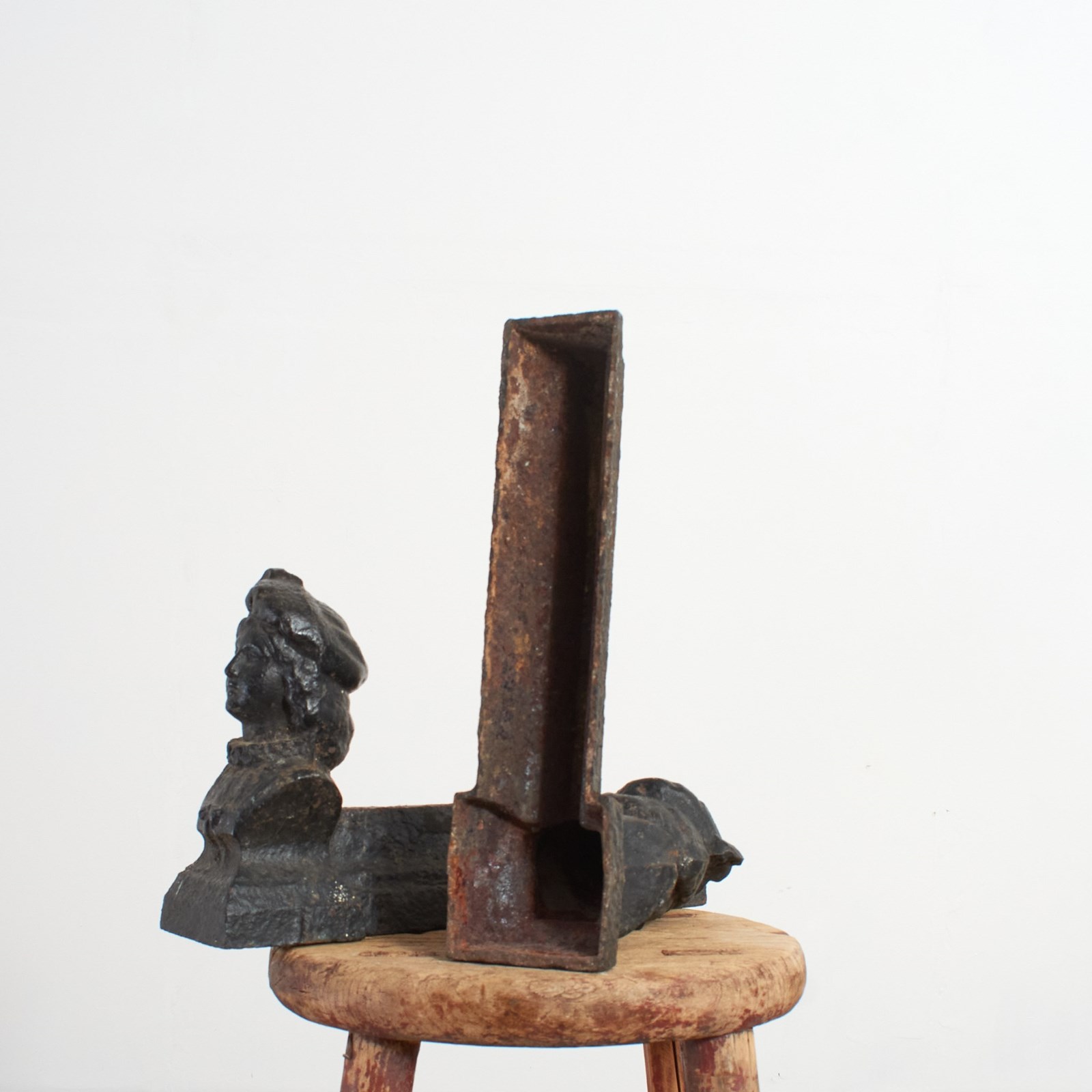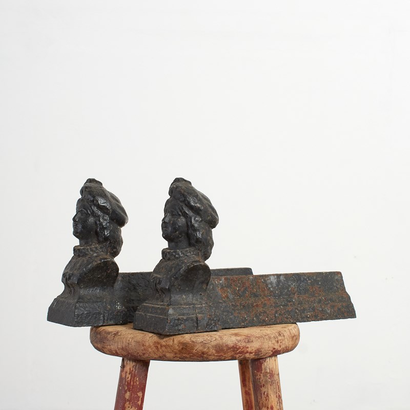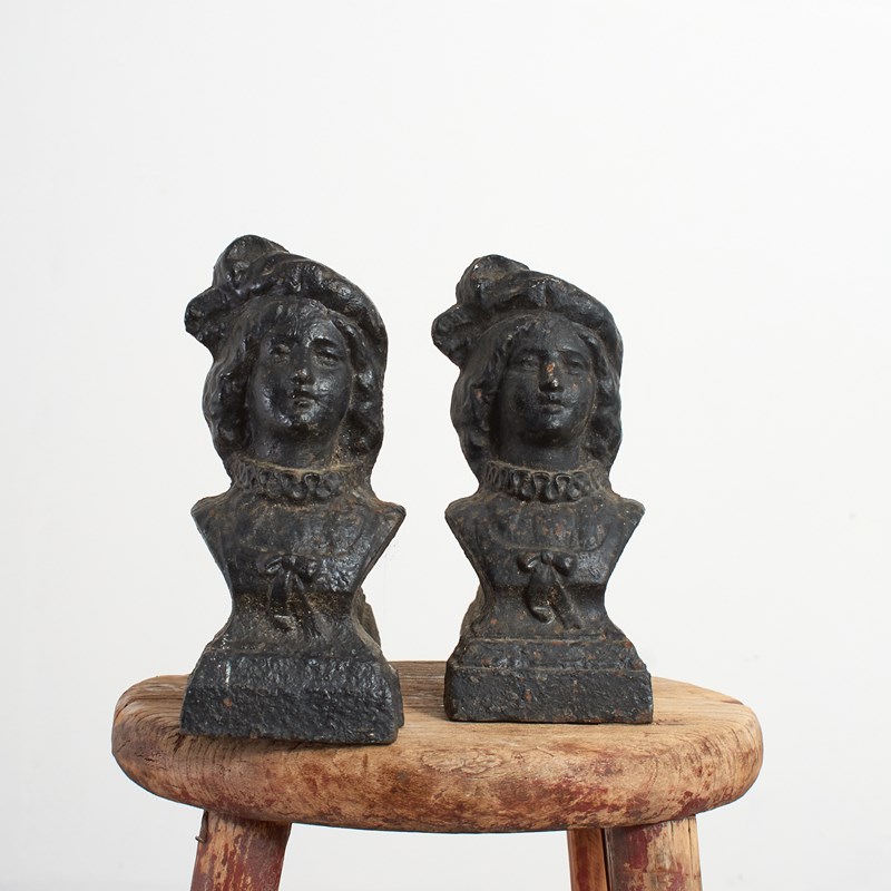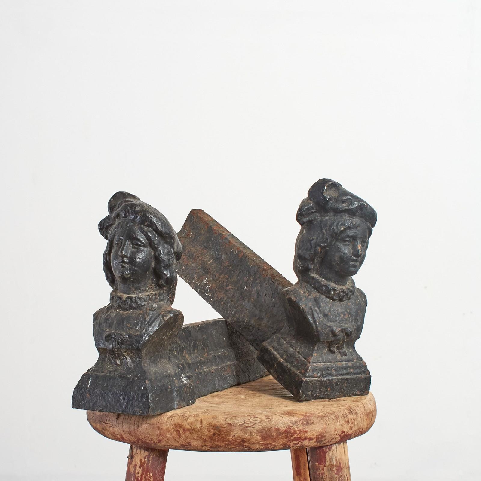 A pair of stunning decorative cast iron fire dogs depicting a young woman with hat on. Lovely decorative detail on the face and dress neckline. These would make a charming addition to a fireside or as a standalone decorative piece around the home.