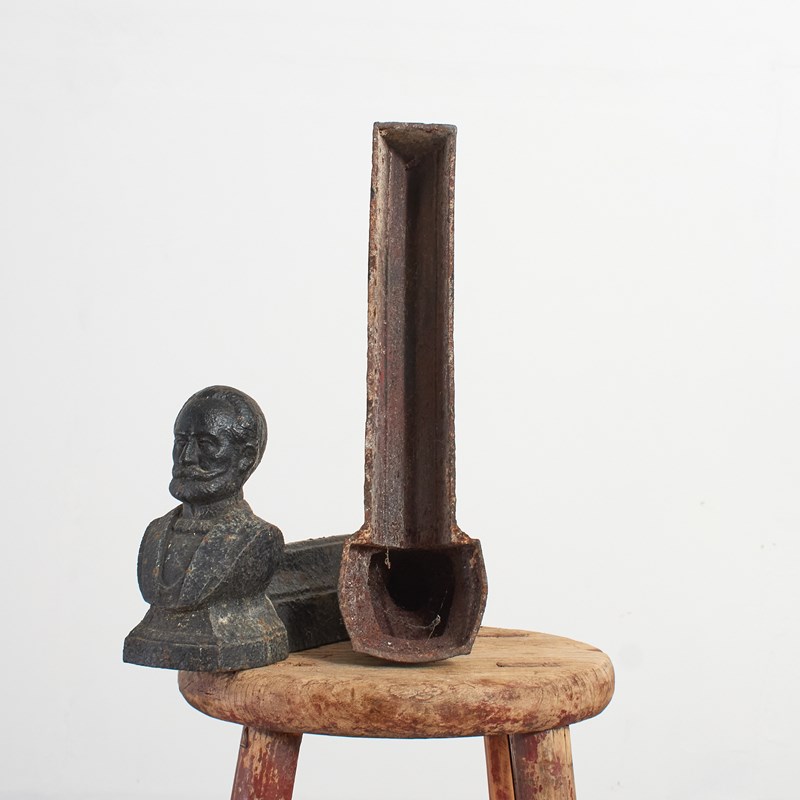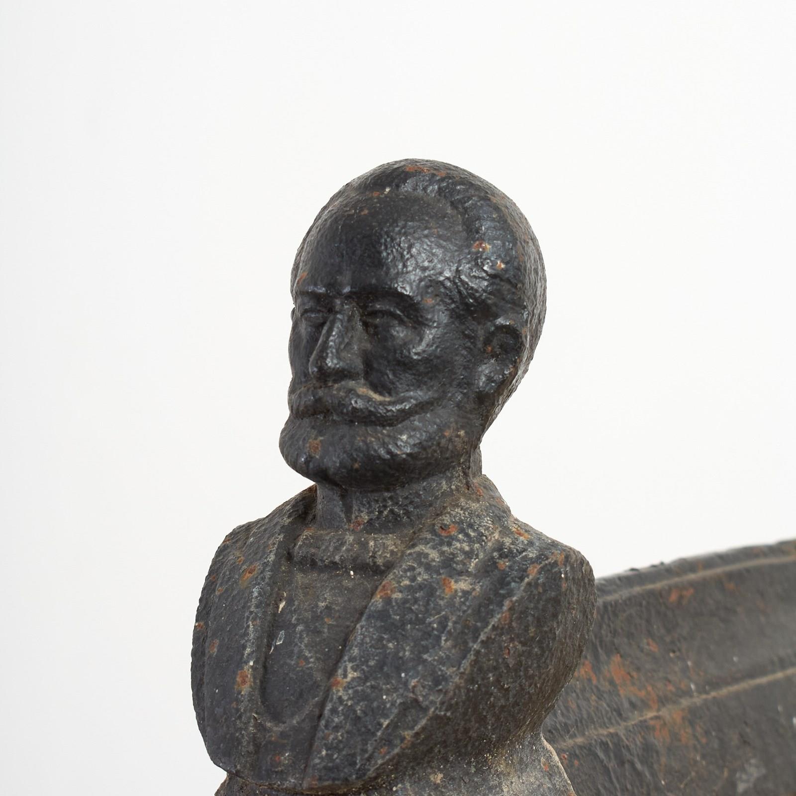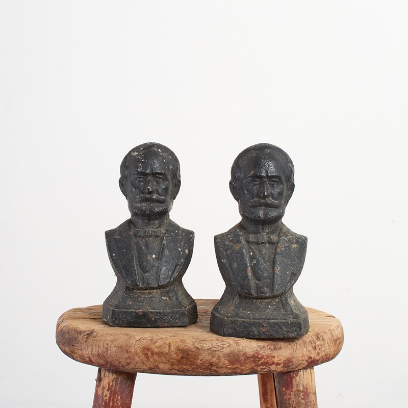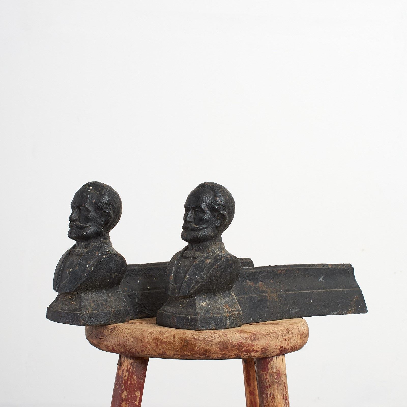 A pair of stunning decorative cast iron fire dogs depicting the bust of a man. Lovely decorative detail to the face and dinner jacket/uniform. These would make a charming addition to a fireside or as a standalone decorative piece around the home.