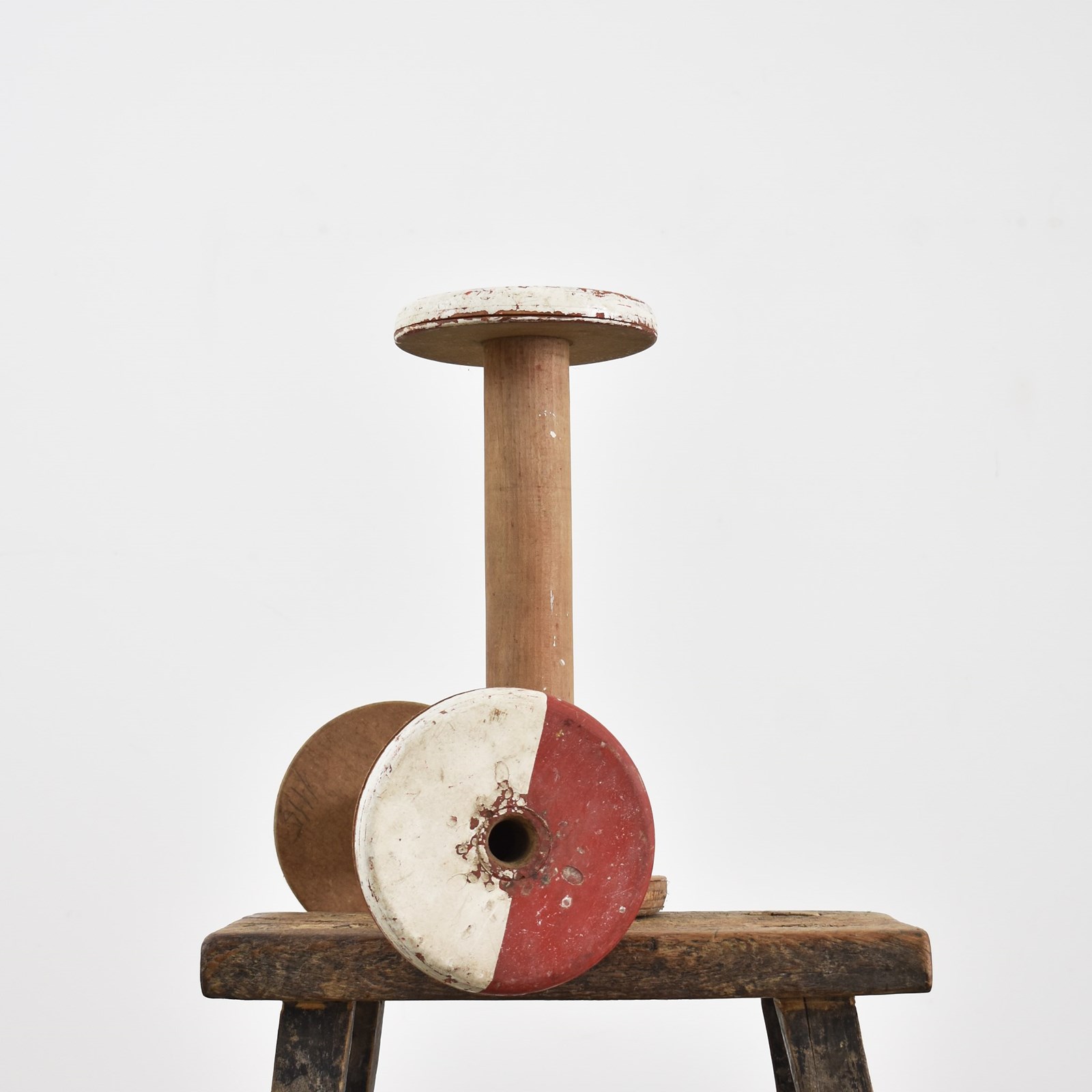 A pair large wooden antique bobbins with red and white paint at the top end end. Salvaged from a disused Belgium factory, These would make a lovely textile prop in a shop or home environment.
