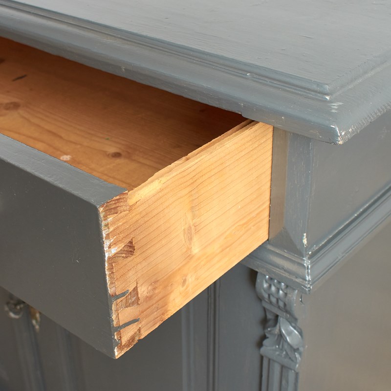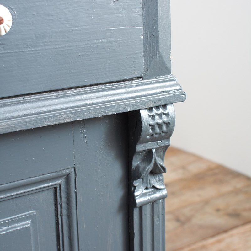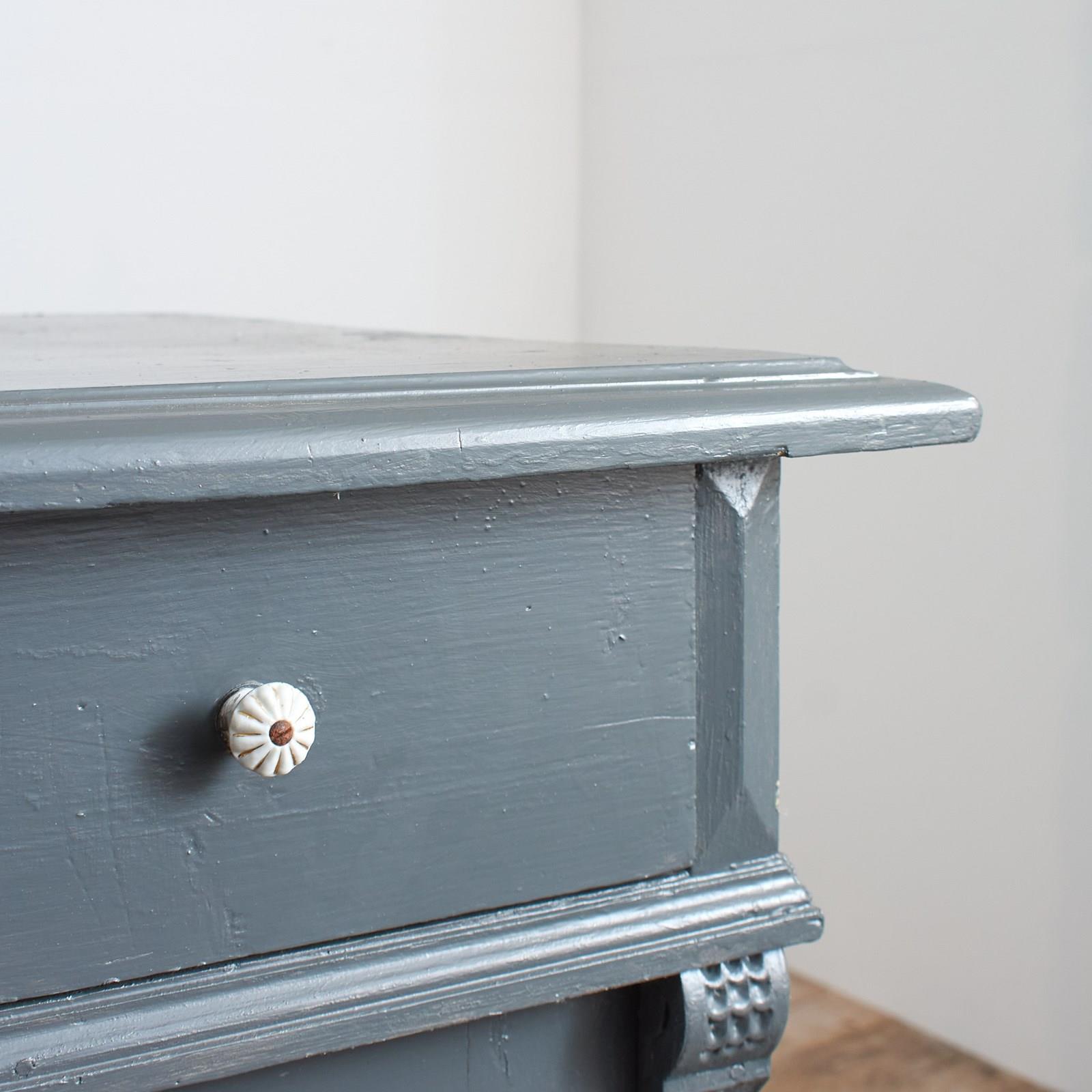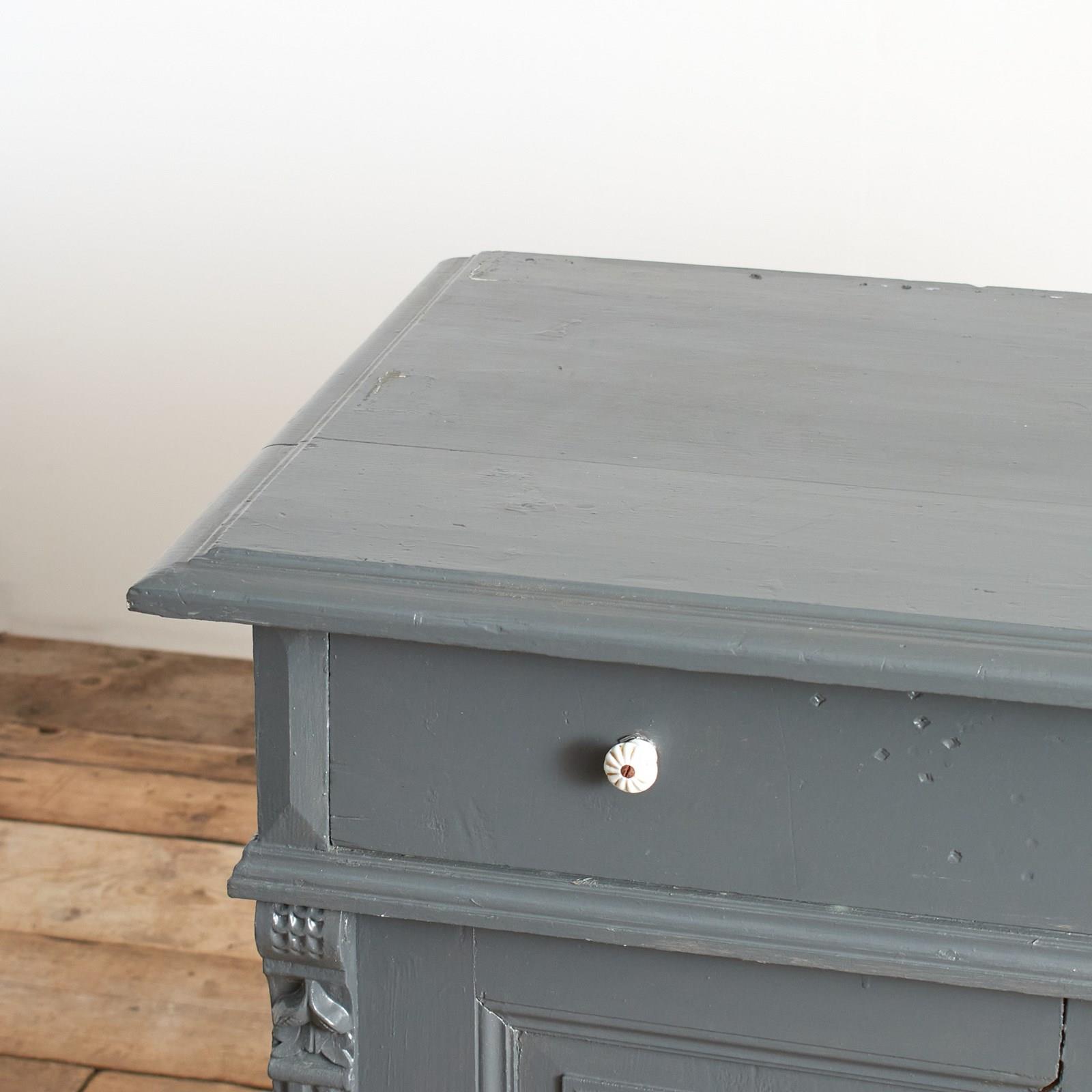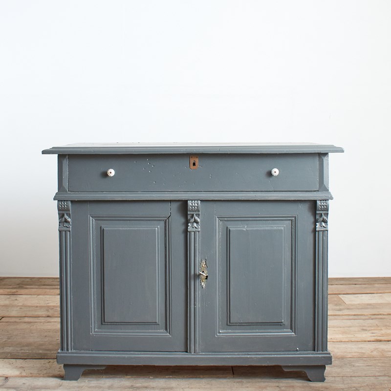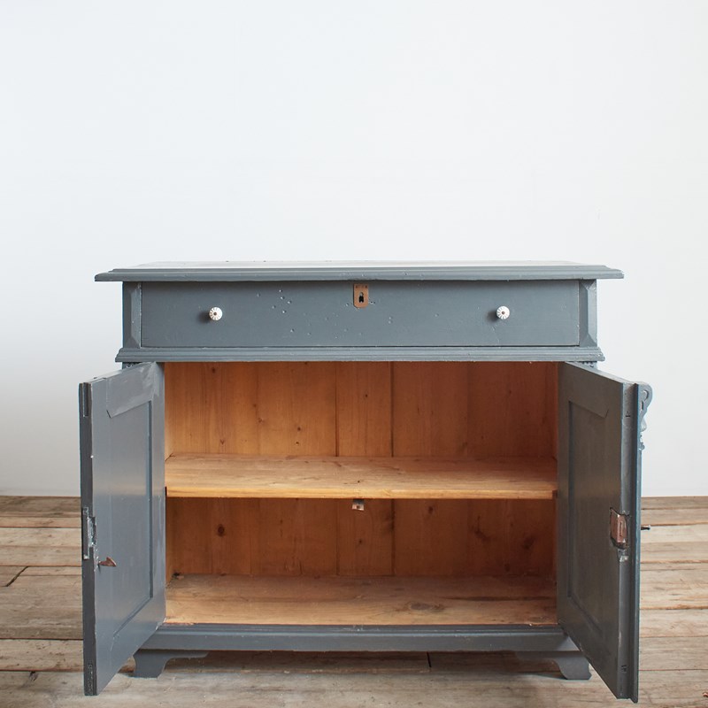 A lovely pine kitchen sideboard which has been historically painted in charcoal grey. A practical piece with drawer and cupboard (with one shelf) for in the home or in a cafe environment.