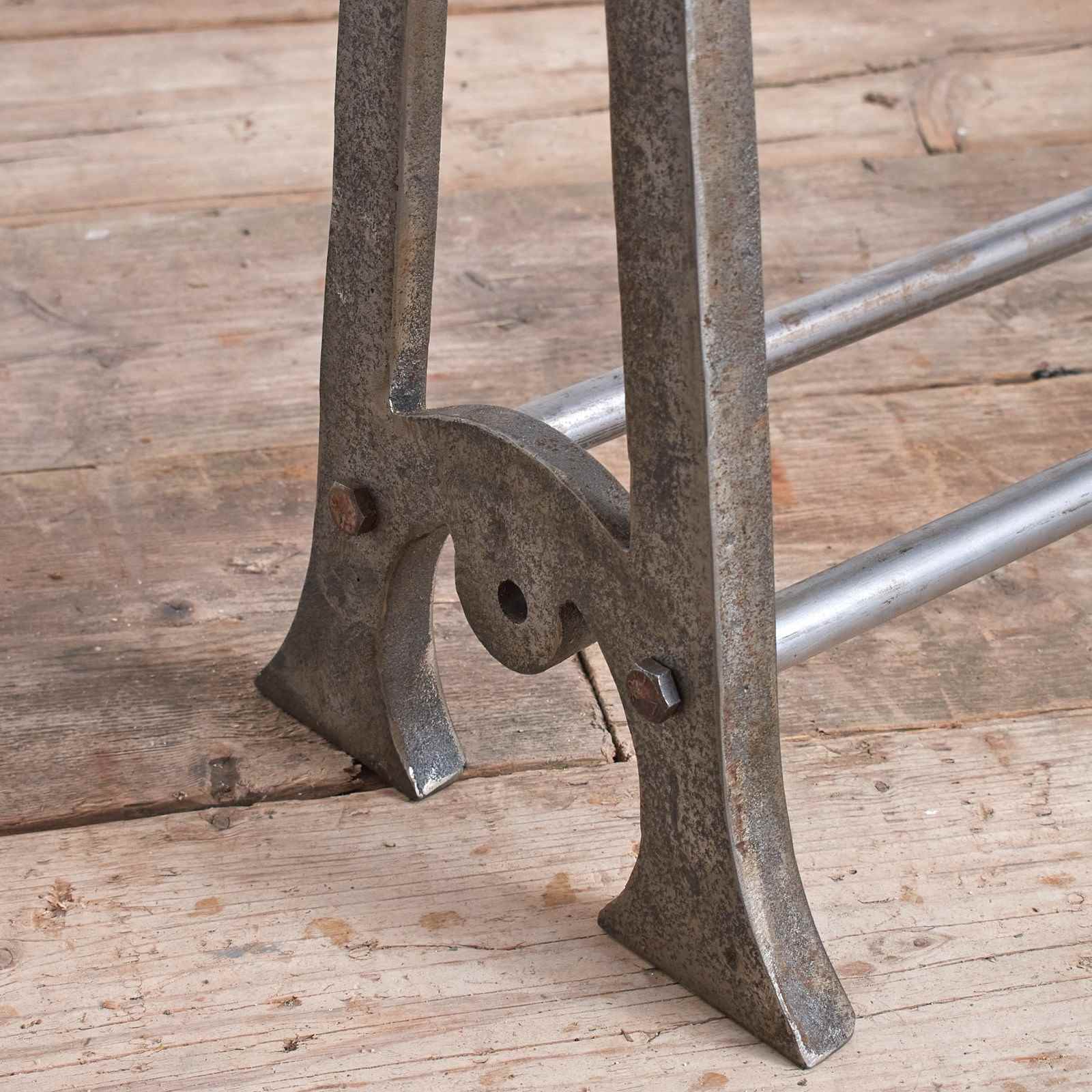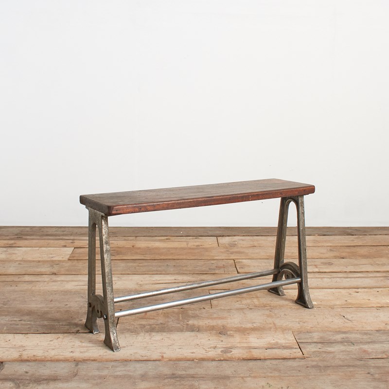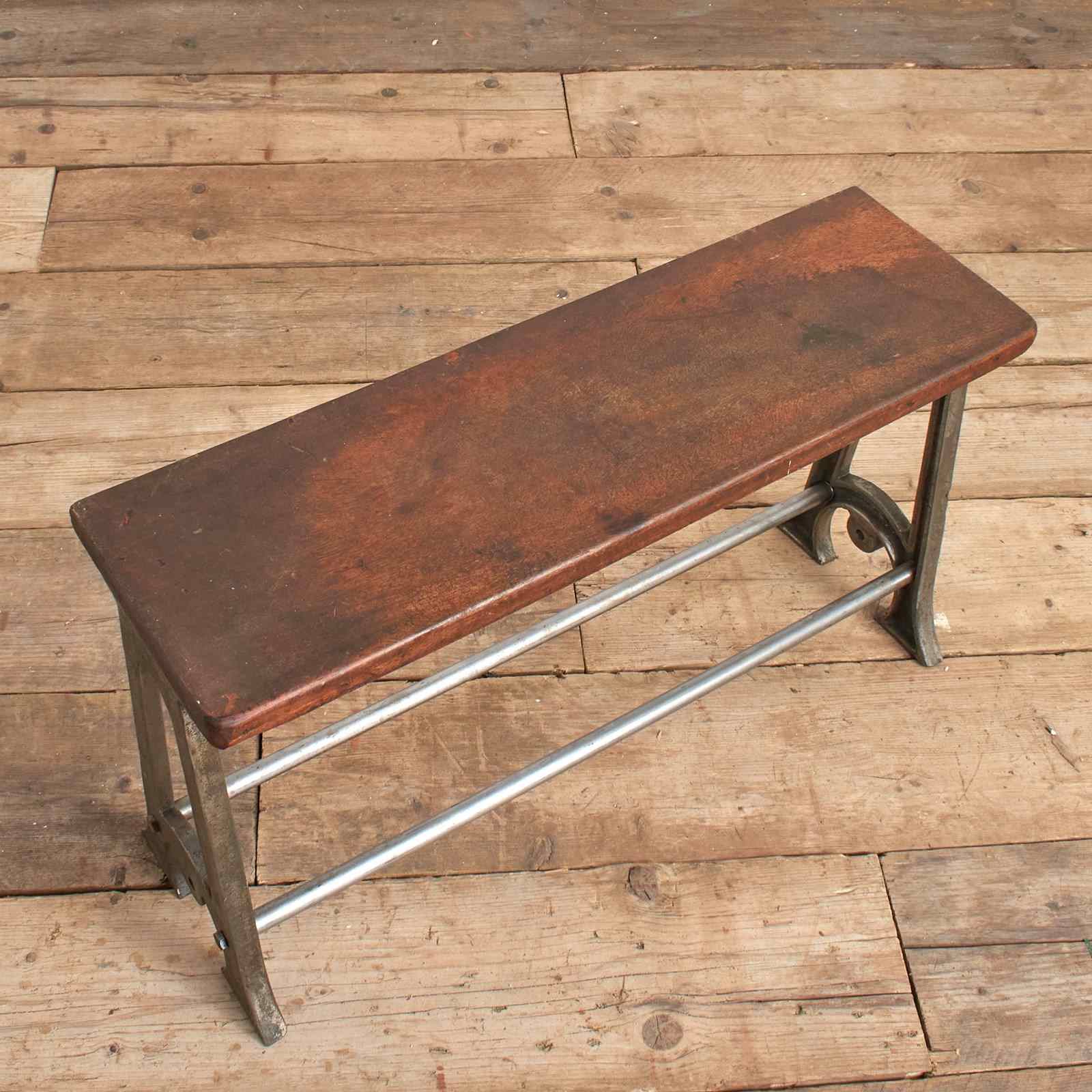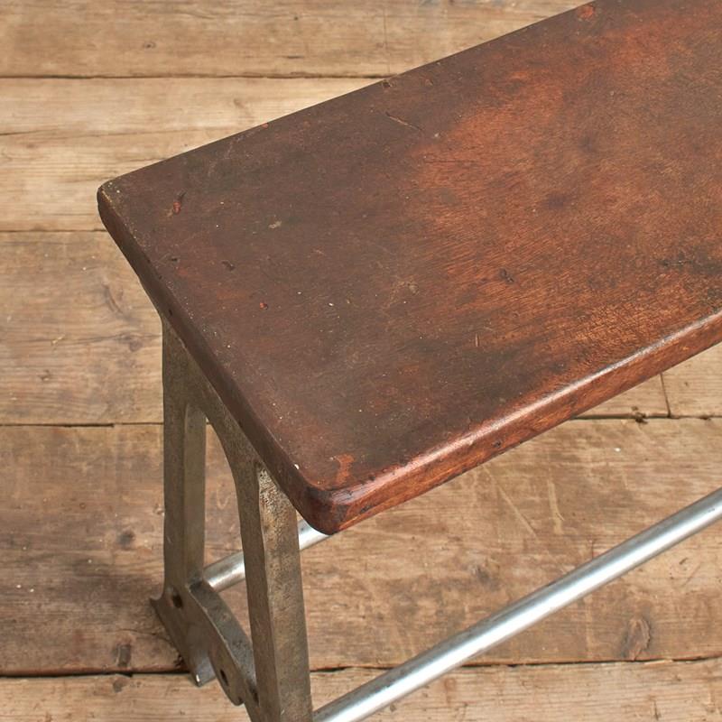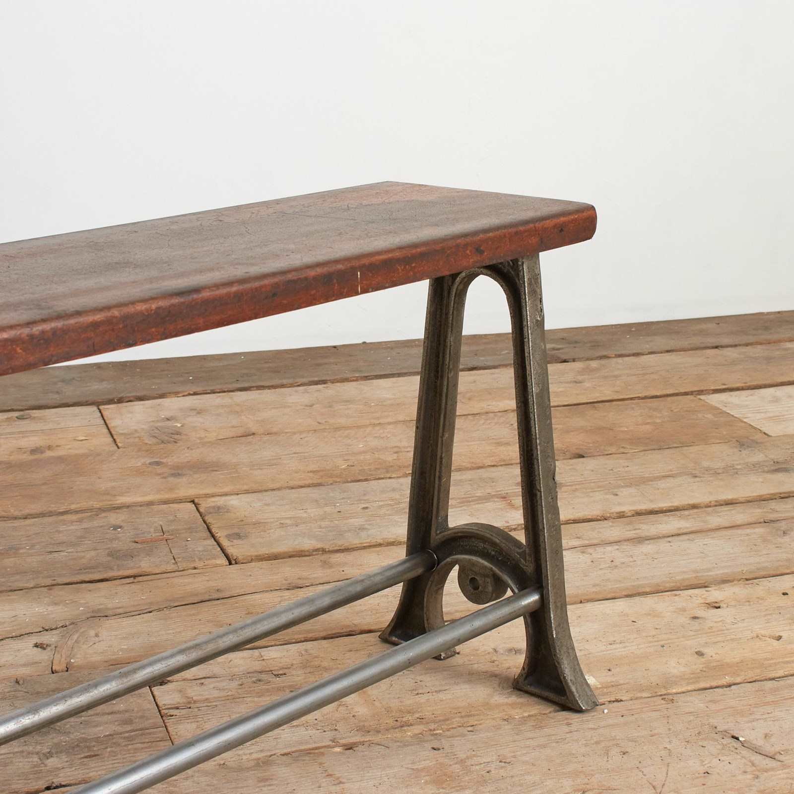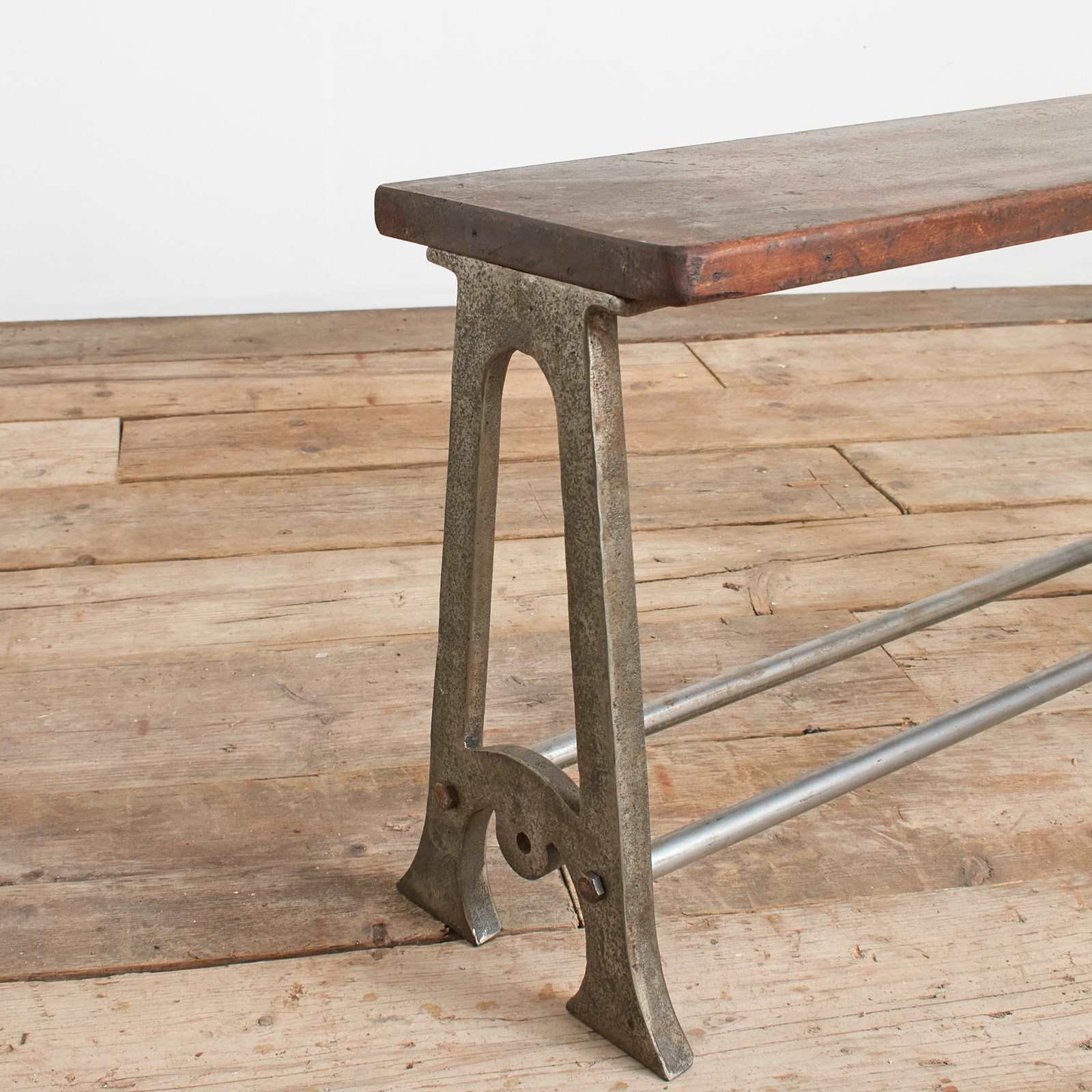 A School Locker Room Bench, with a lovely original hardwood wooden top salvaged from a Grammar school. The bench has cast metal legs and a pair of metal stretcher rods serving as a lower shelf.