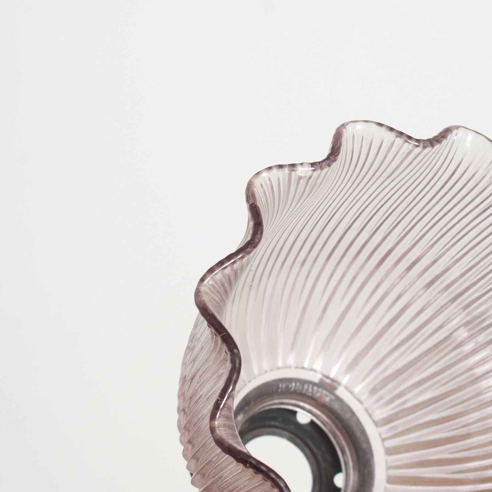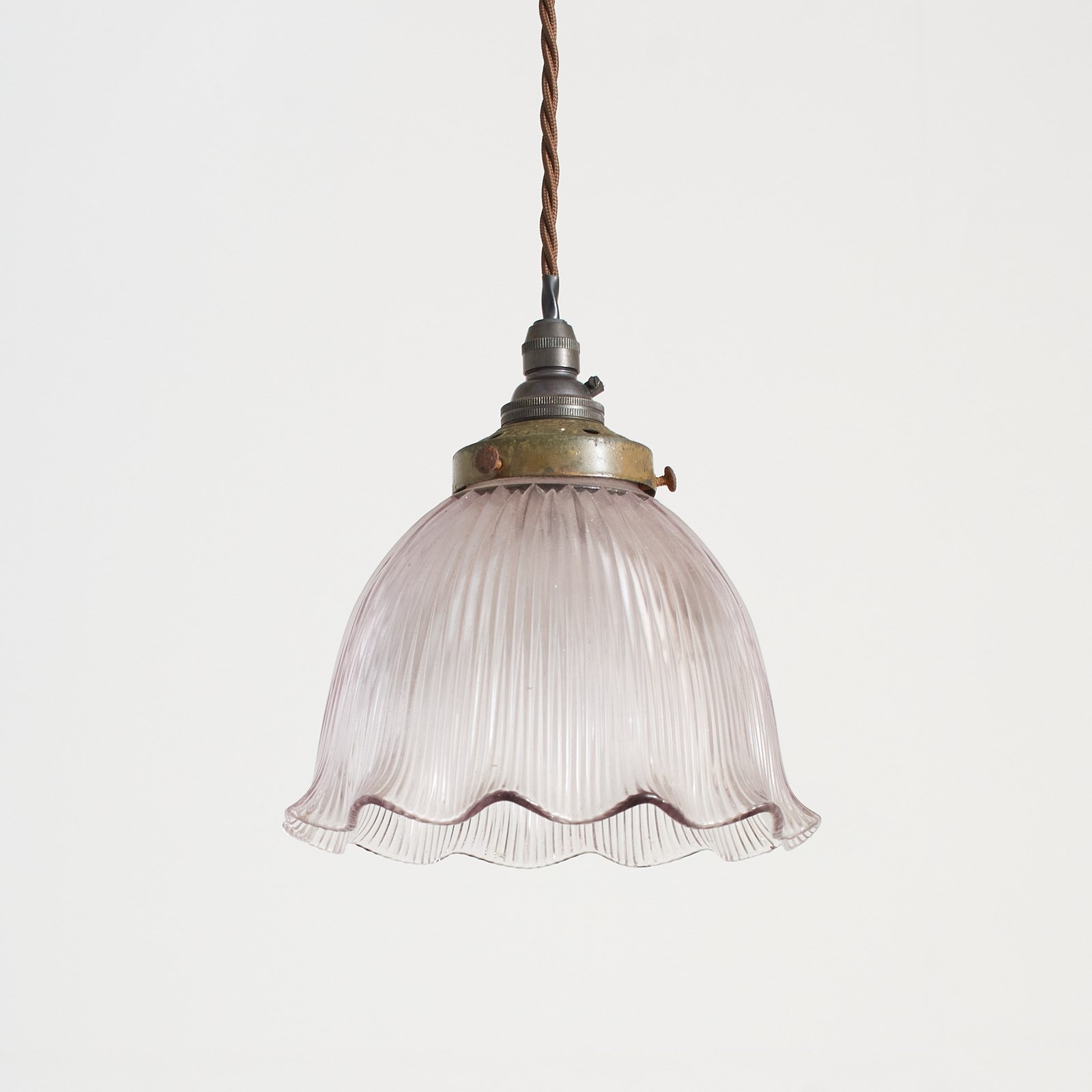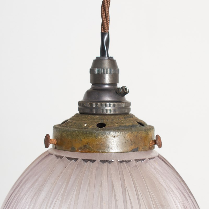 A set of 3 vintage bell shaped Holophane glass prismatic pendant light shades. The lights have retained their original brass galleries, which have some great age and patina. The prismatic glass of the shades have the scarcer very subtle lilac tint giving the lights a unique finish.