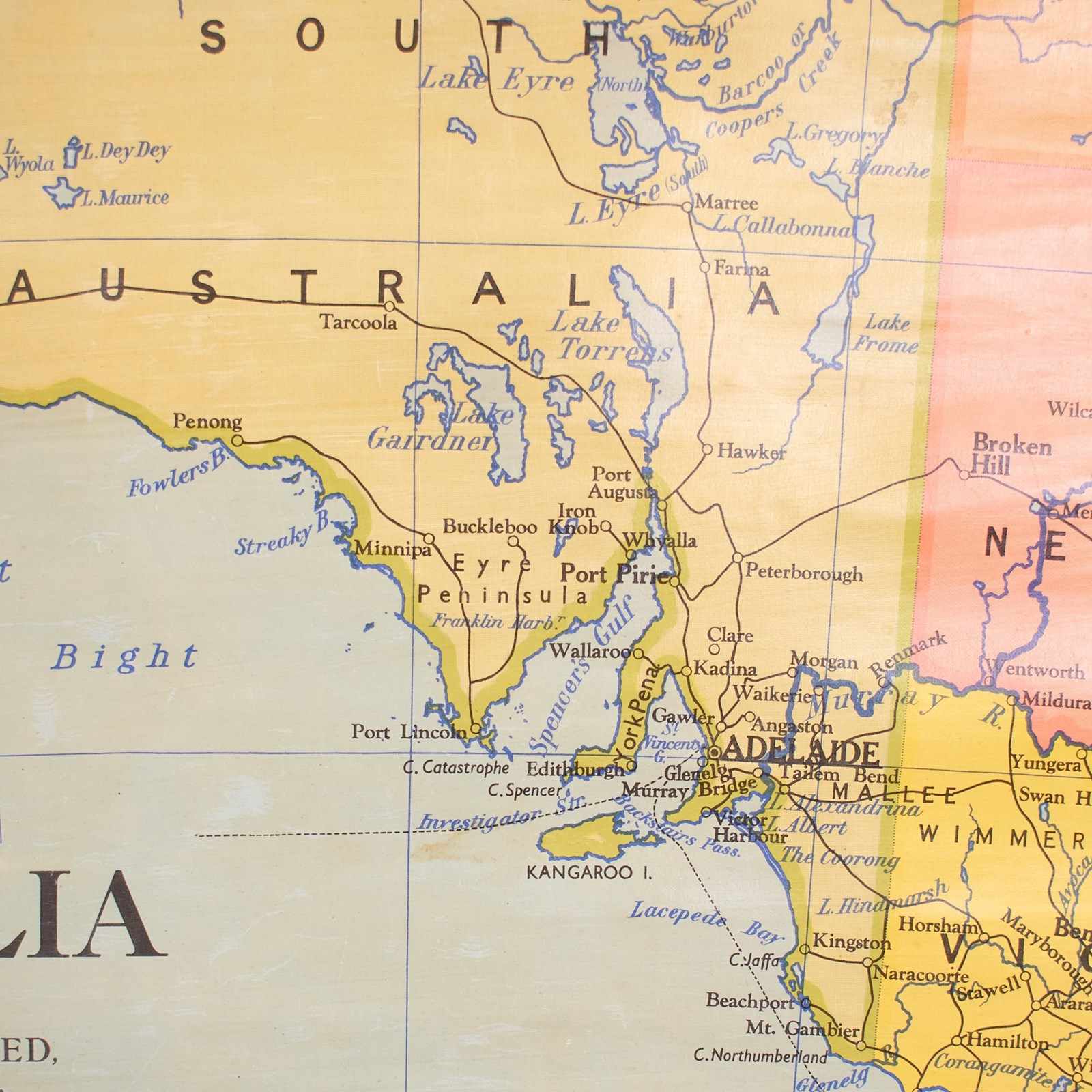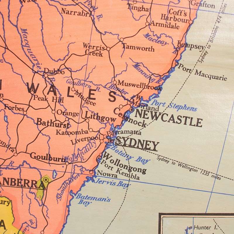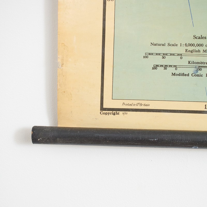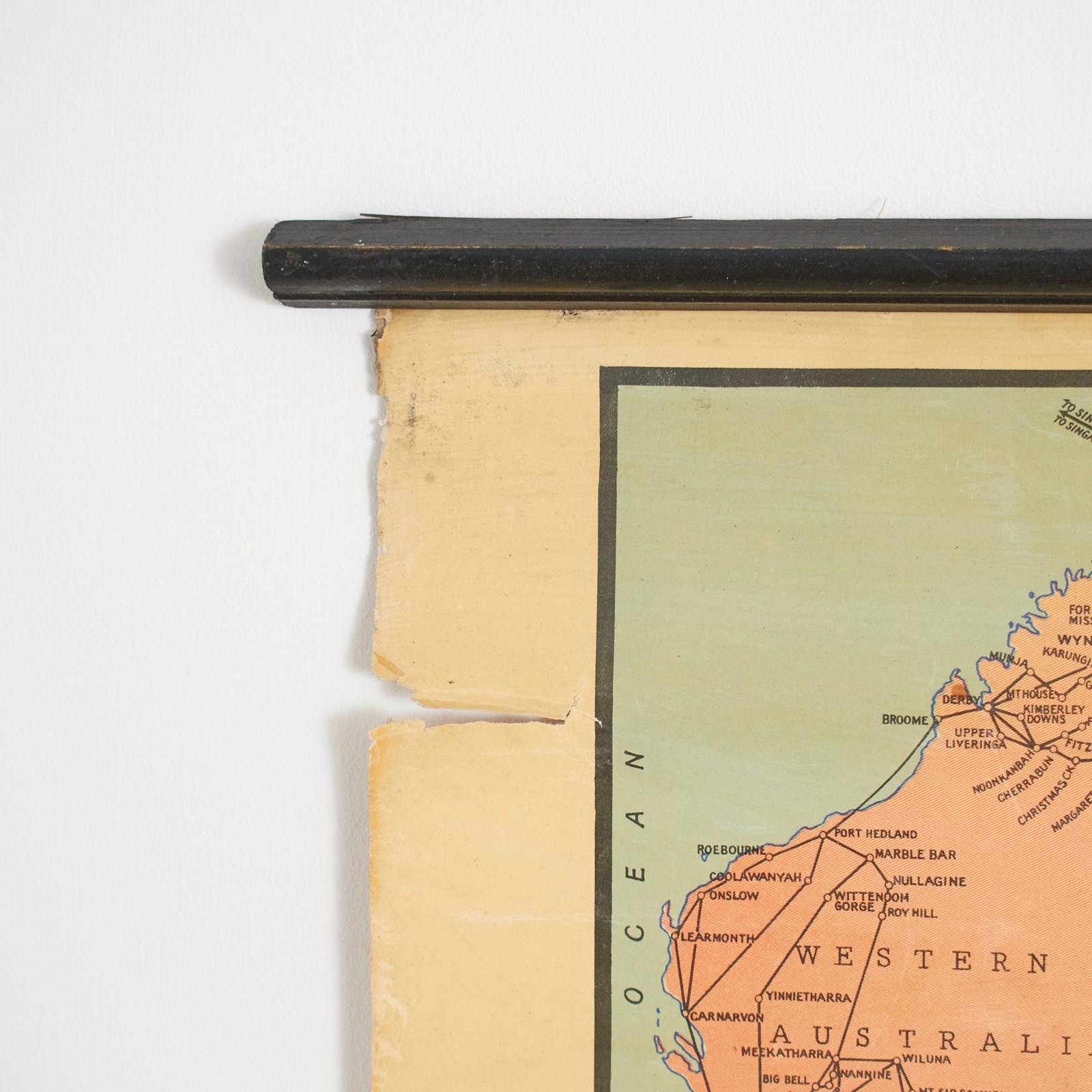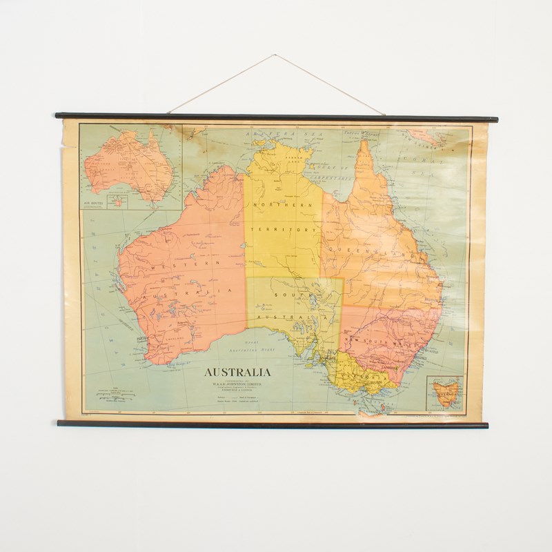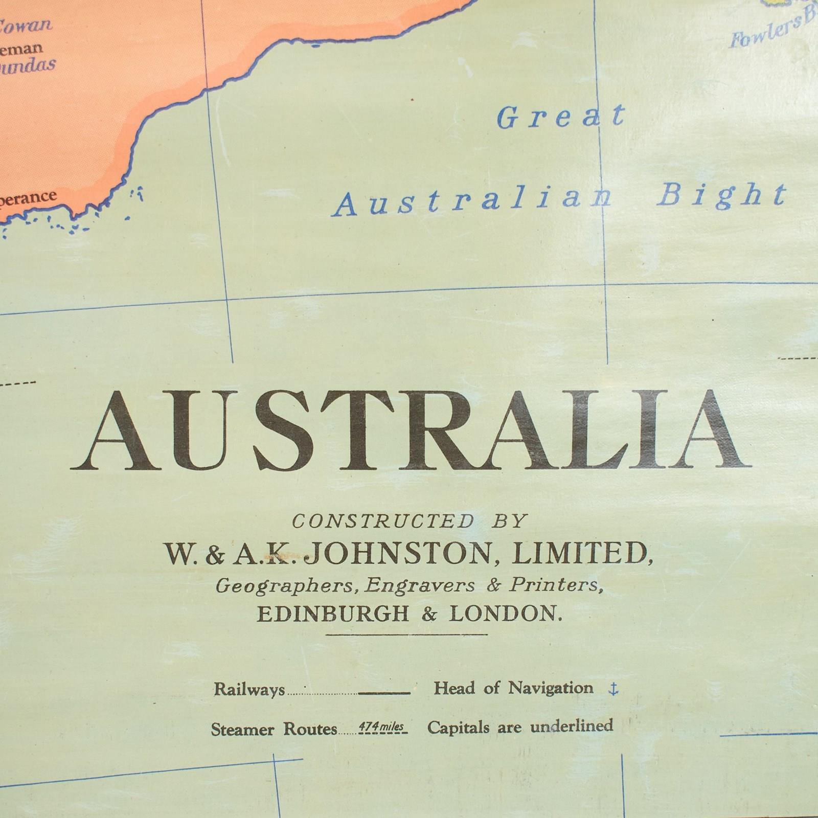 A vintage school pull down wall map of Australia. The map has a wooden hanging pole at the top and bottom. The map is manufactured by the renown Scottish map maker W. & A.K. Johnston. The map is dated 1952.