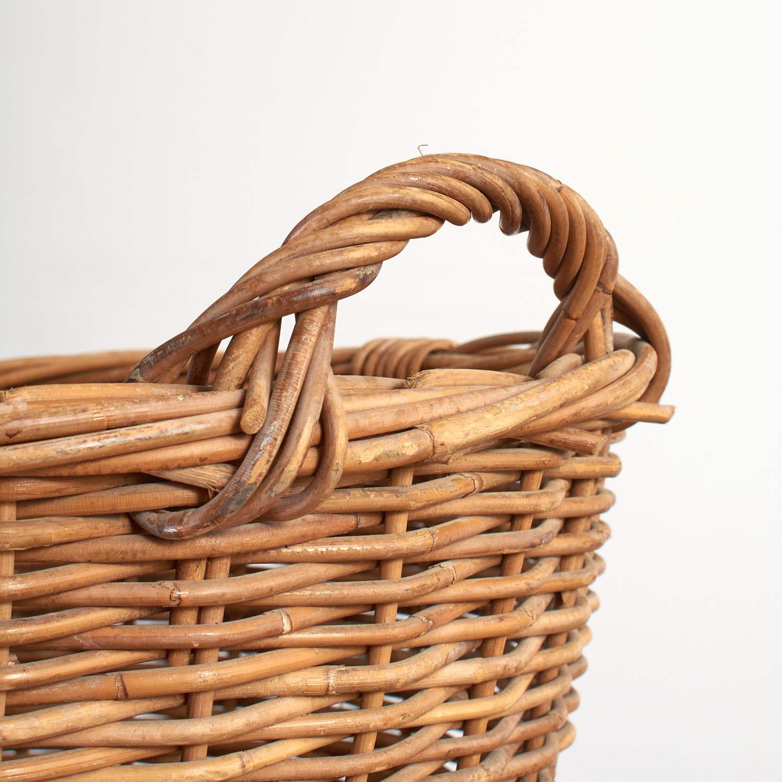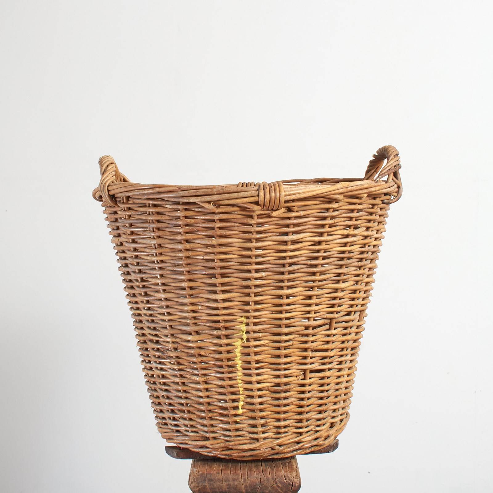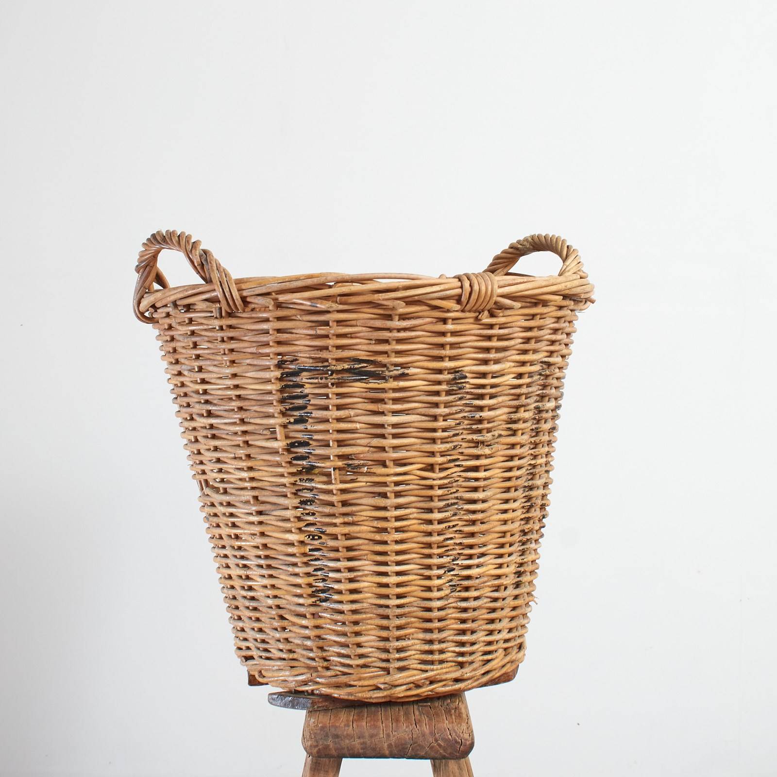 A beautiful hand-made wicker champagne basket from France used to harvest grapes in the champagne region of France. The markings on the side identify the grower and vineyard it belonged to. Two wooden base runners give extra strength and manoeuvrability. It is sturdy and perfect for storing logs by the fire.