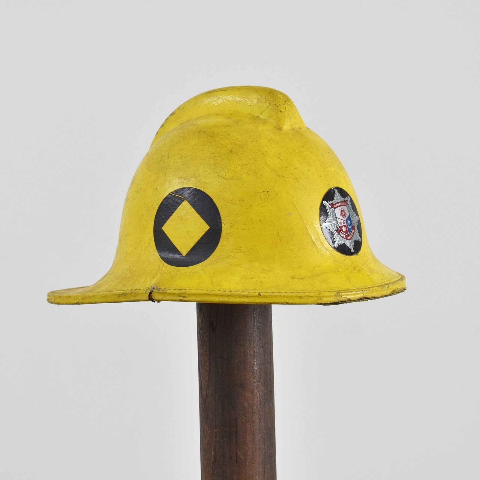 A fabulous vintage yellow fireman helmet. Stamped with the original Hampshire Fire brigade stamp on the front.